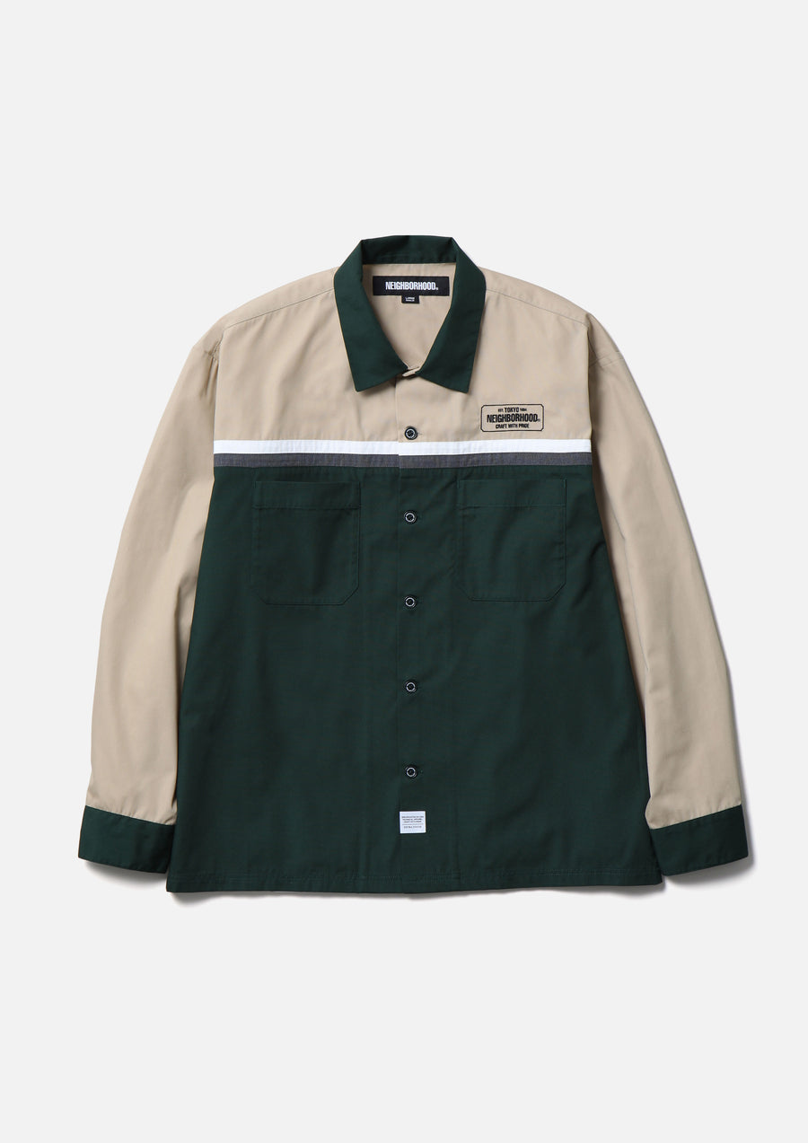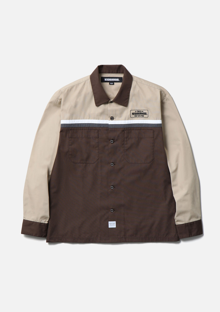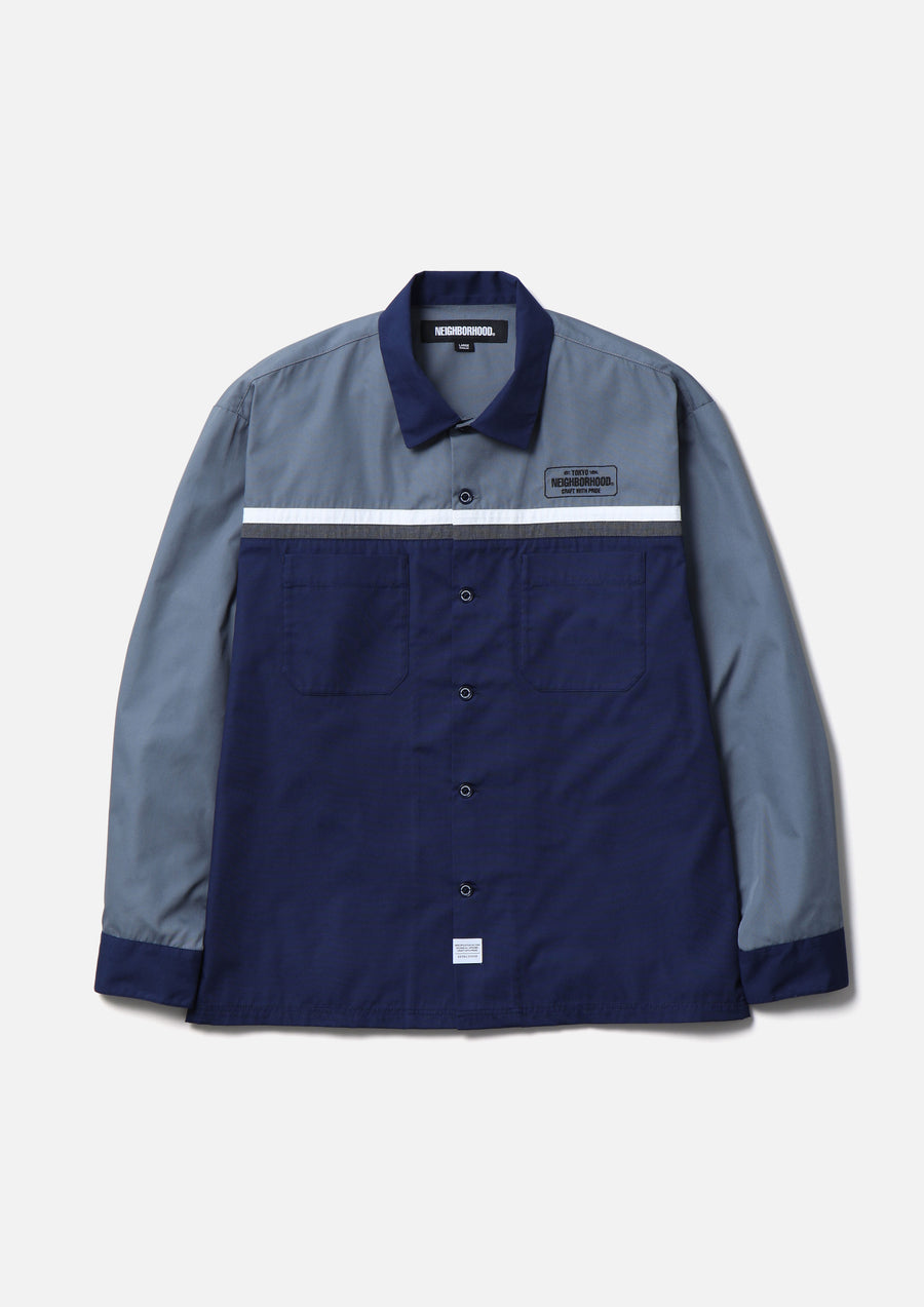 A work shirt made from a mid-weight polyester/cotton-blend poplin fabric. Resistant to wrinkles and offers both softness and a crisp feel. Features a two-tone panel design with matching chest line colors. Embroidered logo on the left chest and printed text on the back. Equipped with original four-hole buttons, a brand tag on the placket and side seam. One-wash finish.