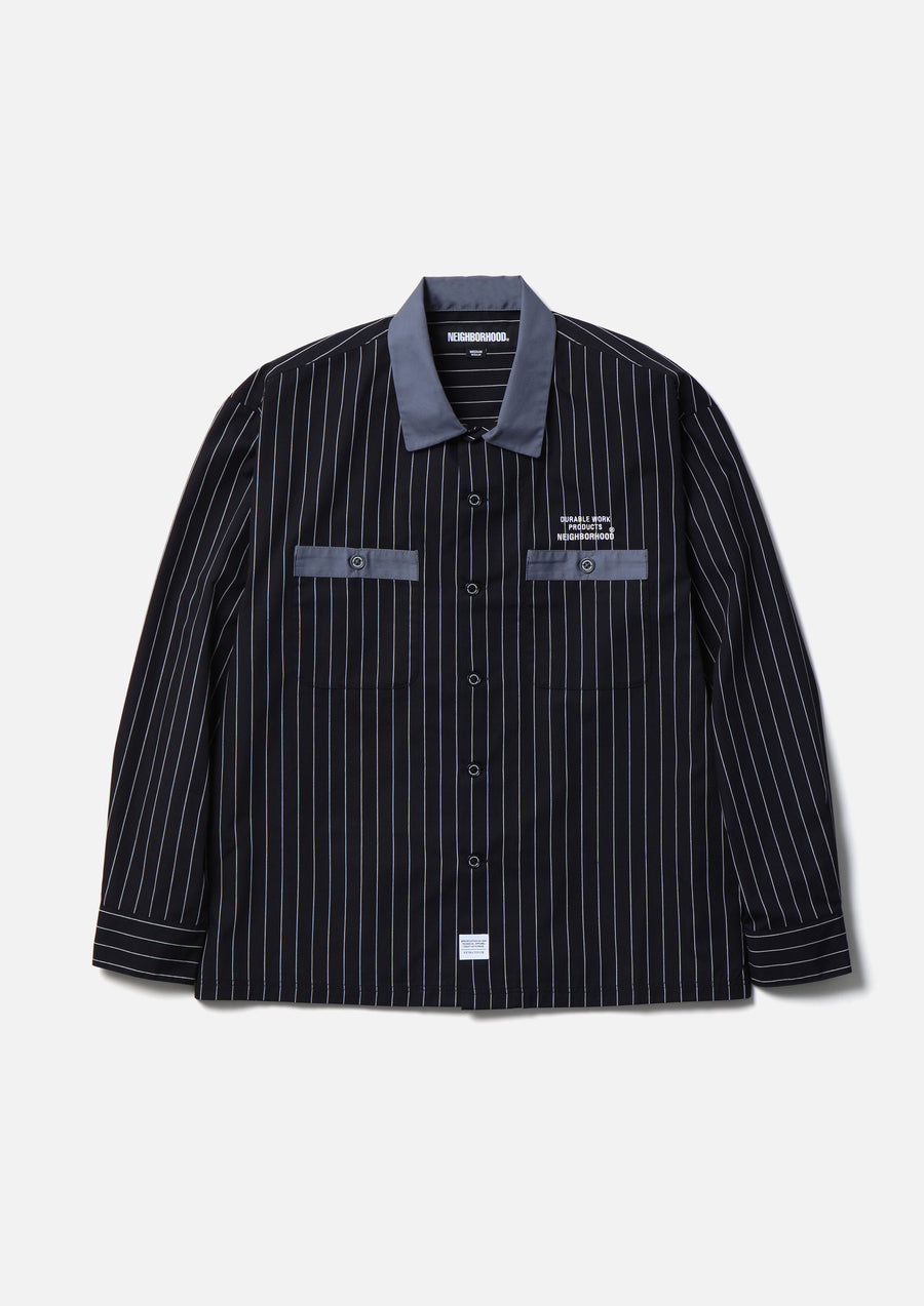 A work shirt made from striped fabric with a soft feel and easy-care polyester blend. Features a contrasting solid fabric on the collar and pocket. Embroidered logo on the left chest. Equipped with original four-hole buttons, a brand tag on the placket and side seam. One-wash finish.