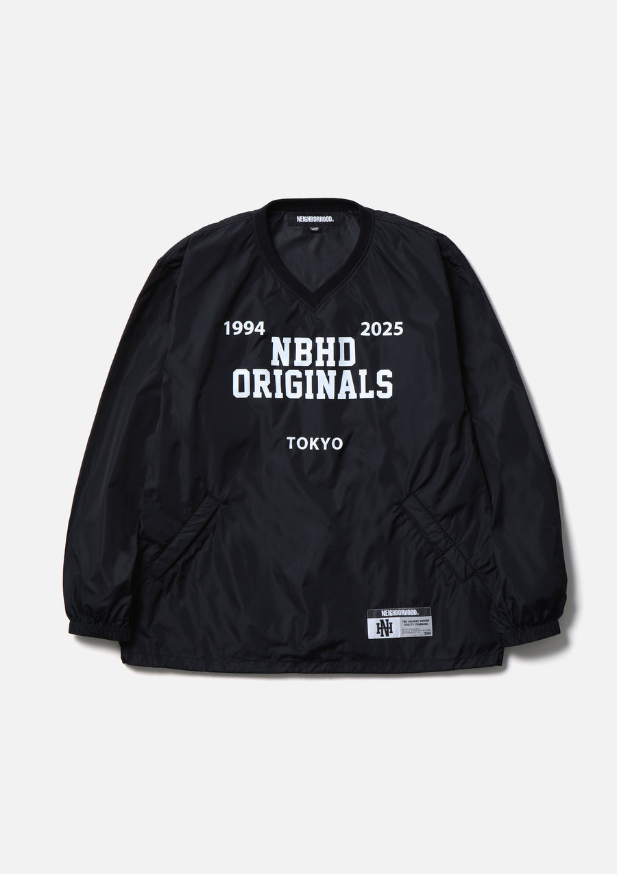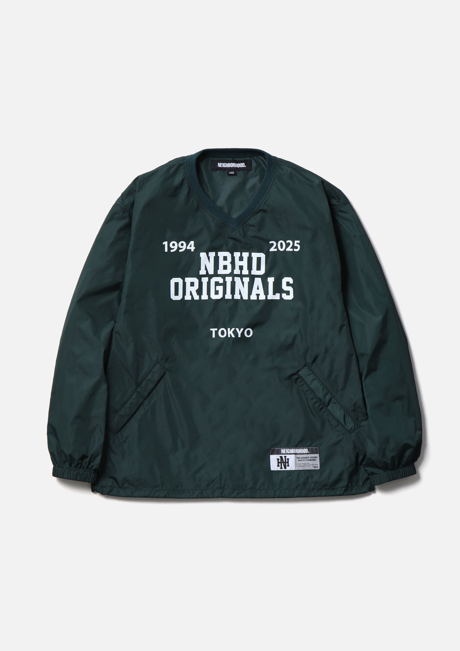 A pullover shirt made from plain-weave taffeta fabric, densely woven with highly abrasion-resistant nylon yarn. V-neck ribbed design. The hem includes an adjustable elastic spindle. Graphic print on the front. Equipped with a brand tag on the left hem and side seam.