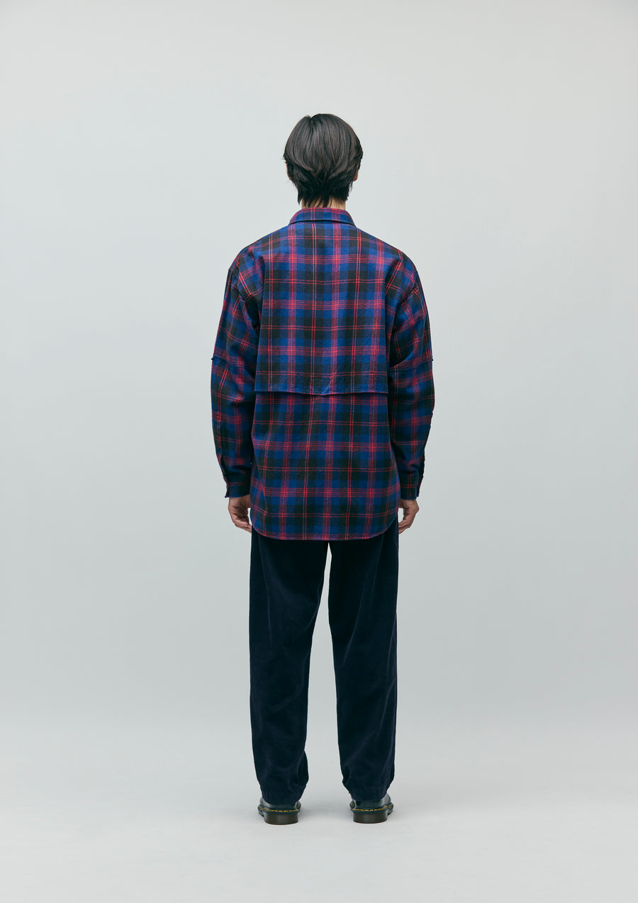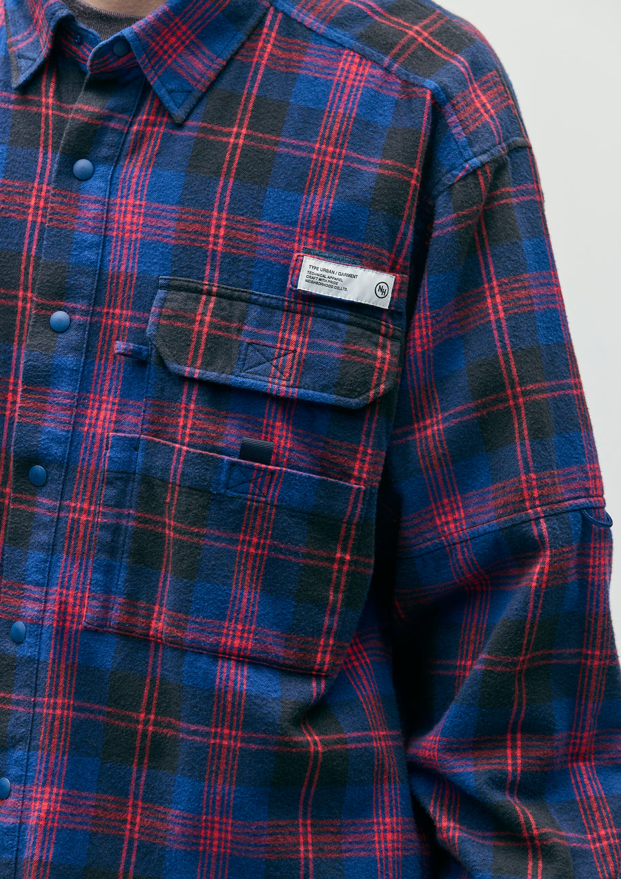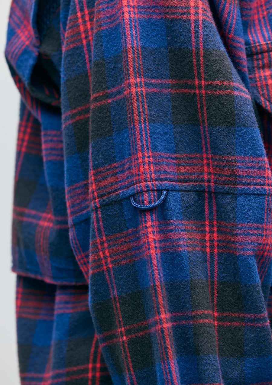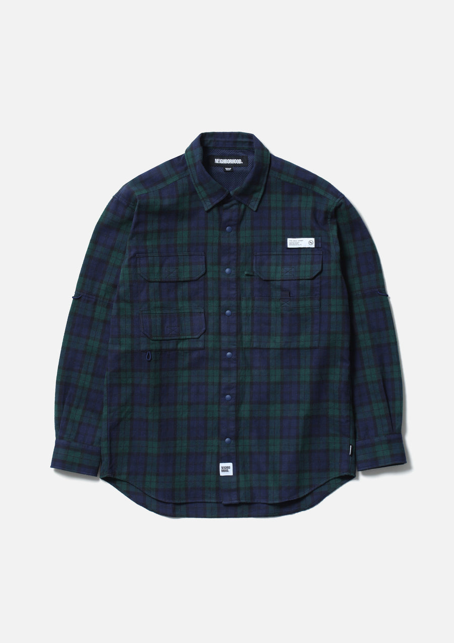 A fishing shirt made from tartan check fabric with a shaggy brushed finish. Features utility pockets on the front and a mesh ventilation panel on the back for breathability. Sleeves include a roll-up loop feature. Brand tags on the left chest, placket and side seam. One-wash finish.