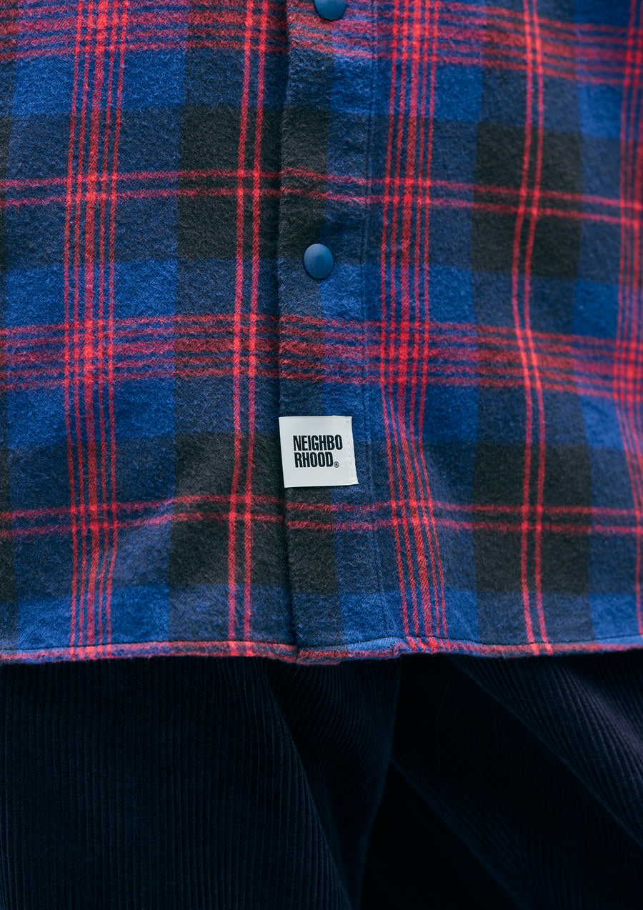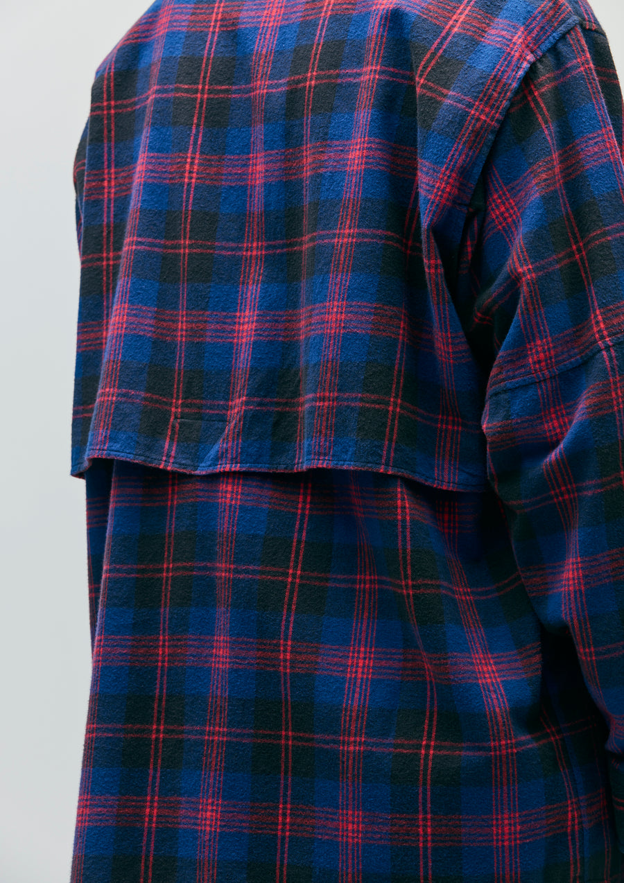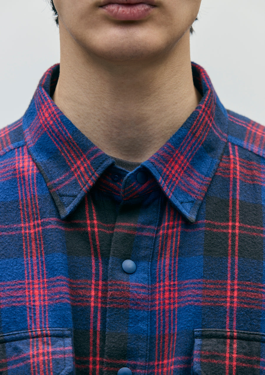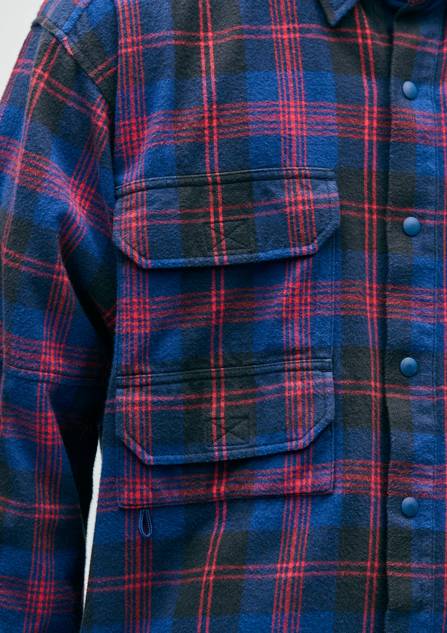 A fishing shirt made from tartan check fabric with a shaggy brushed finish. Features utility pockets on the front and a mesh ventilation panel on the back for breathability. Sleeves include a roll-up loop feature. Brand tags on the left chest, placket and side seam. One-wash finish.