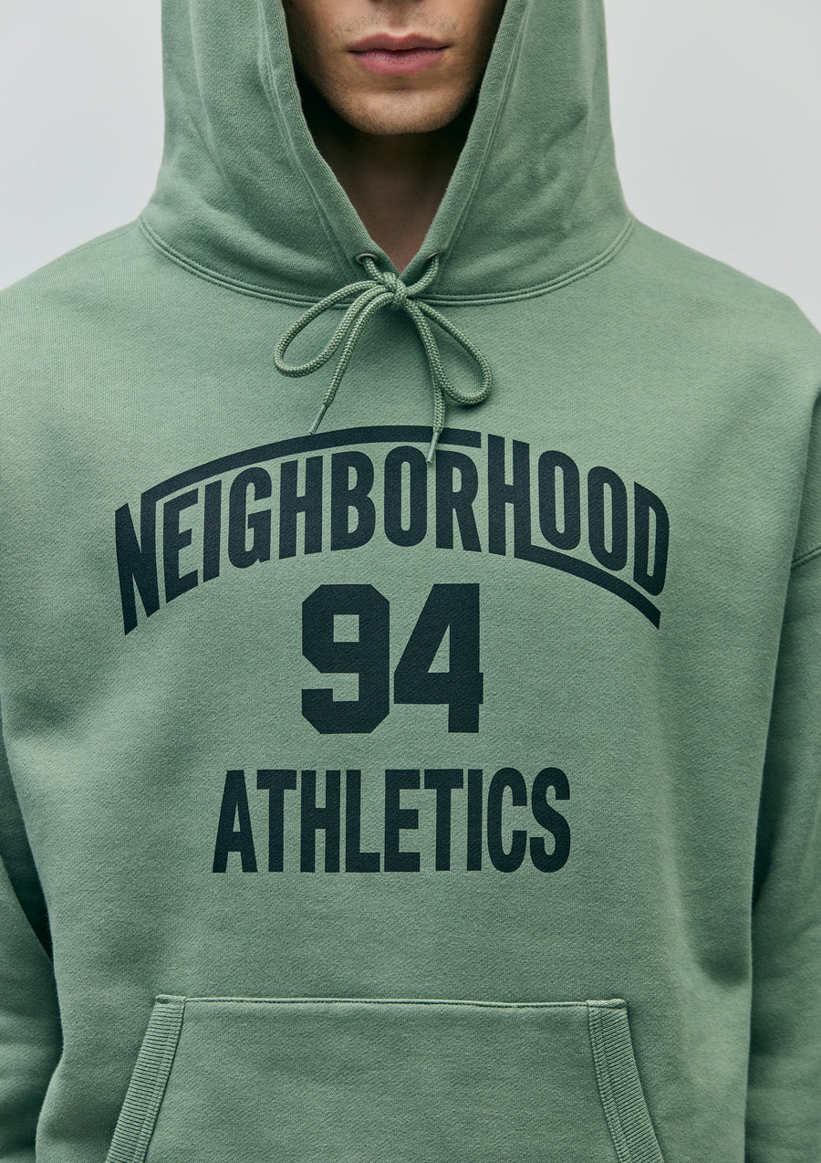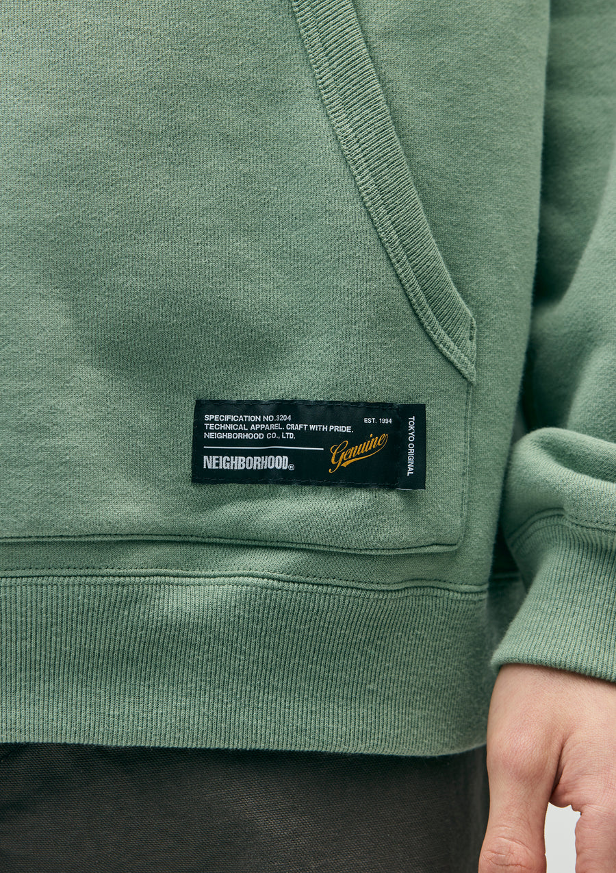 A pullover hoodie made of fleece-backed fabric, brushed before dyeing to minimize lint shedding. Graphic print on the front. Includes a brand tag on the side seam.