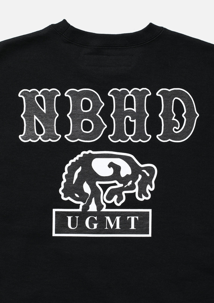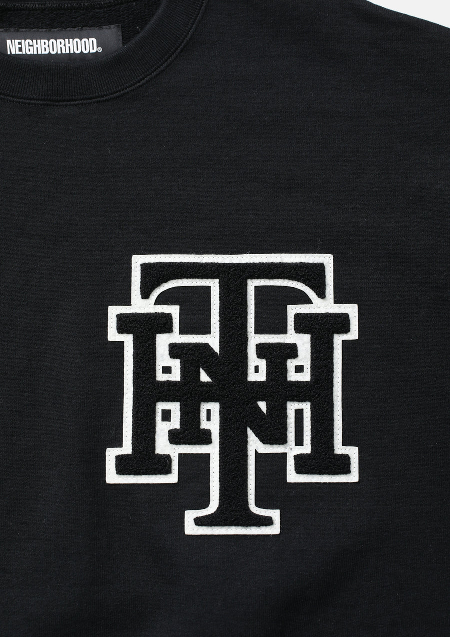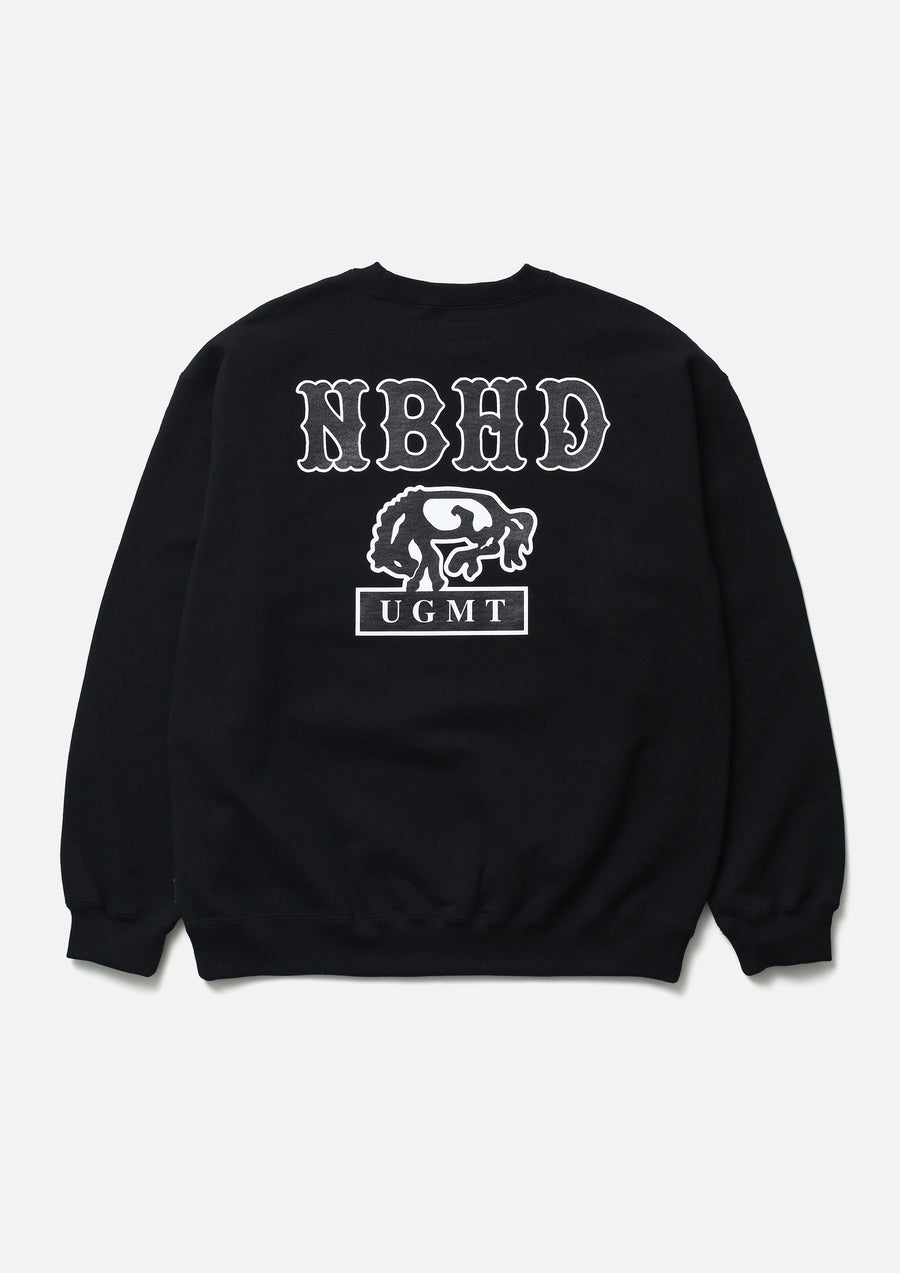 Crewneck pullover in heavy fleece-back material using open-end American cotton yarn for the face thread. Features logo and motifs placed via patches and print. Includes brand tag at the left hem and clip tag at the side seam. One-wash finish.