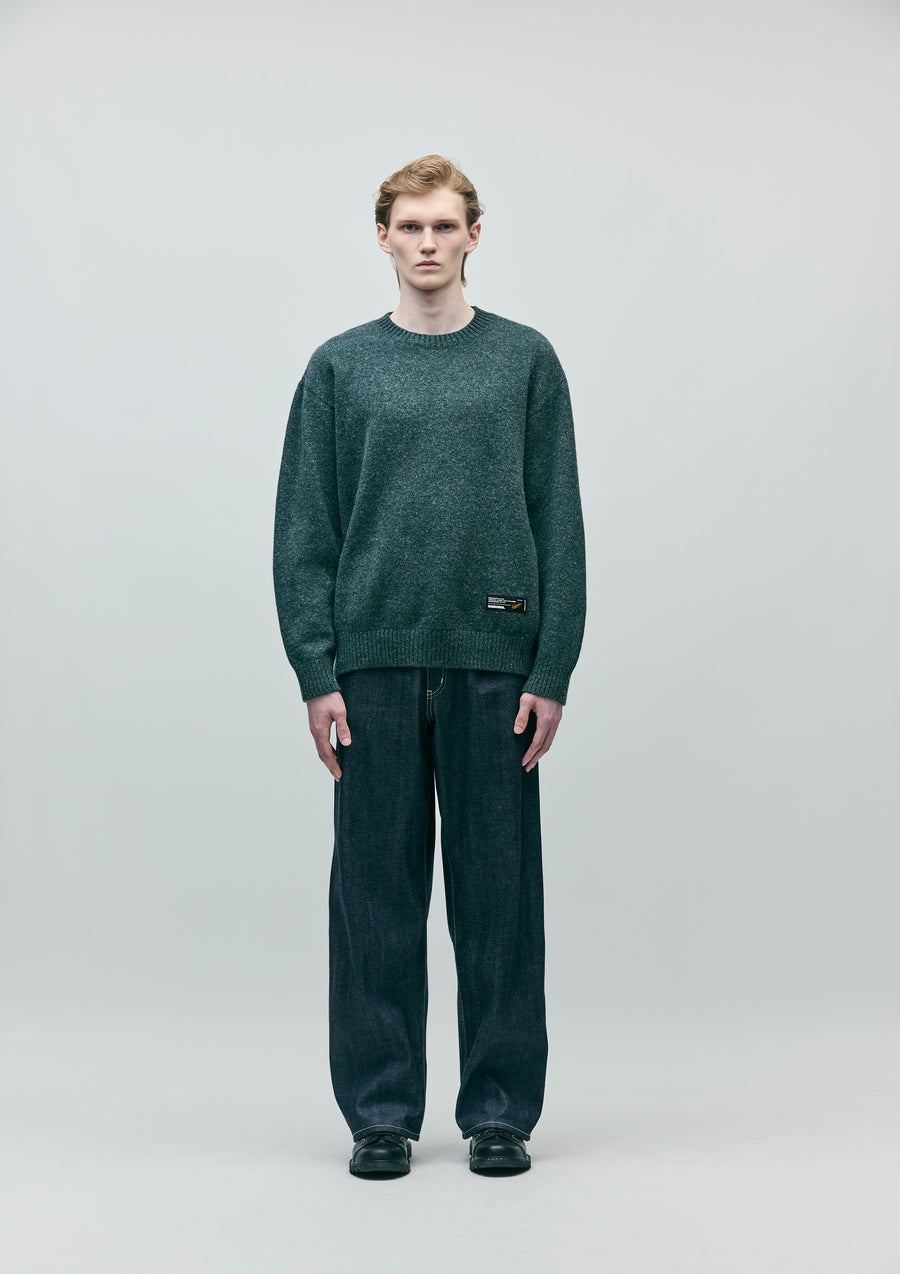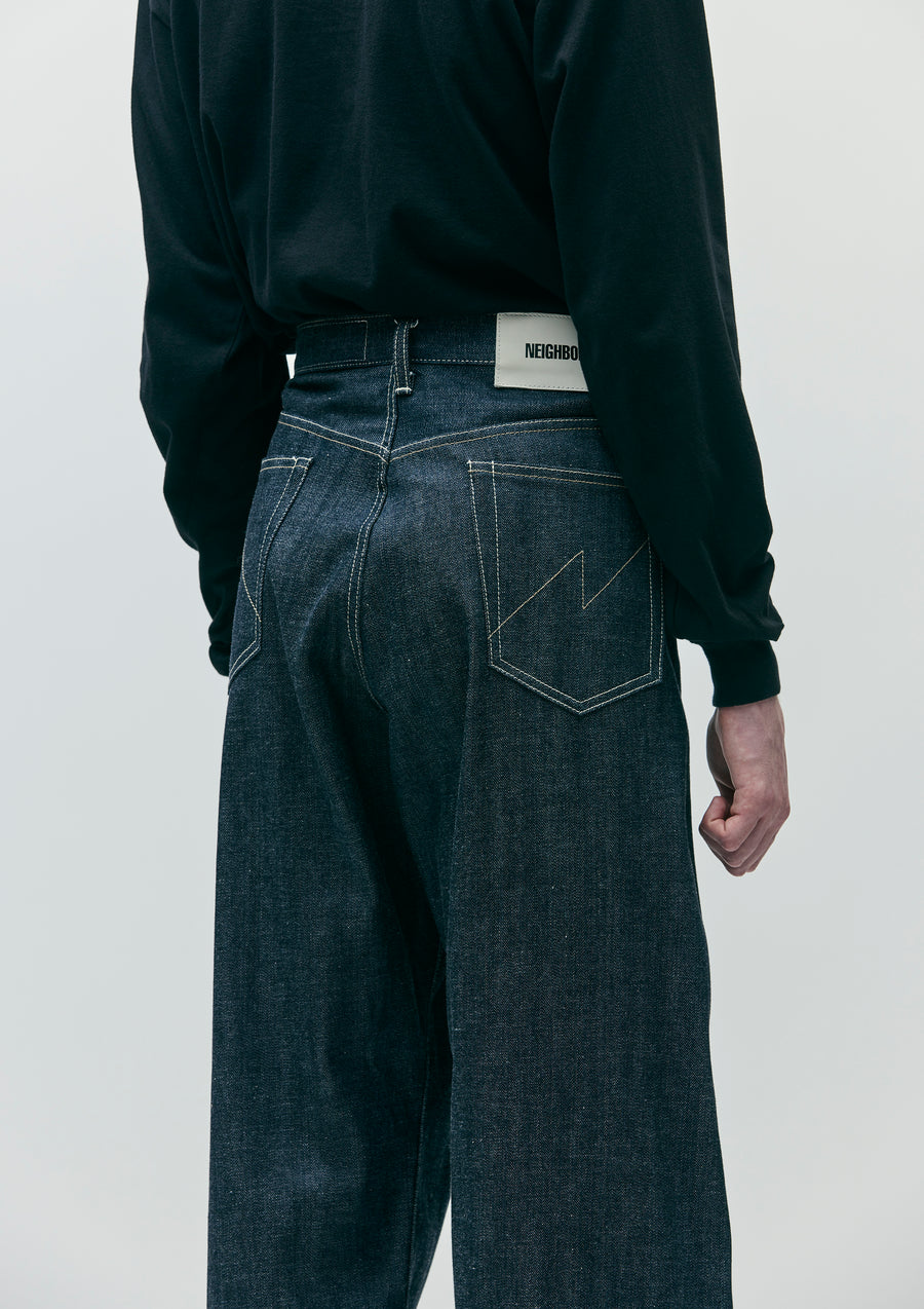 12 oz. denim pants made entirely from our original selvedge denim fabric, buttons, rivets, and other parts. Details such as signature tape on the front zipper fly, "N" stitching on the hip pockets, and leather patches. New wide-slate silhouette with a fairly loose fit in the waist, hips, and hems.