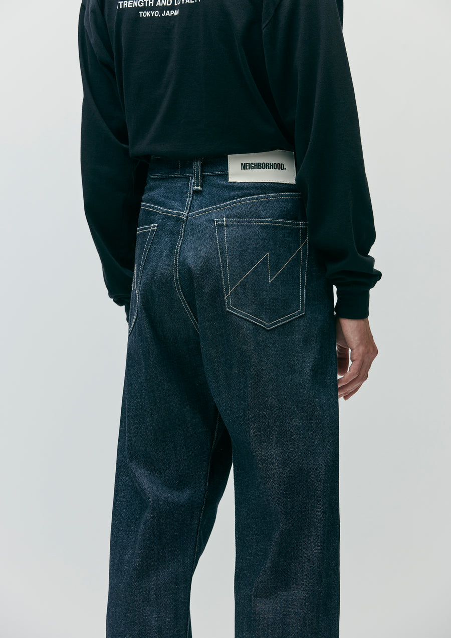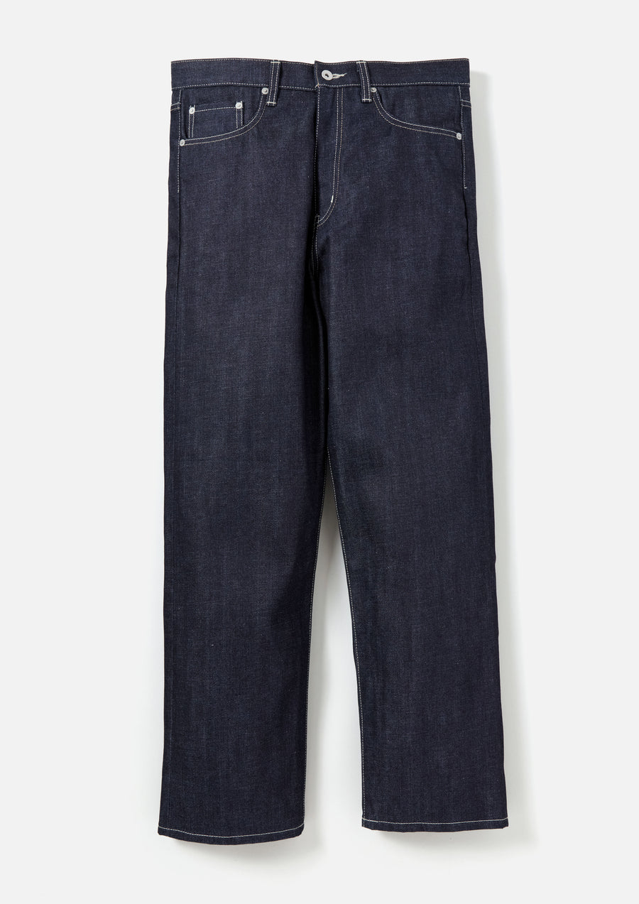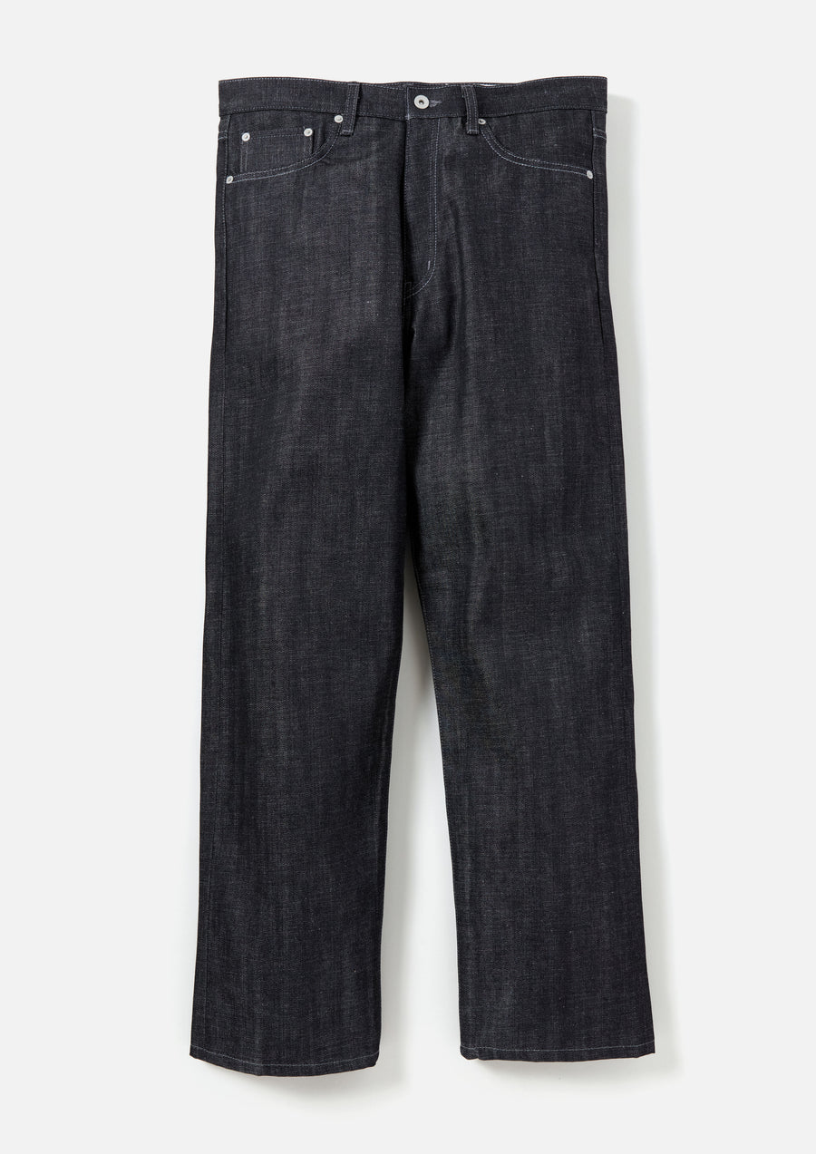 12 oz. denim pants made entirely from our original selvedge denim fabric, buttons, rivets, and other parts. Details such as signature tape on the front zipper fly, "N" stitching on the hip pockets, and leather patches. Standard basic silhouette with a slightly tapered hem with room in the waist, hips, and hems.