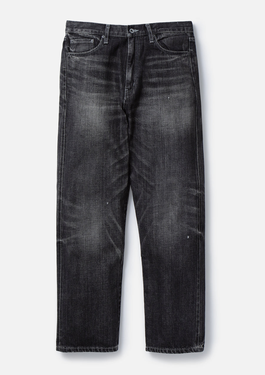 12 oz. original denim pants with a washed finish. All parts, from the selvedge denim fabric to the buttons and rivets, are all original. Details such as signature tape on the front zipper fly, "N" stitching on the hip pockets, and leather patches. Exclusive size label is attached to custom crafted item. Standard basic silhouette with a slightly tapered hem with room in the waist, hips, and hems.