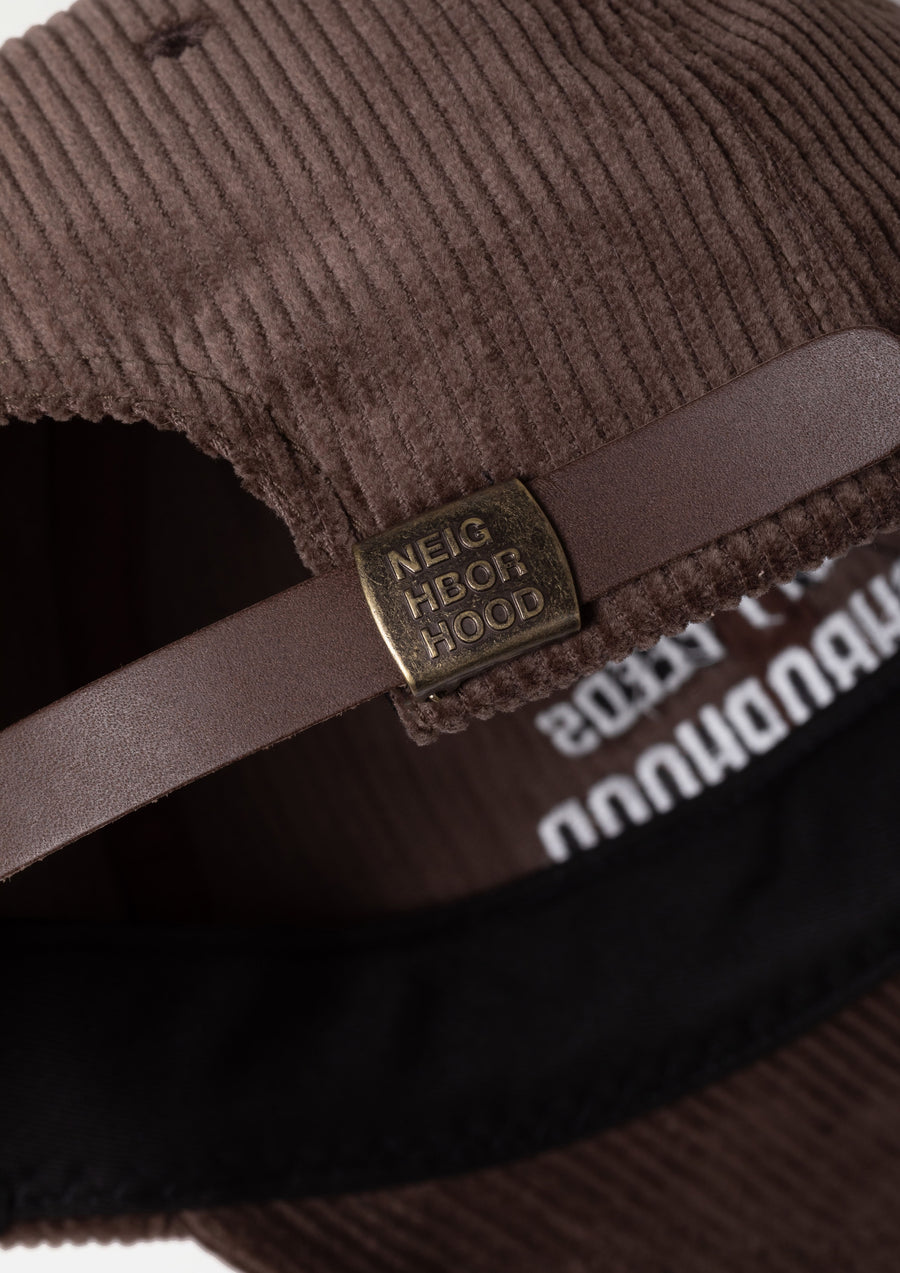 A dad cap made from thick-wale corduroy fabric. Embroidered logo on the front. The rear adjuster is made of leather and features an original buckle. Brand tag on the left side.