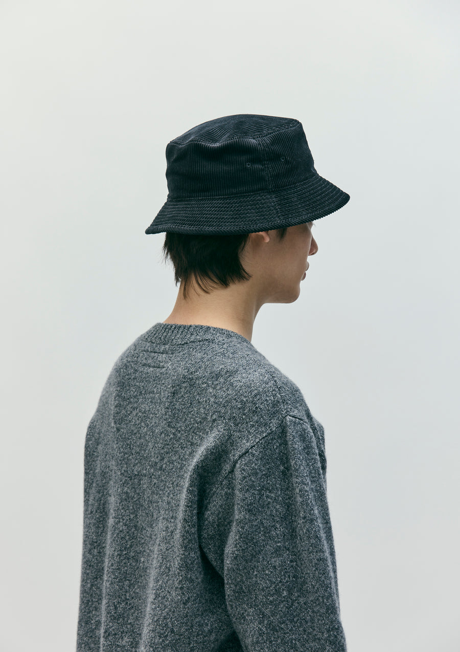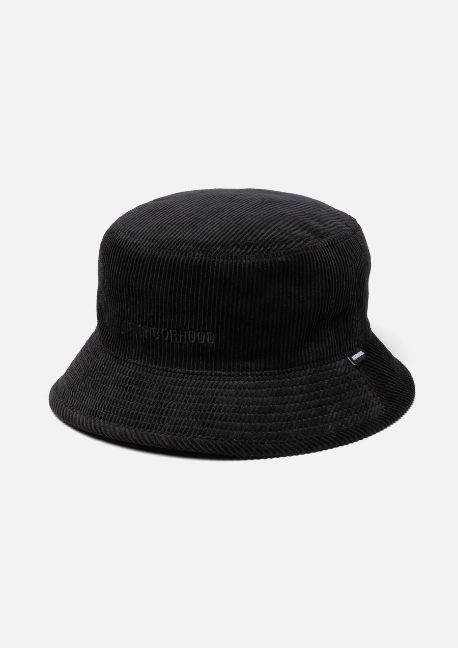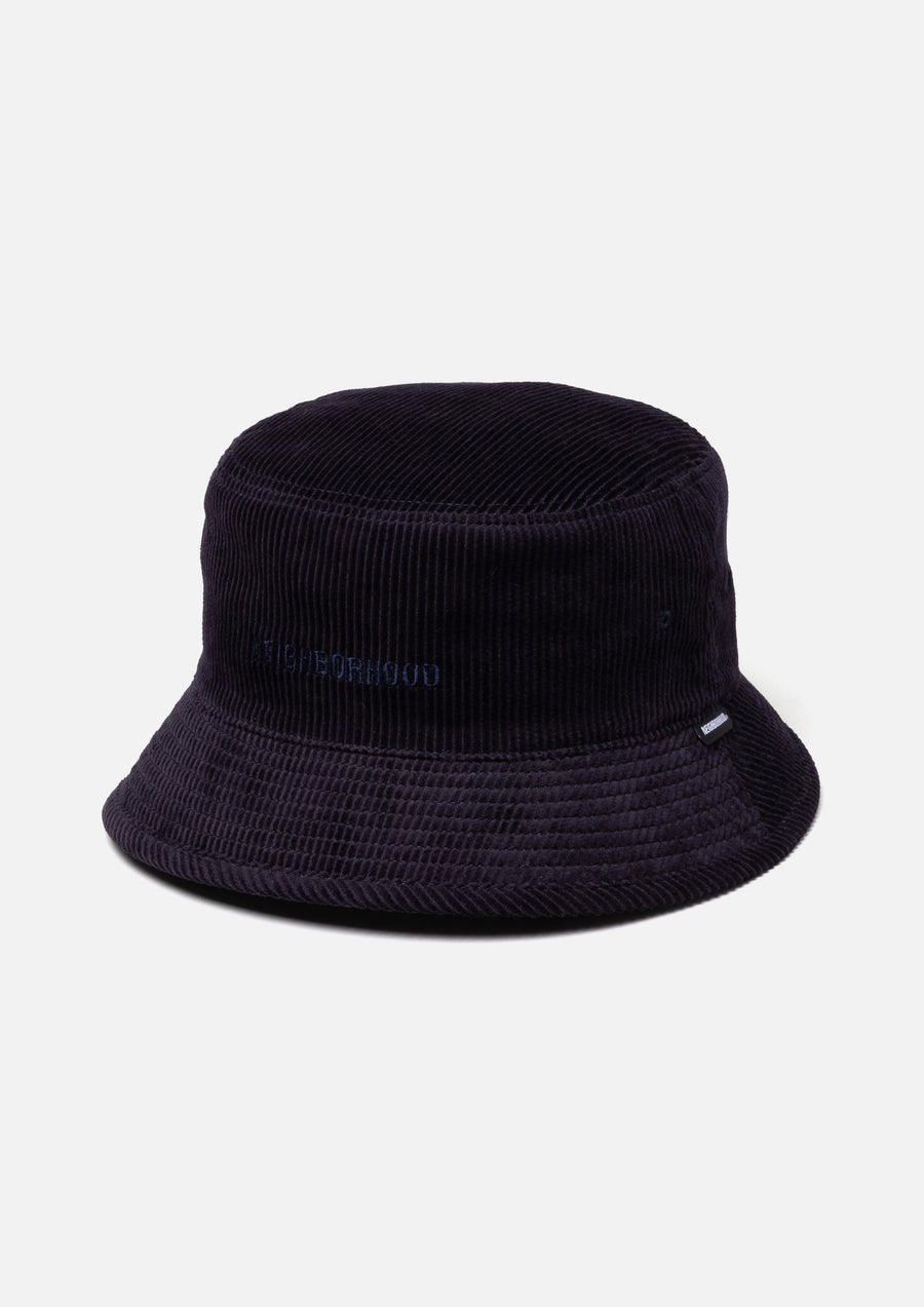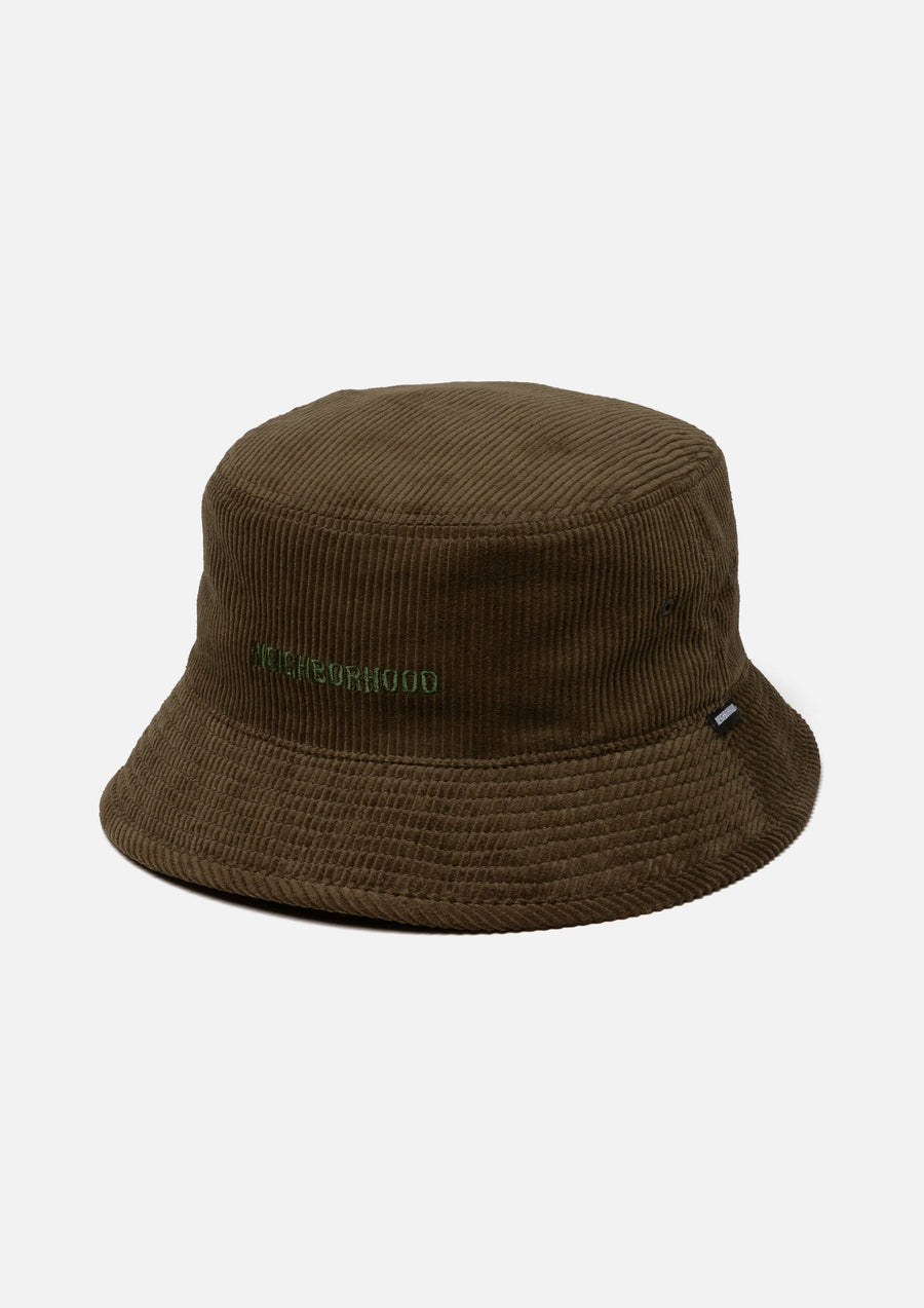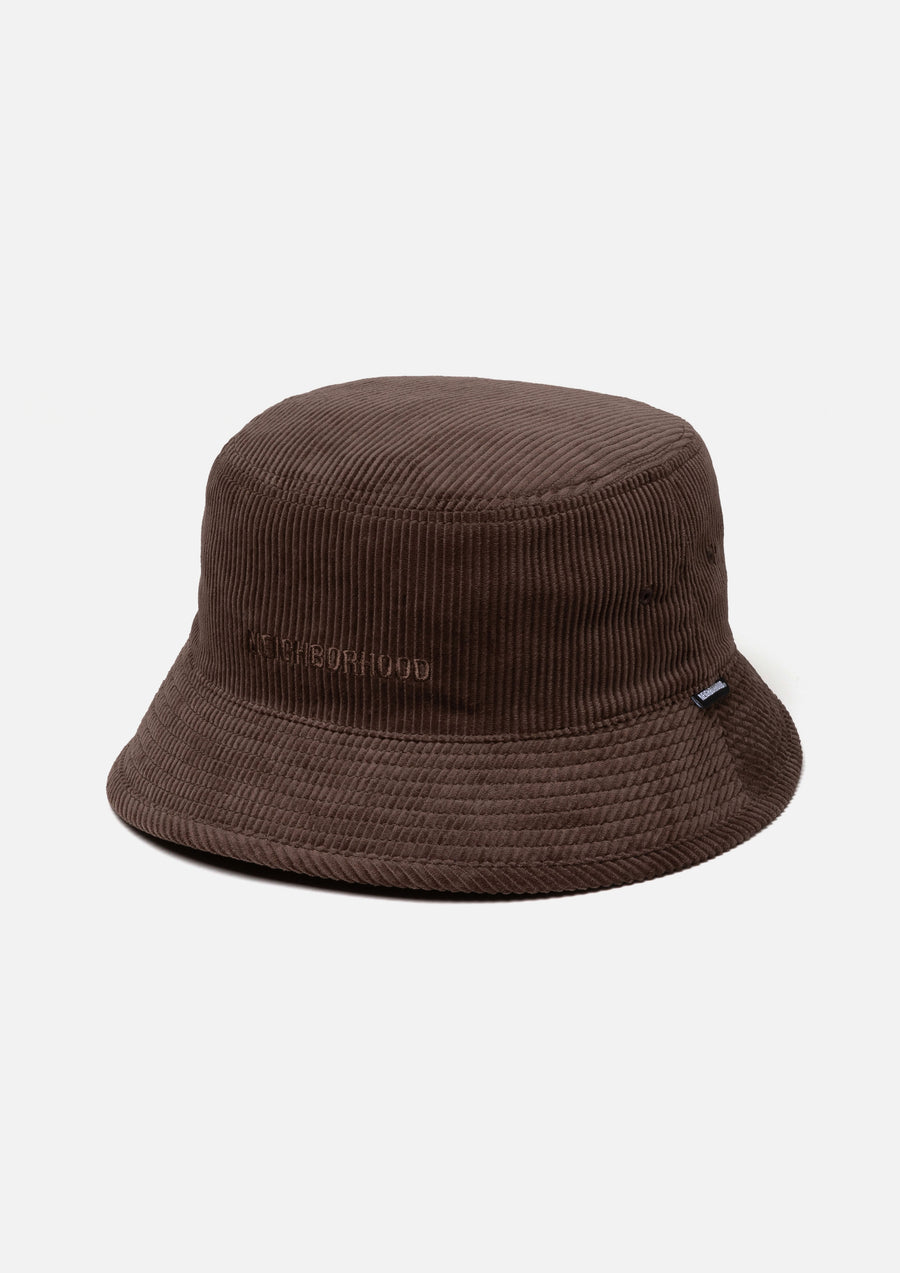 A bucket hat made from thick-wale corduroy fabric. Embroidered logo on the front. Ventilation eyelets on both sides. Brand tag on the left side.