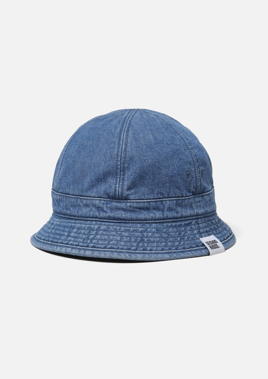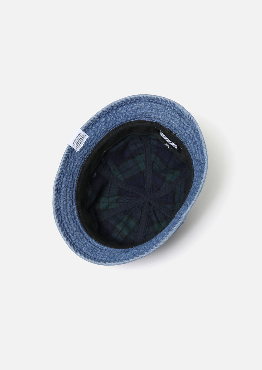 A ball hat made from 10oz slub yarn denim fabric, treated with ball bio-wash and bleach processing. The lining features flannel check fabric. Brand tags included.
