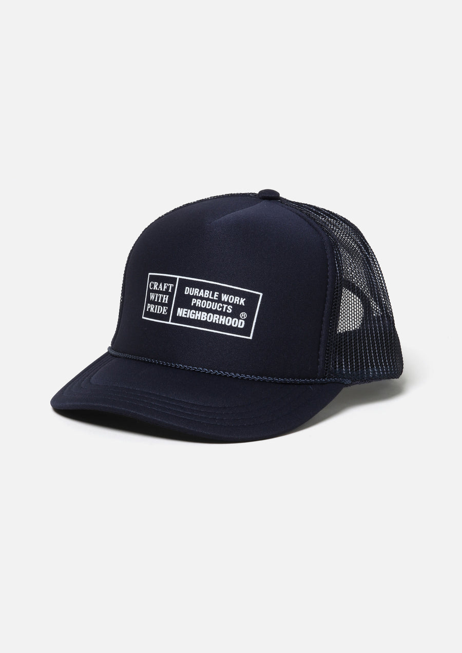 A mesh cap made from polyester fabric. Features a printed logo on the front. Snapback closure.