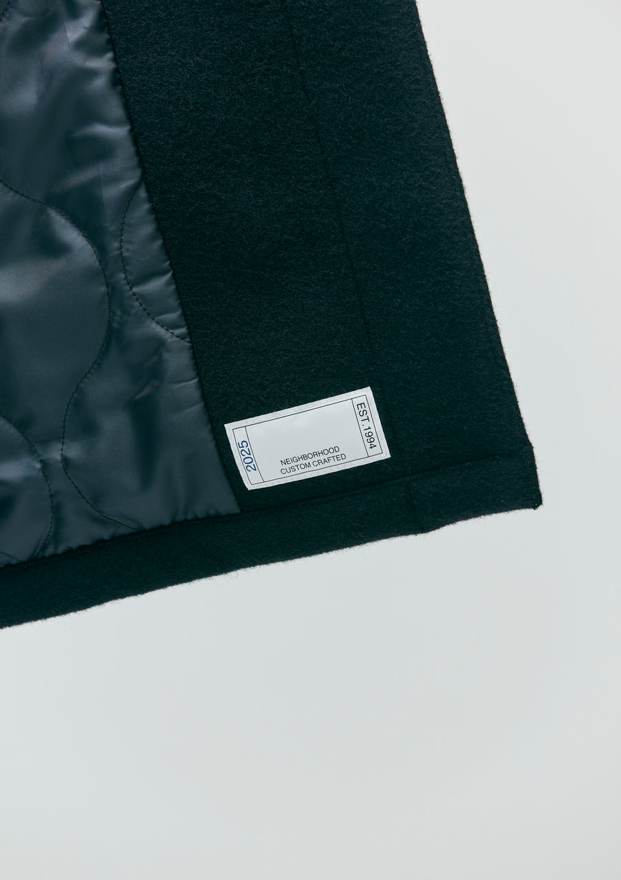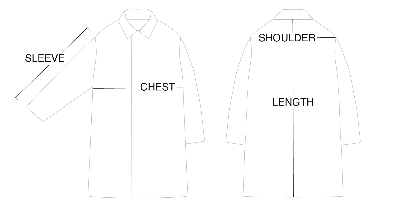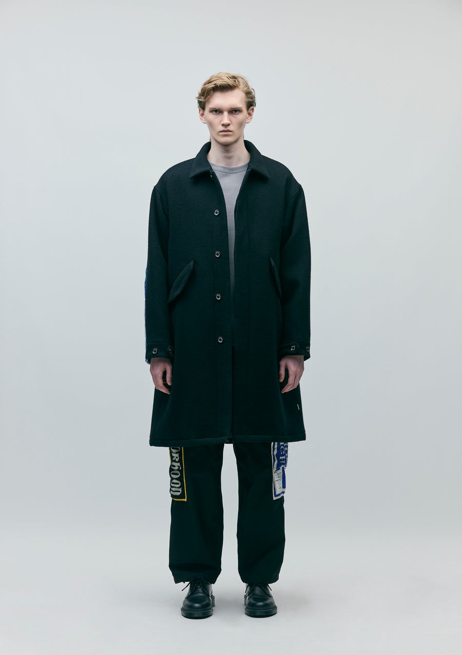 A wool coat made from mid-weight top melton fabric, featuring a soft texture with a double-weave finish using top-dyed yarn. Equipped with concealed snap-button flap pockets on both sides. The hem is designed in a fishtail style. The underside of the sleeves features an original pub towel detail, and the back is printed with a logo. Original four-hole buttons are used, and a brand tag is attached to the side seam.