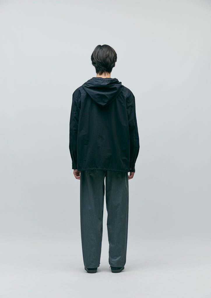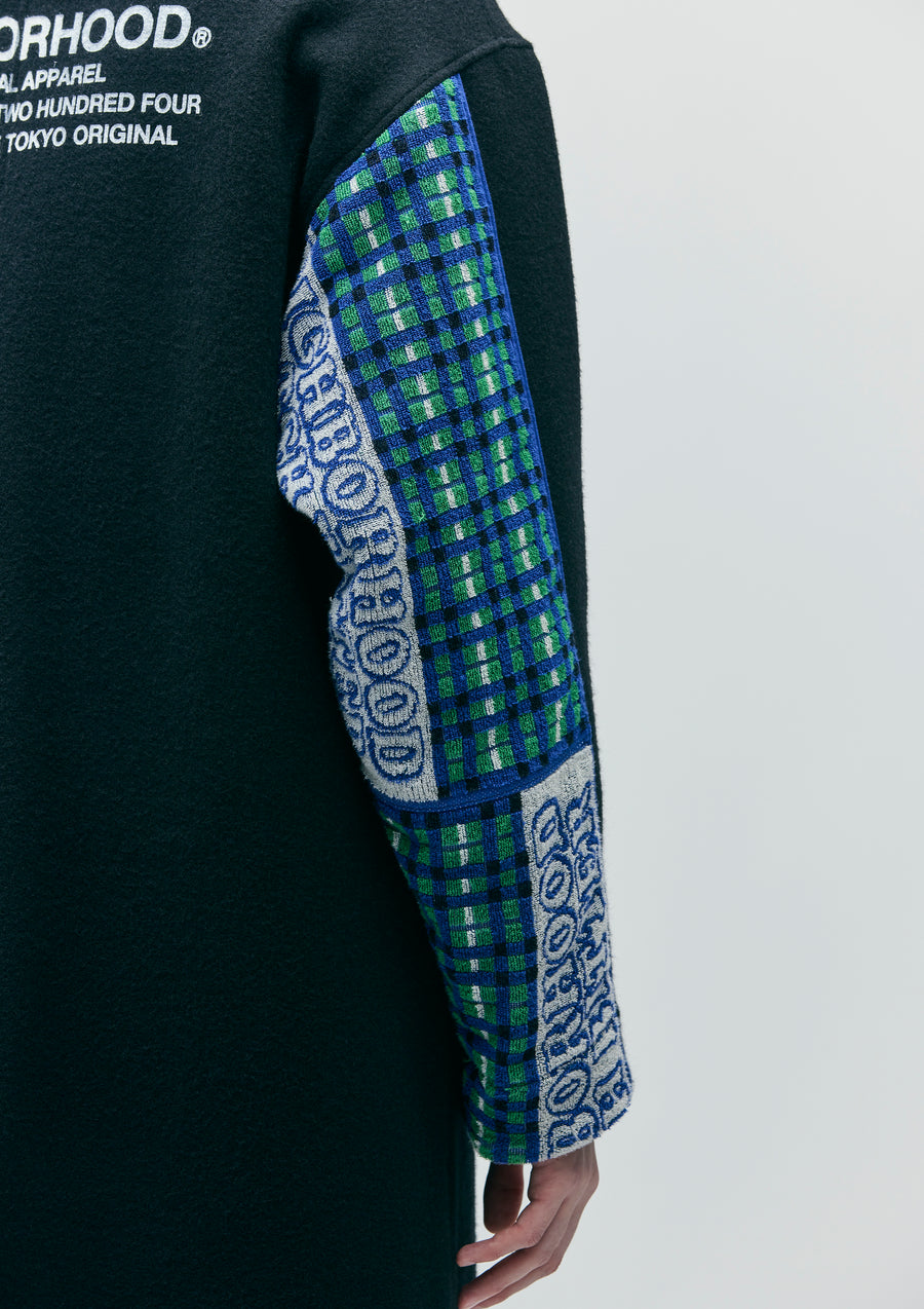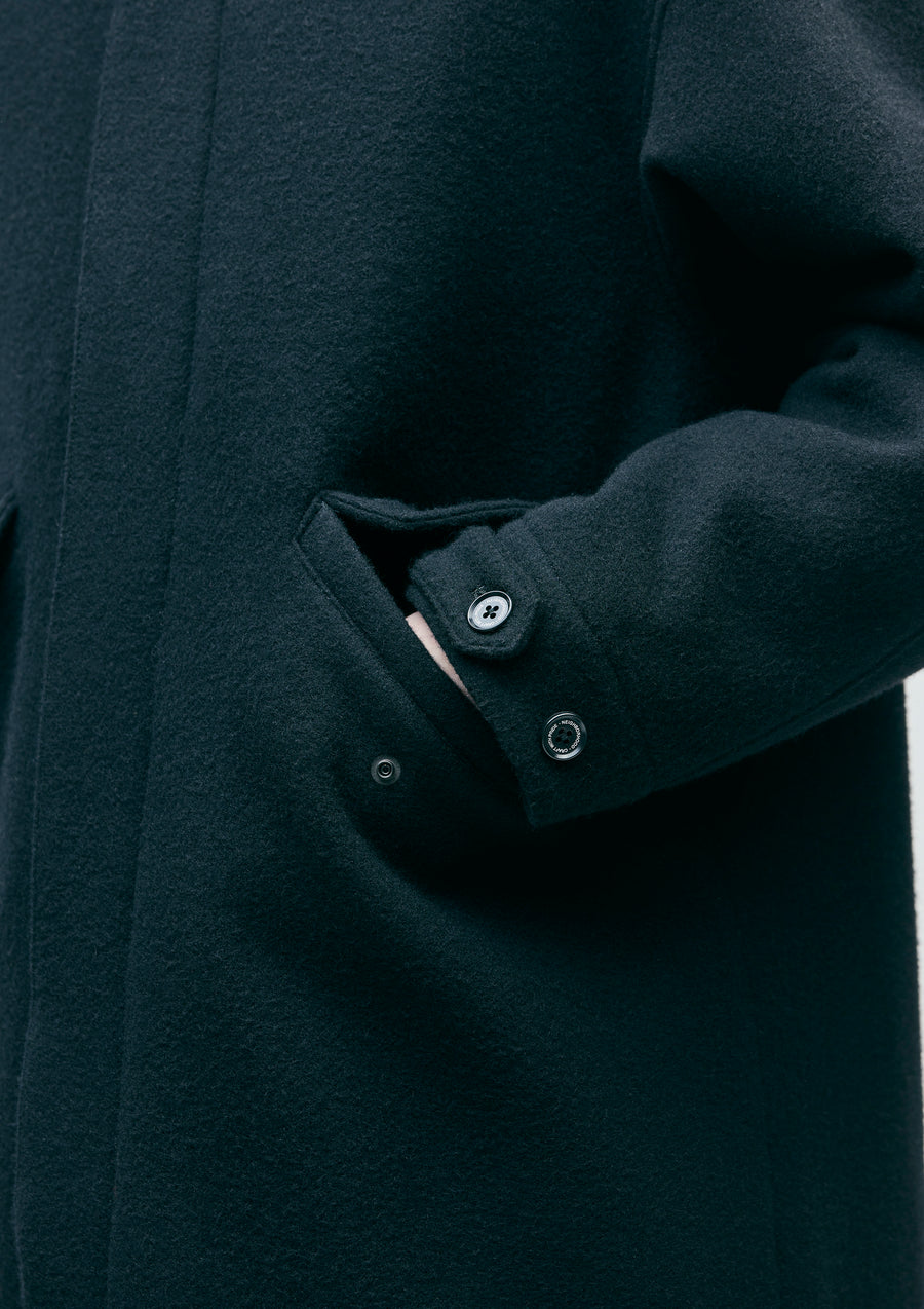 A wool coat made from mid-weight top melton fabric, featuring a soft texture with a double-weave finish using top-dyed yarn. Equipped with concealed snap-button flap pockets on both sides. The hem is designed in a fishtail style. The underside of the sleeves features an original pub towel detail, and the back is printed with a logo. Original four-hole buttons are used, and a brand tag is attached to the side seam.