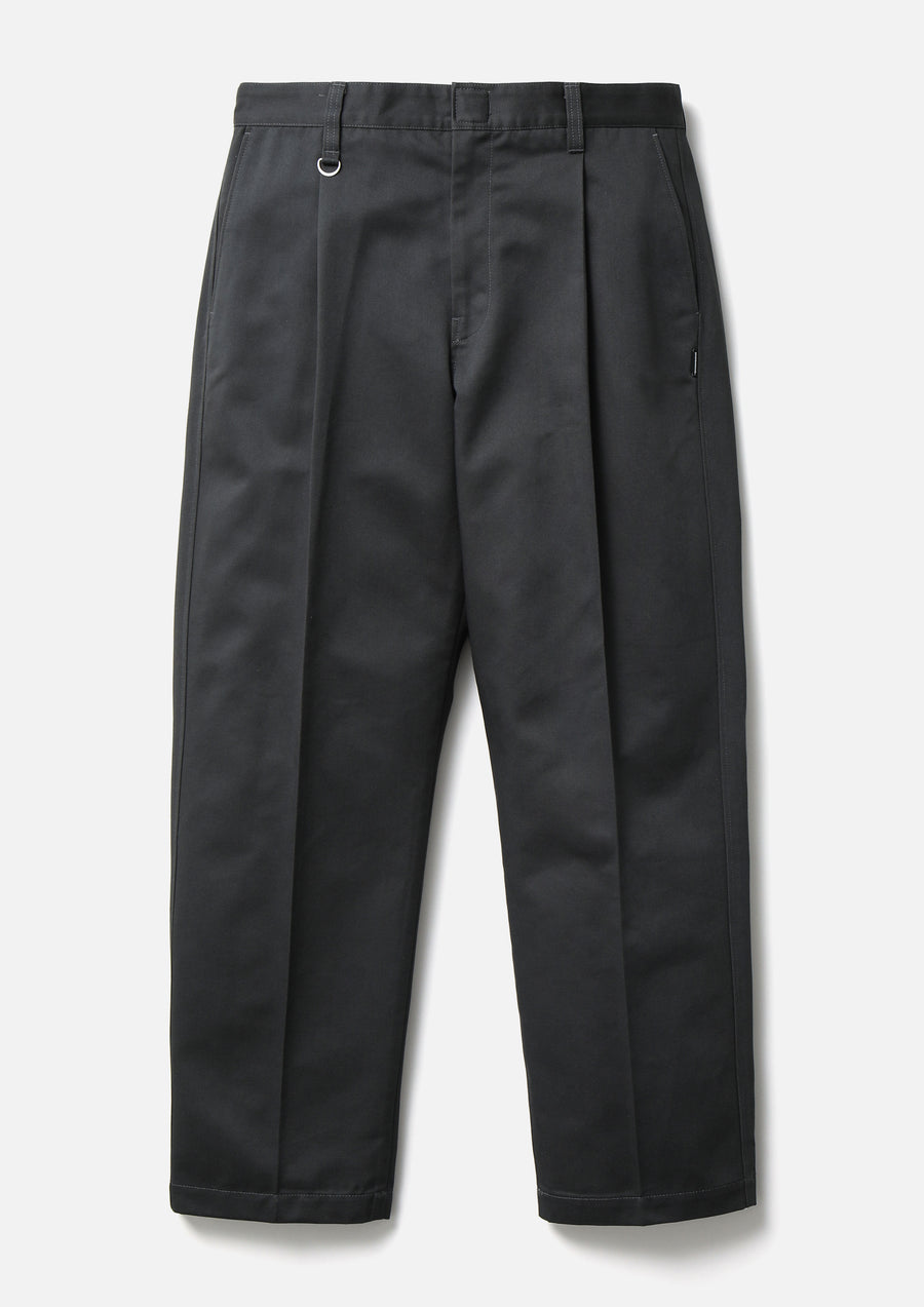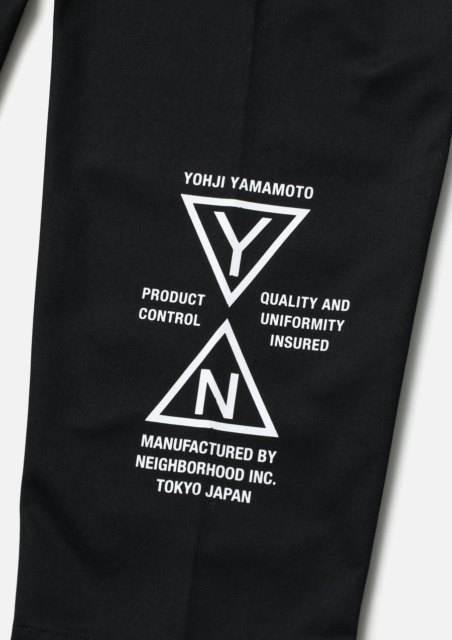 Tuck pants in T/C twill. Graphic printed on the right rear leg. Features a D-ring on the waistband loop, original buttons, pocketing, and an original zipper pull. Brand tag at the back waist. Finished with a woven flag label at the side seam. A collaboration with Yohji Yamamoto POUR HOMME.