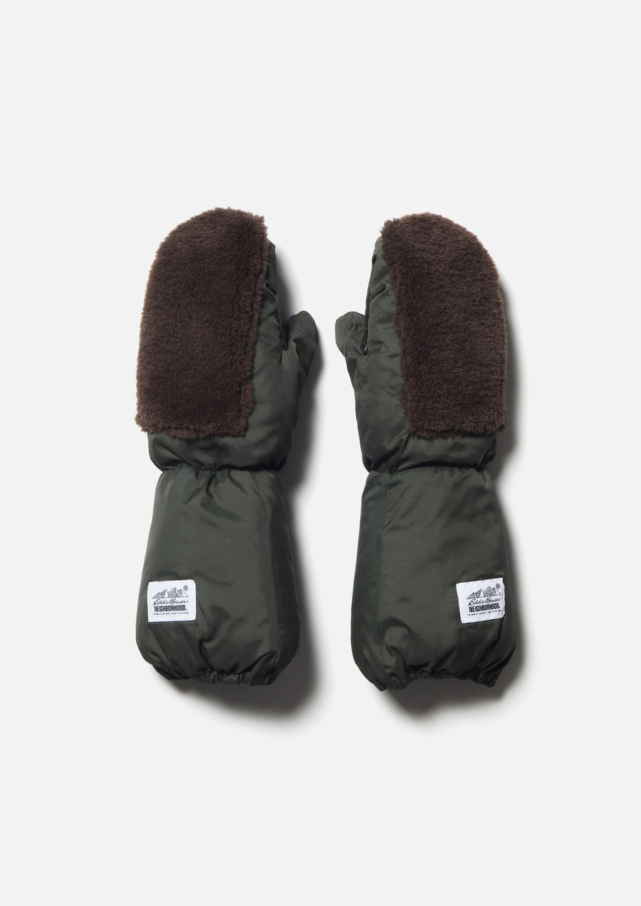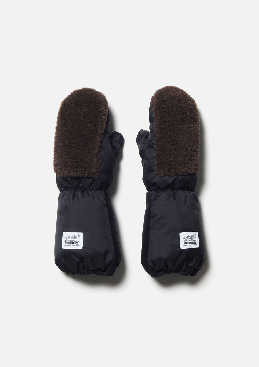 Down mittens crafted from nylon ripstop fabric with firmness, resilience, and a subtle sheen, combined with boa material. Equipped with an adjustable buckle at the wrist. The lining uses polyester material for excellent heat retention. Finished with a collaboration name tag and a brand tag. A joint work item with Eddie Bauer, the outdoor brand founded in Seattle, USA in 1920.