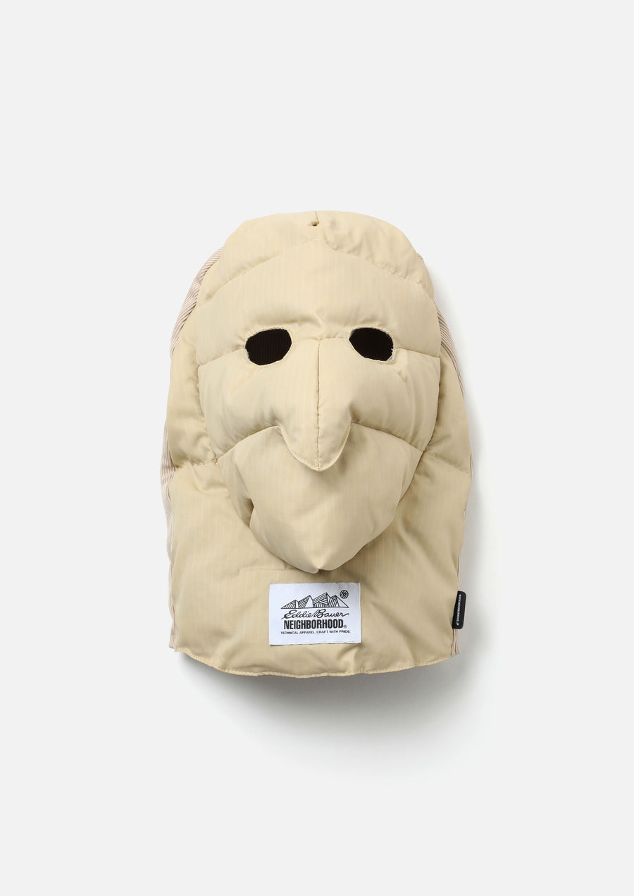 A down mask made from nylon ripstop fabric with firmness, resilience, and a subtle sheen. Ribbed material with excellent elasticity is used on the back. Finished with a collaboration name tag. A joint work item with Eddie Bauer, the outdoor brand founded in Seattle, USA in 1920.