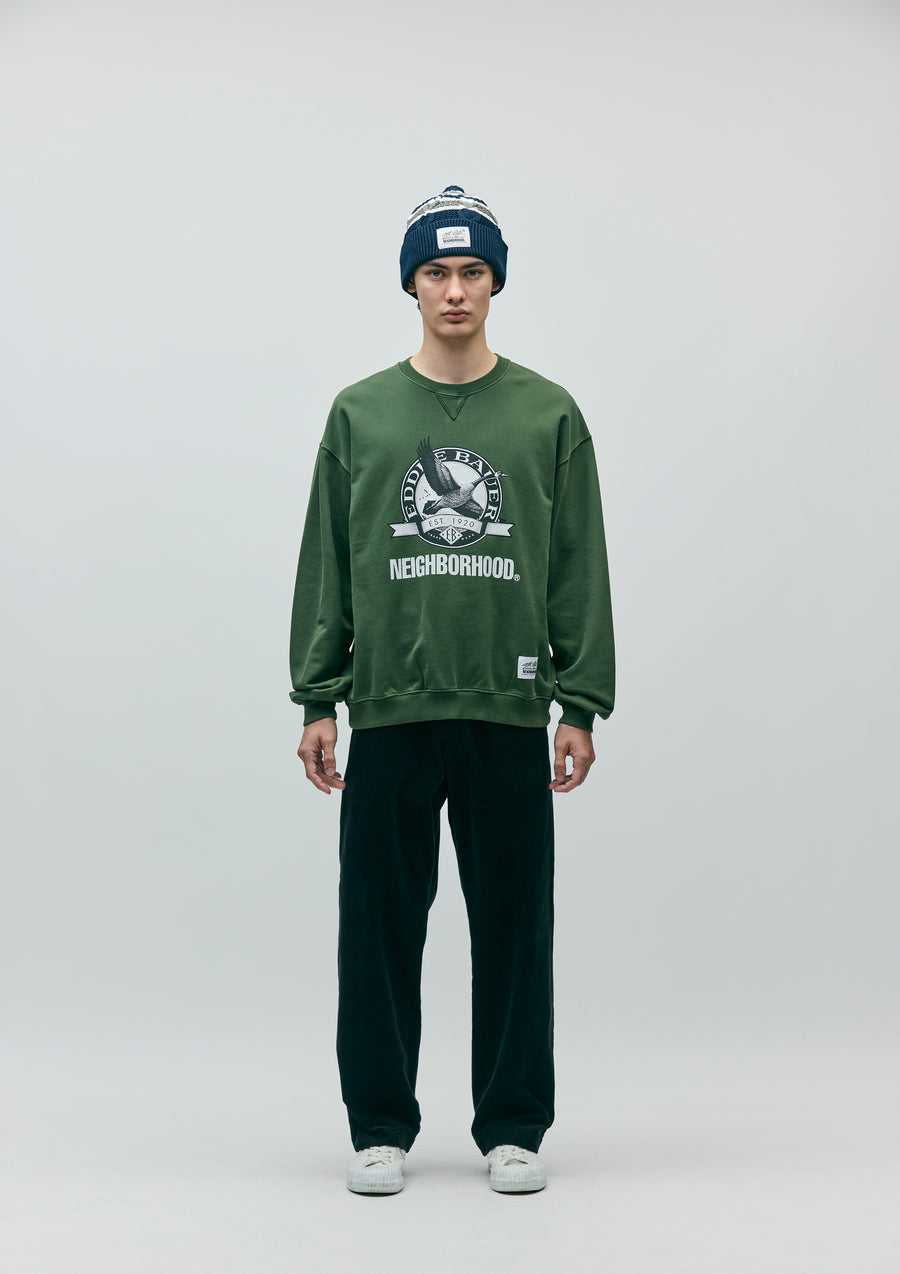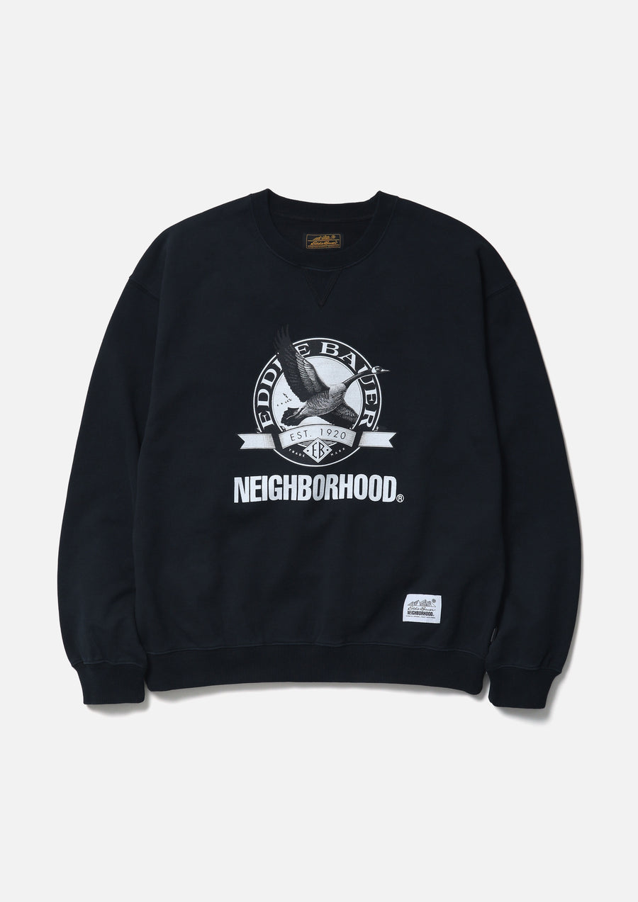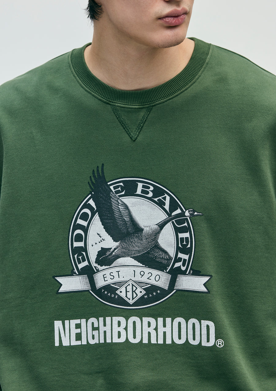 A crewneck pullover made from cotton fleece material that has undergone a special wash process to express a worn-in, aged look. A graphic is printed on the front. Features a collaboration name tag at the left hem and a brand tag sewn into the side seam. A joint work item with Eddie Bauer, an outdoor brand founded in Seattle, USA in 1920.