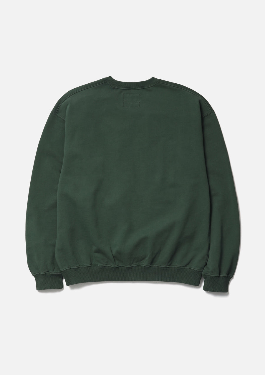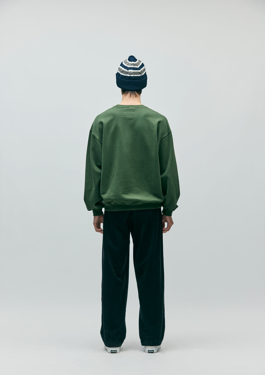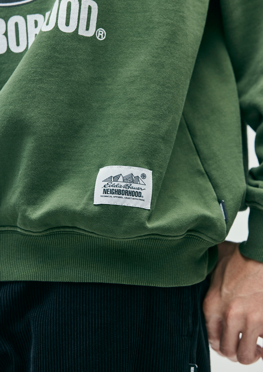 A crewneck pullover made from cotton fleece material that has undergone a special wash process to express a worn-in, aged look. A graphic is printed on the front. Features a collaboration name tag at the left hem and a brand tag sewn into the side seam. A joint work item with Eddie Bauer, an outdoor brand founded in Seattle, USA in 1920.
