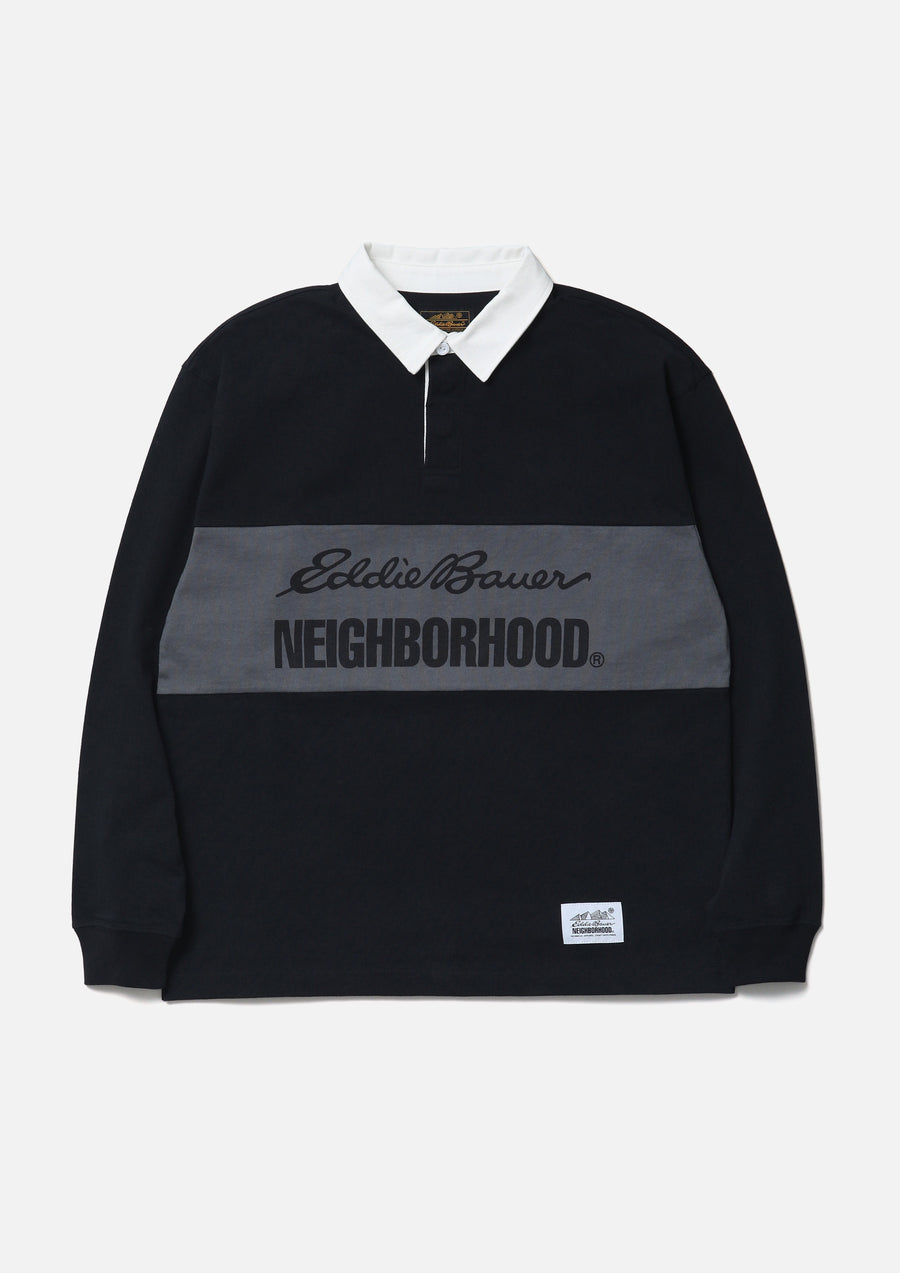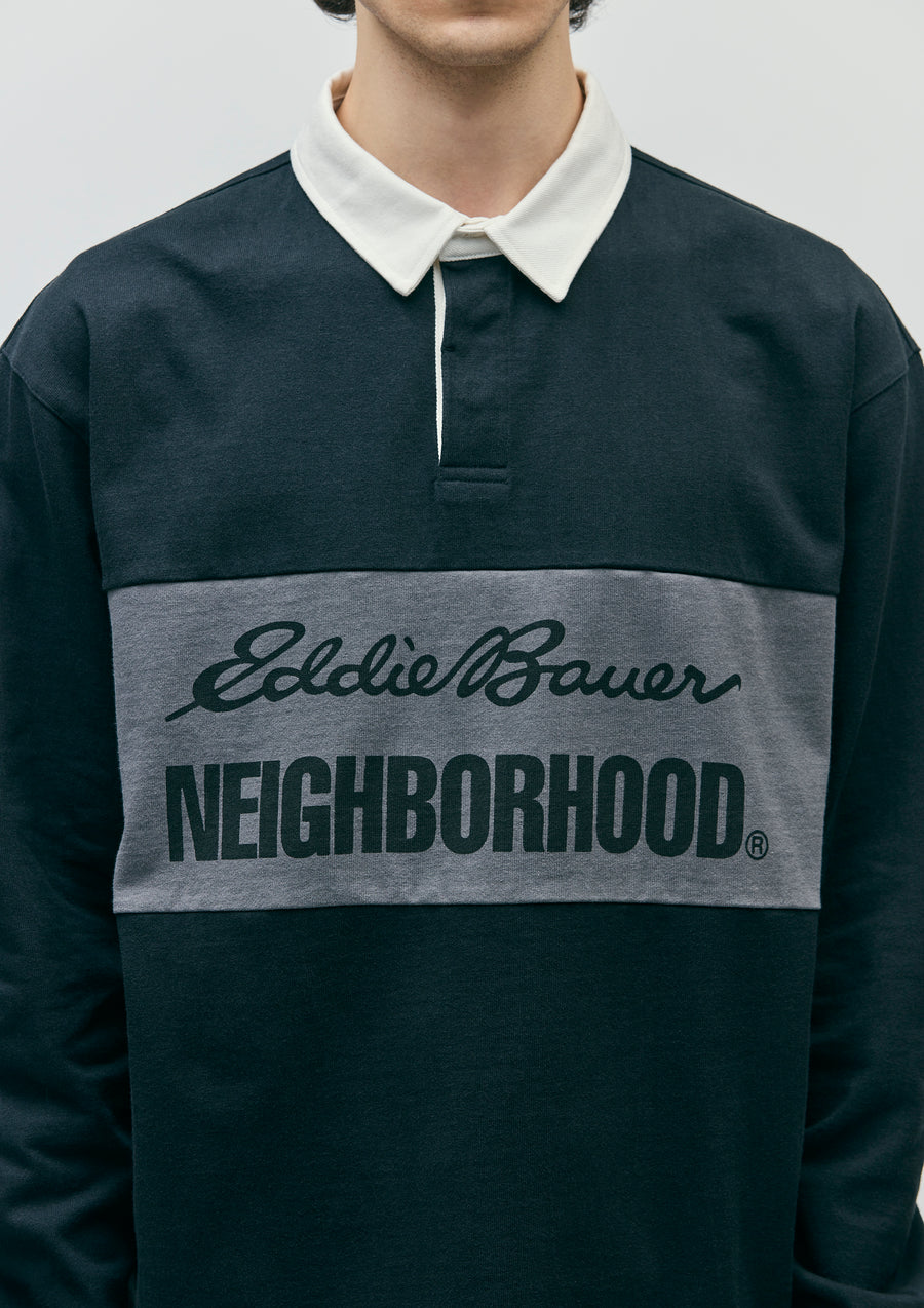 A collaborative item with Eddie Bauer, the renowned Seattle-based outdoor brand founded in 1920. A rugby shirt made from cotton jersey fabric. Features printed logos from both brands along the color-blocked sections. Includes a collaboration brand tag on the left hem and a brand tag on the side seam.