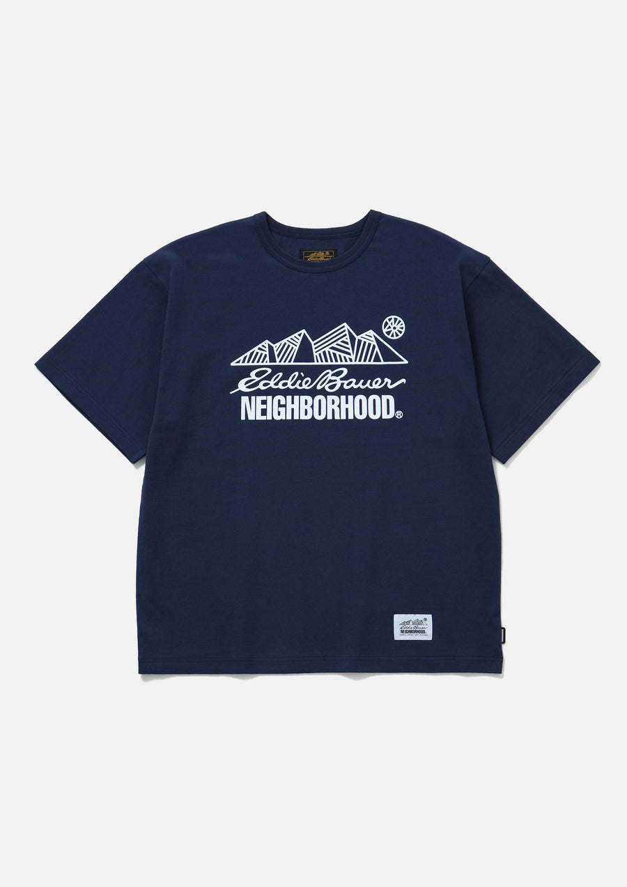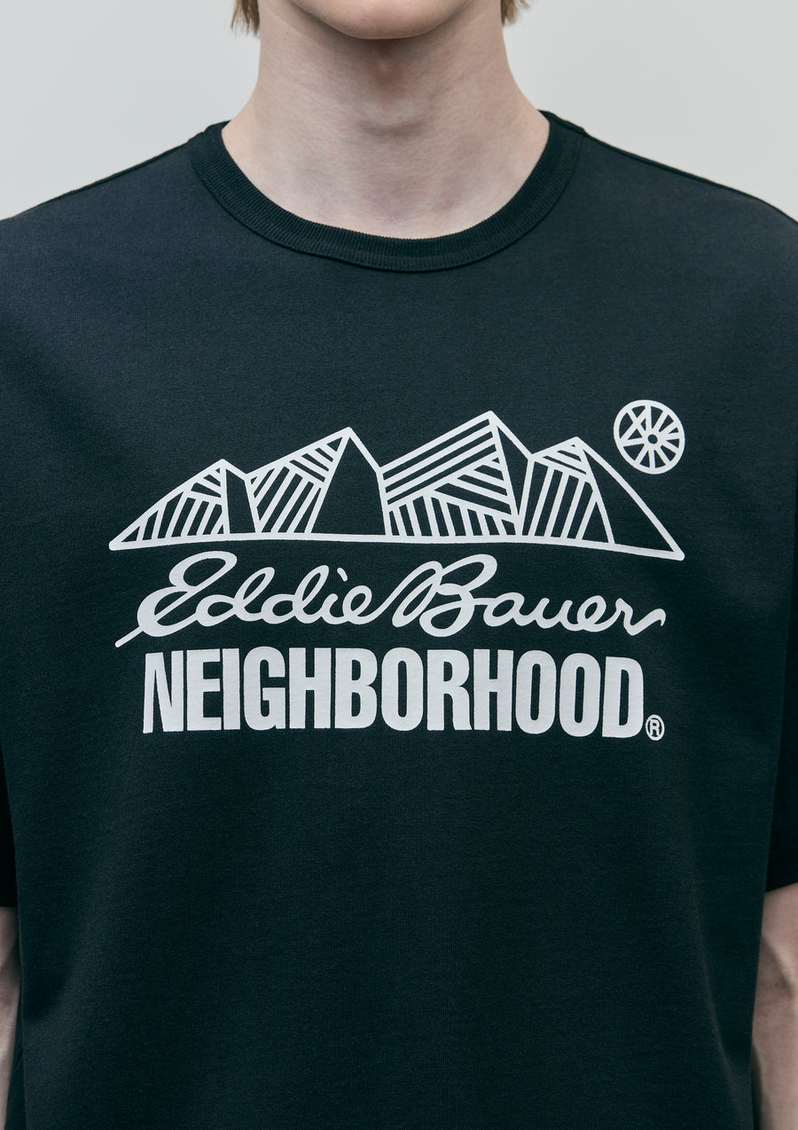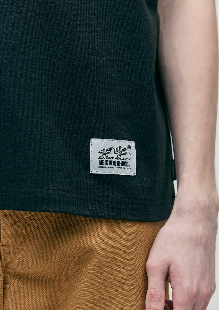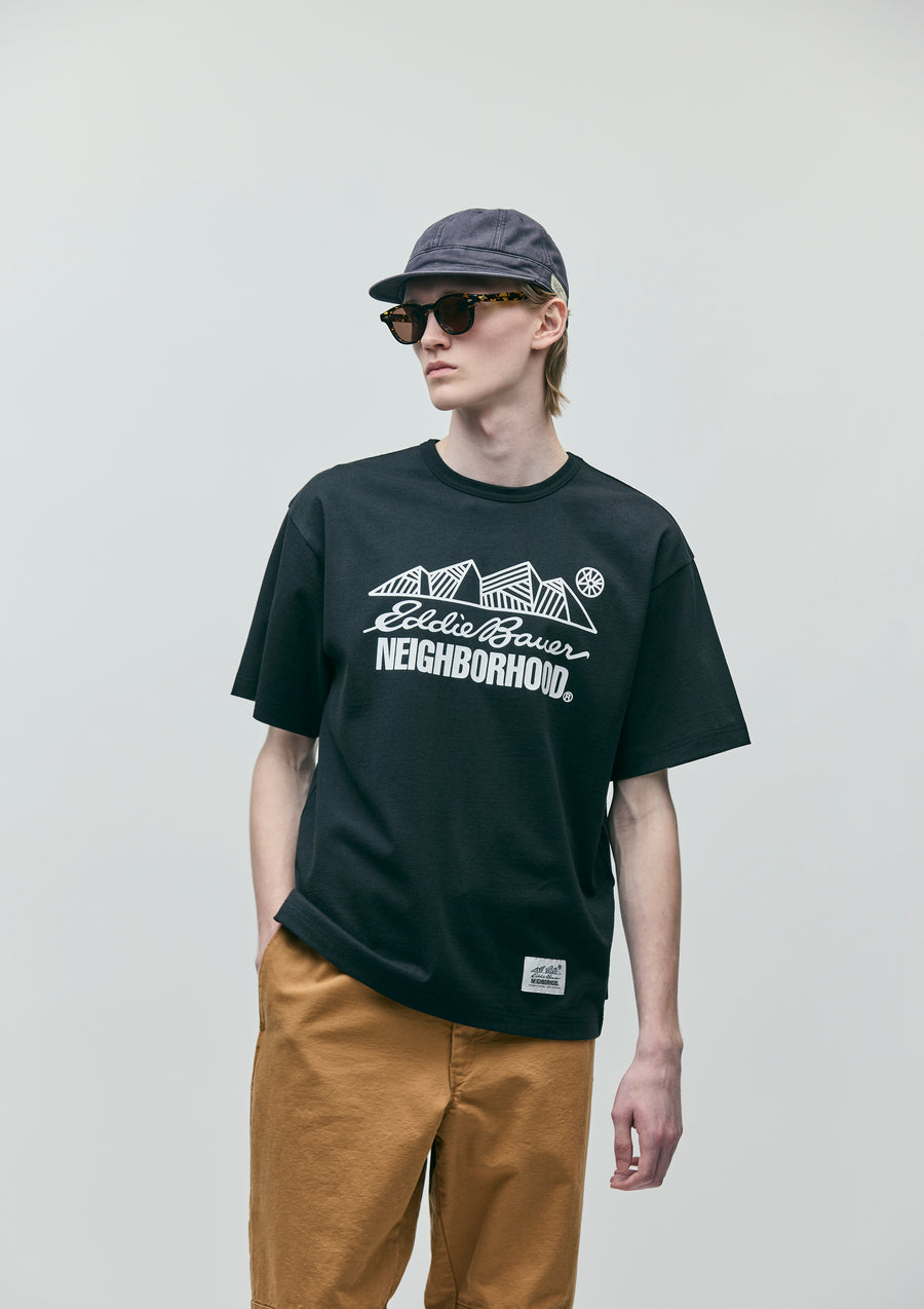 A crewneck cut and sewn top made from cotton jersey material. The front features printed logos of both brands. A collaboration name tag is placed at the left hem, with a brand tag on the side seam. A joint work item with Eddie Bauer, the outdoor brand founded in Seattle, USA in 1920.