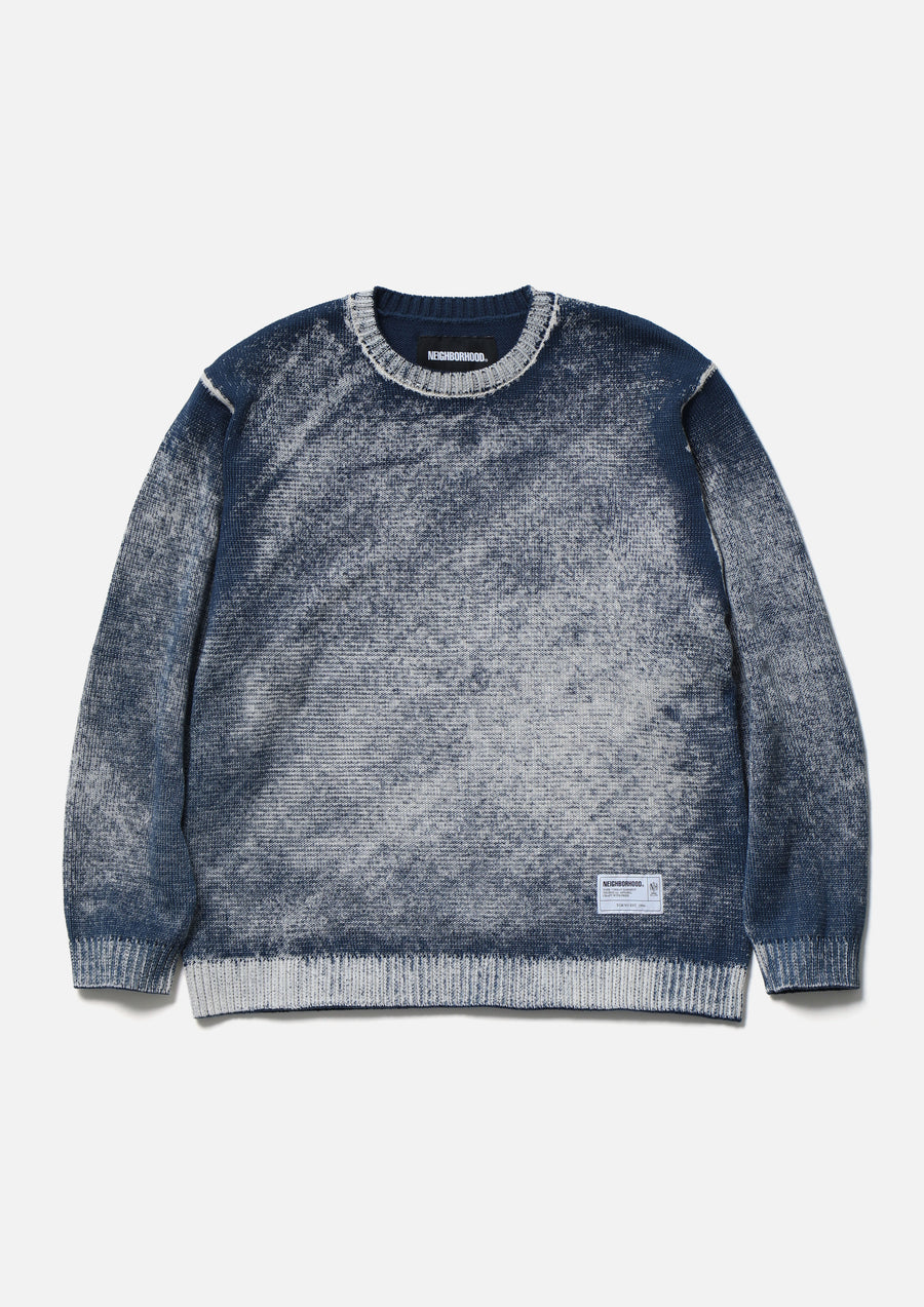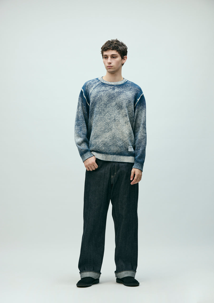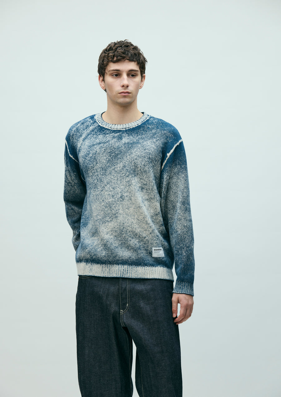 A long-sleeve crewneck knit featuring a pattern created by printing from the reverse side onto the knitted parts, allowing the ink to permeate and appear on the front.
