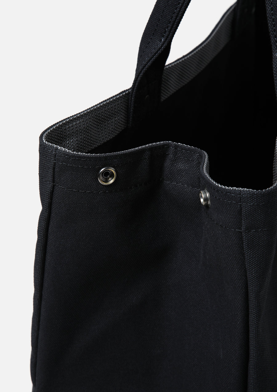 Trunk bag made from durable cotton canvas. A collaborative model based on the Team Ikuzawa original designed by Creative Director Ramdane Touhami, featuring black canvas fabric with matte black rivets and snap buttons. Equipped with an interior pocket and latch belt. Side snap buttons allow the opening to be narrowed for riders. Features high-density printed logos and graphics on both sides.