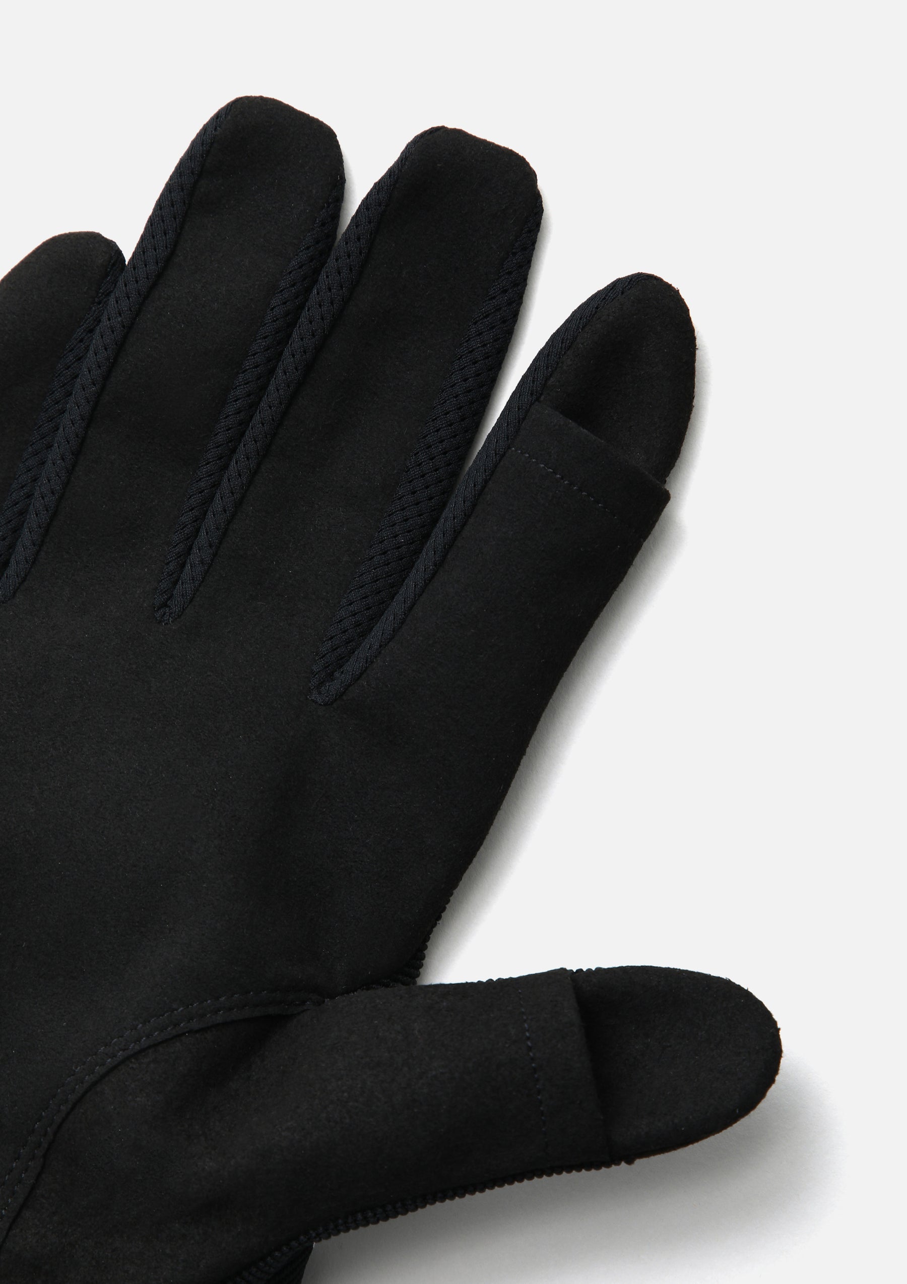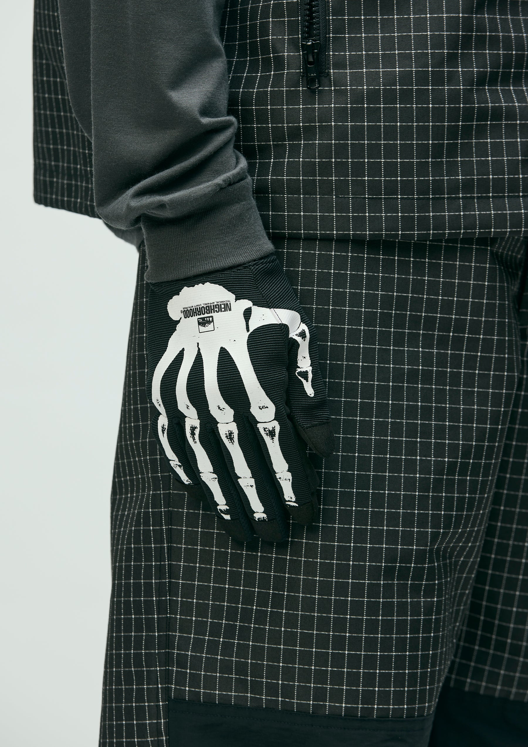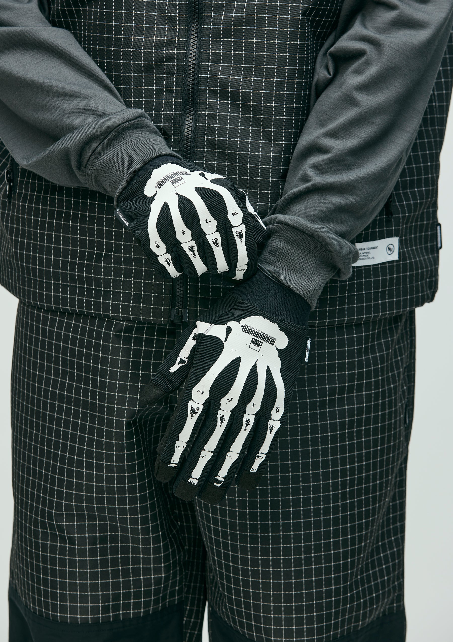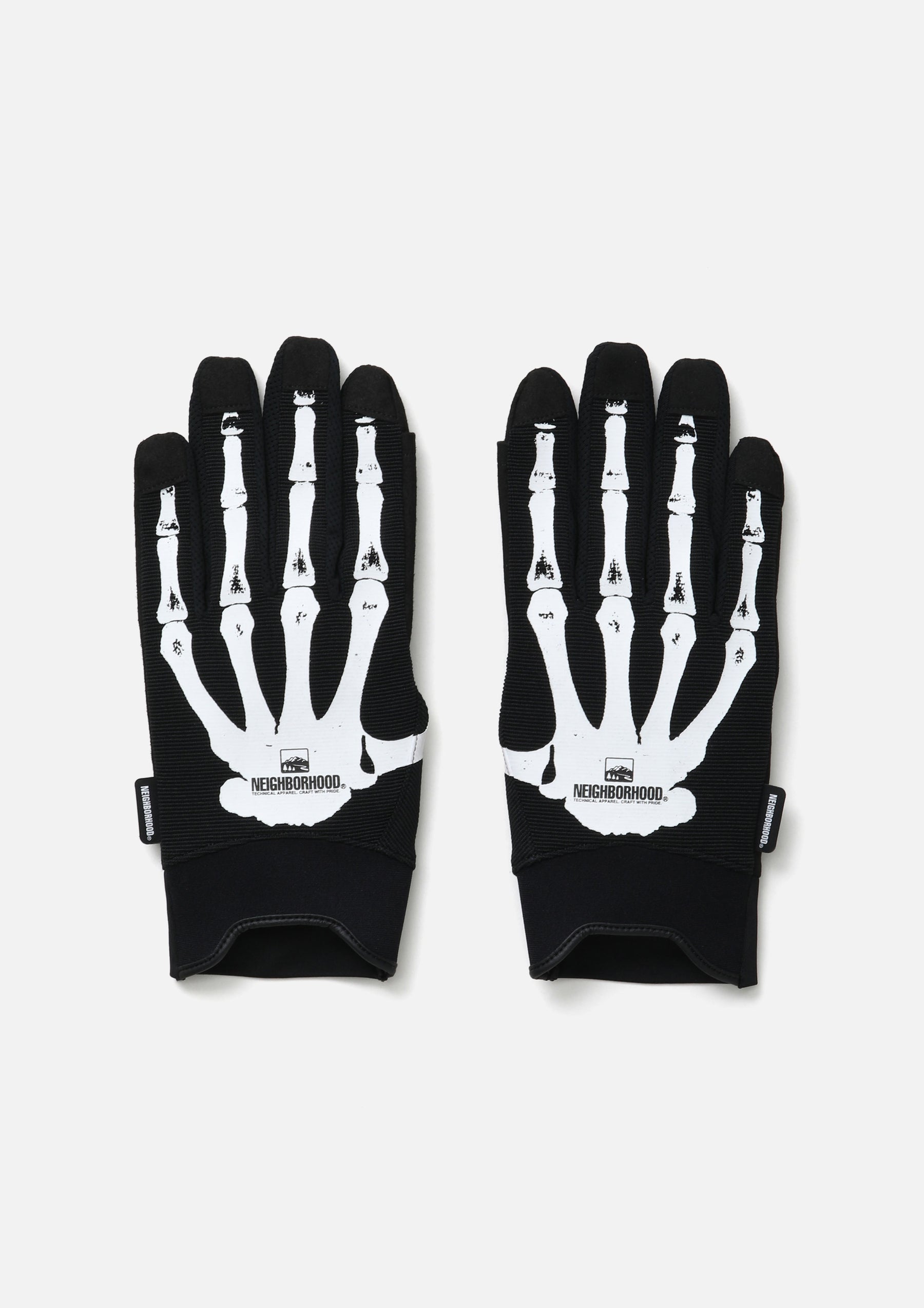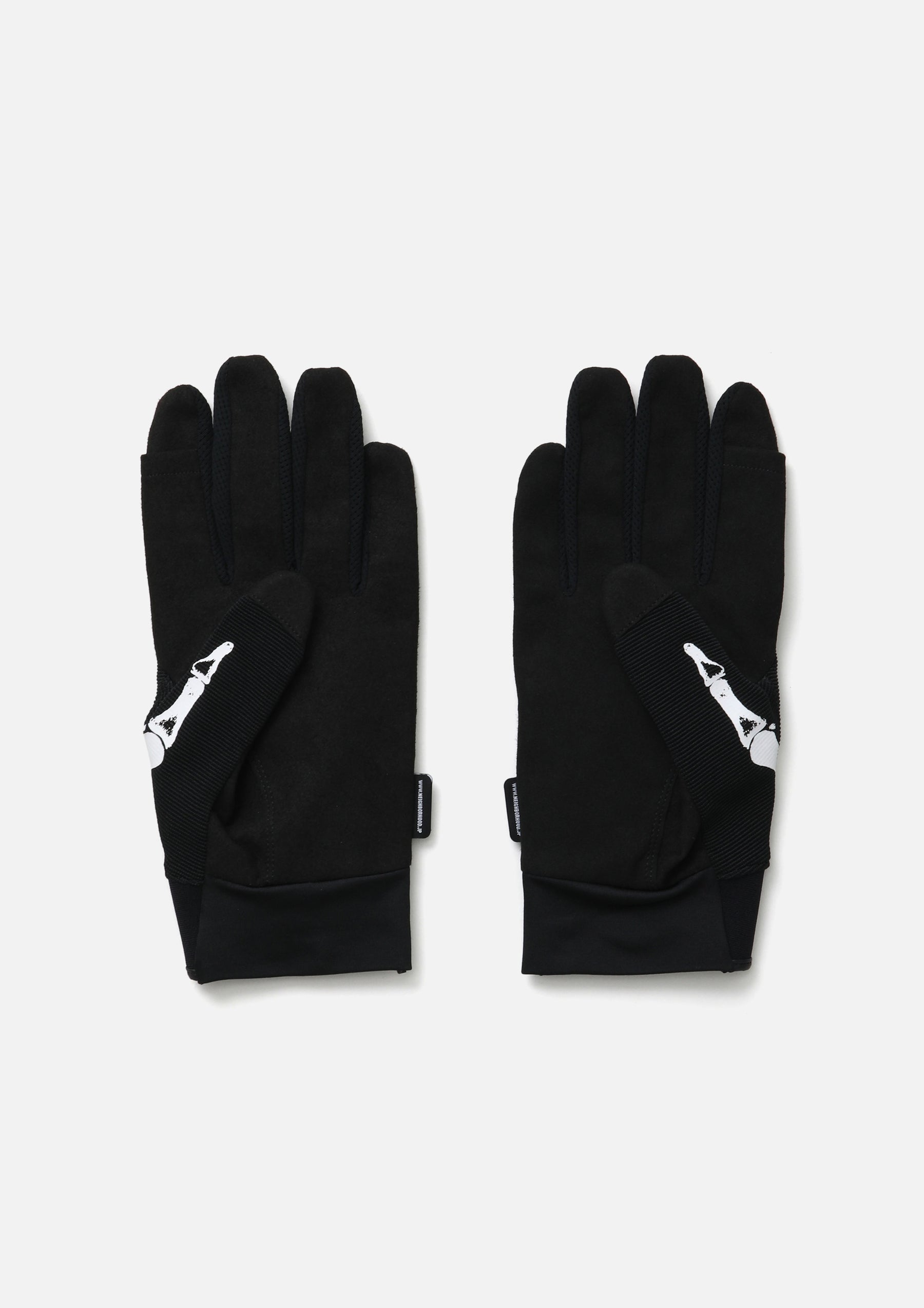 Active gloves designed to protect hands from sunlight and external elements. Feature an open/close design at the index finger and thumb for smartphone use or detailed tasks. Decorated with a bone motif graphic on the back of the hand.