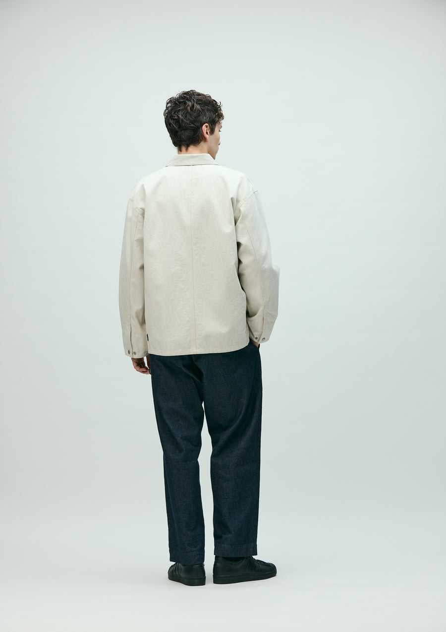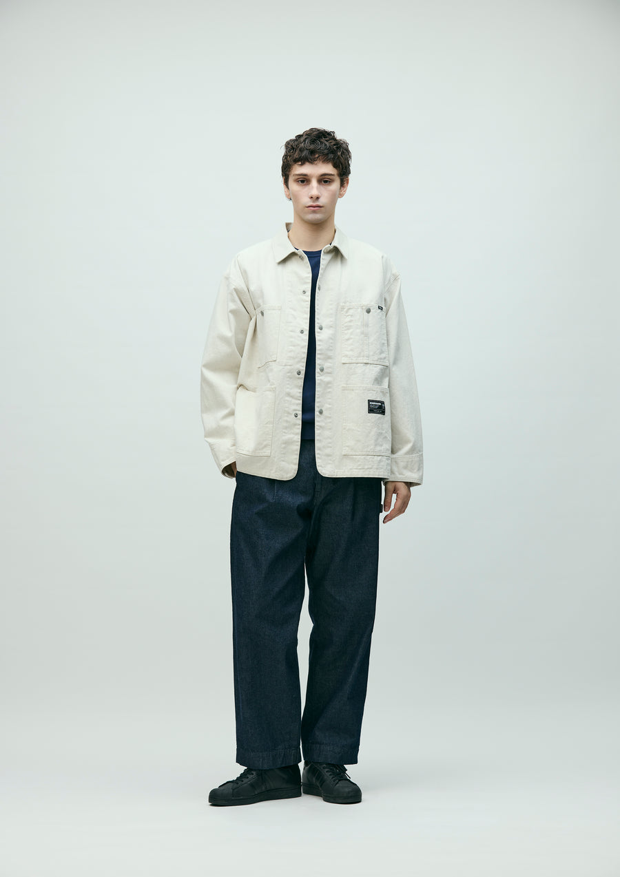 Coverall constructed from an oxford fabric body paired with a cotton piqué collar. Classic details include a pen slot and watch pocket at the chest, as well as triple-stitched flat-felled seams. Features original snap buttons, with a top metal button. A brand tag is attached to the pocket, and a woven side label is placed at the side seam. Finished with a one-wash process.