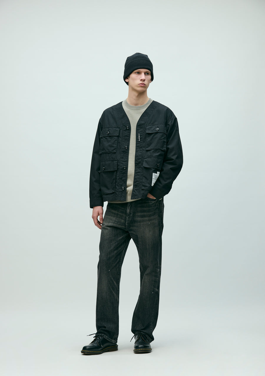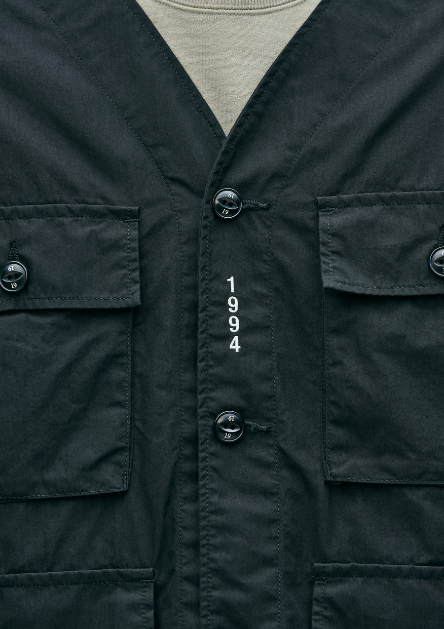 No Collar Utility Jacket made from a blended weather cloth that combines the natural feel of cotton with the structured firmness of nylon. Features“1994” embroidery between the first and second buttons, and four gusseted pockets on the front. Finished with original buttons. A brand tag is attached to the pocket, and a woven side label is placed at the side seam. Completed with a one-wash finish.