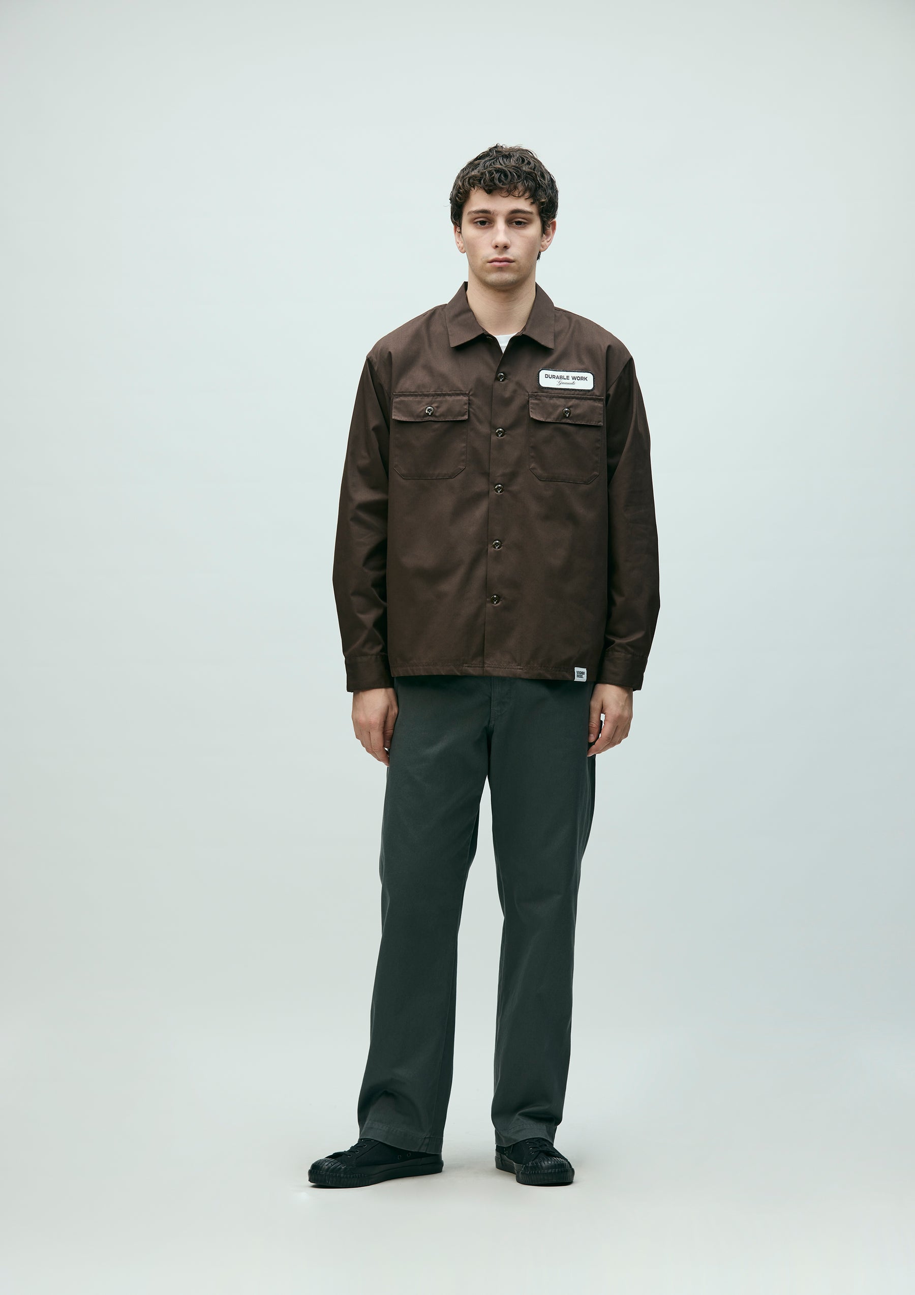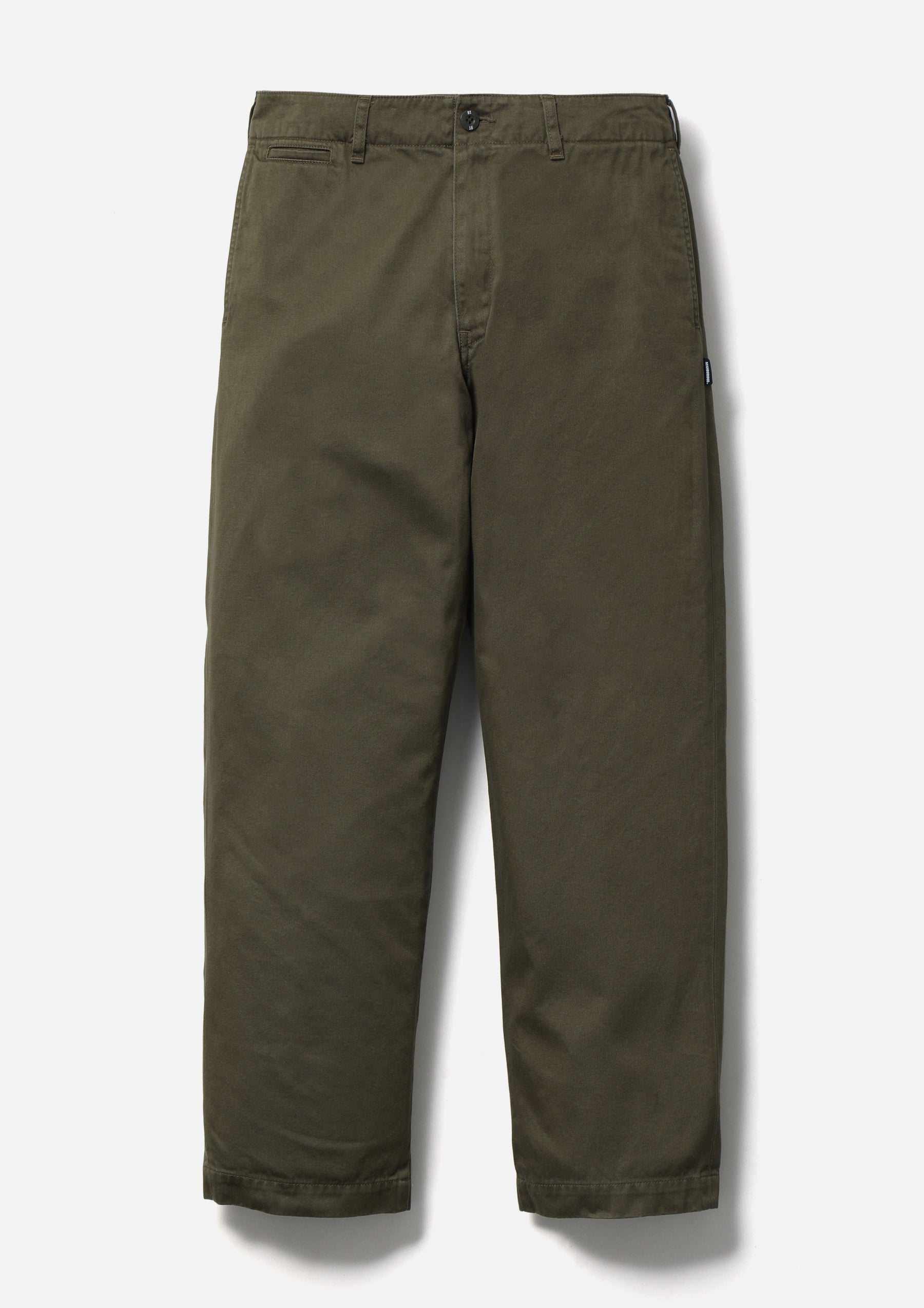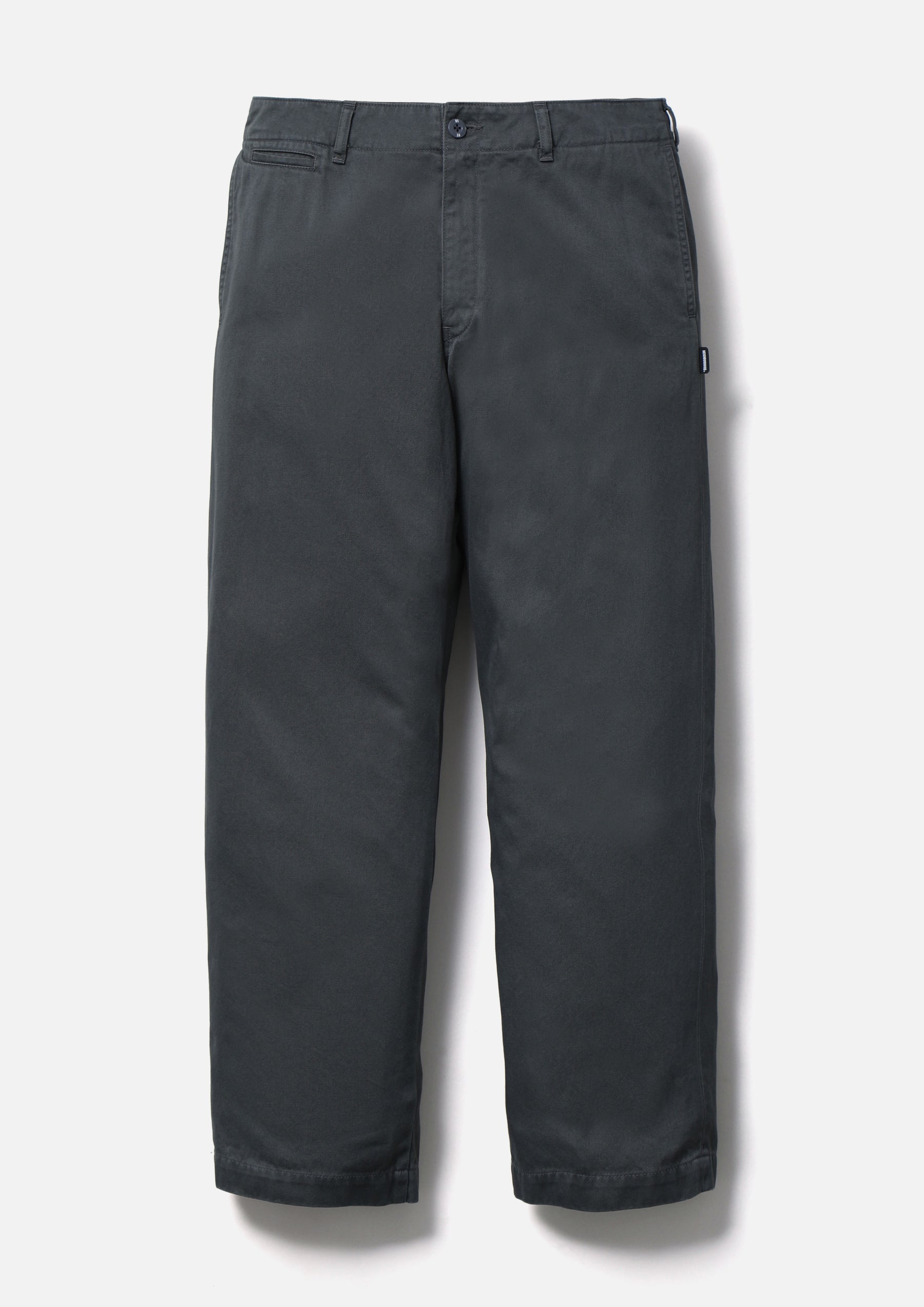 Chino pants crafted from high-density West Point fabric that balances suppleness with durability. Designed with a coin pocket, piped seam finishes, and double-welt back pockets as classic details. Finished with original buttons and zipper pulls. A brand tag is placed above the back pocket, and a woven side label is attached at the side seam. Cut in a relaxed silhouette and completed with a bio-stone wash finish.