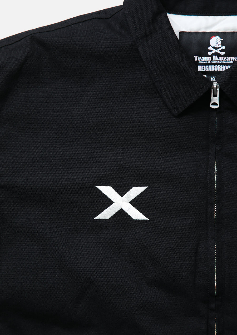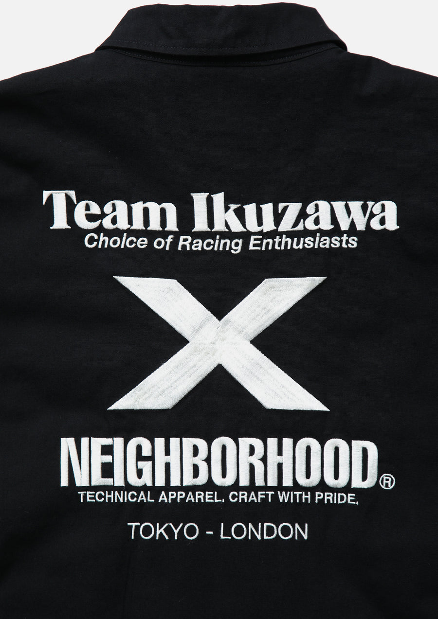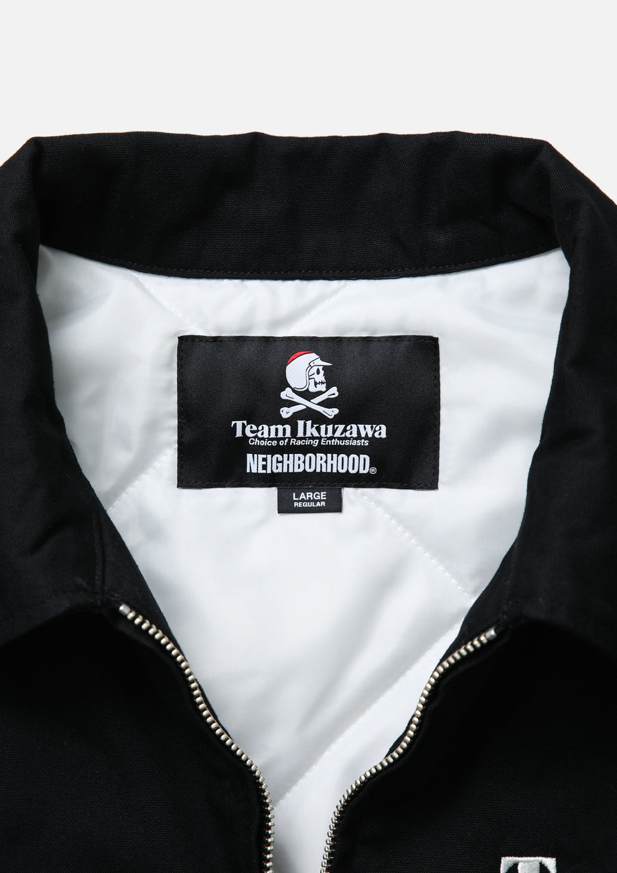 Racing jacket made from oxford fabric. Lined with diamond quilting for heat retention. Logos and graphics are expressed through embroidery. Finished with original buttons and zipper pulls. A woven side label is attached at the side seam. Completed with a one-wash finish. Collaborative model with Team Ikuzawa.