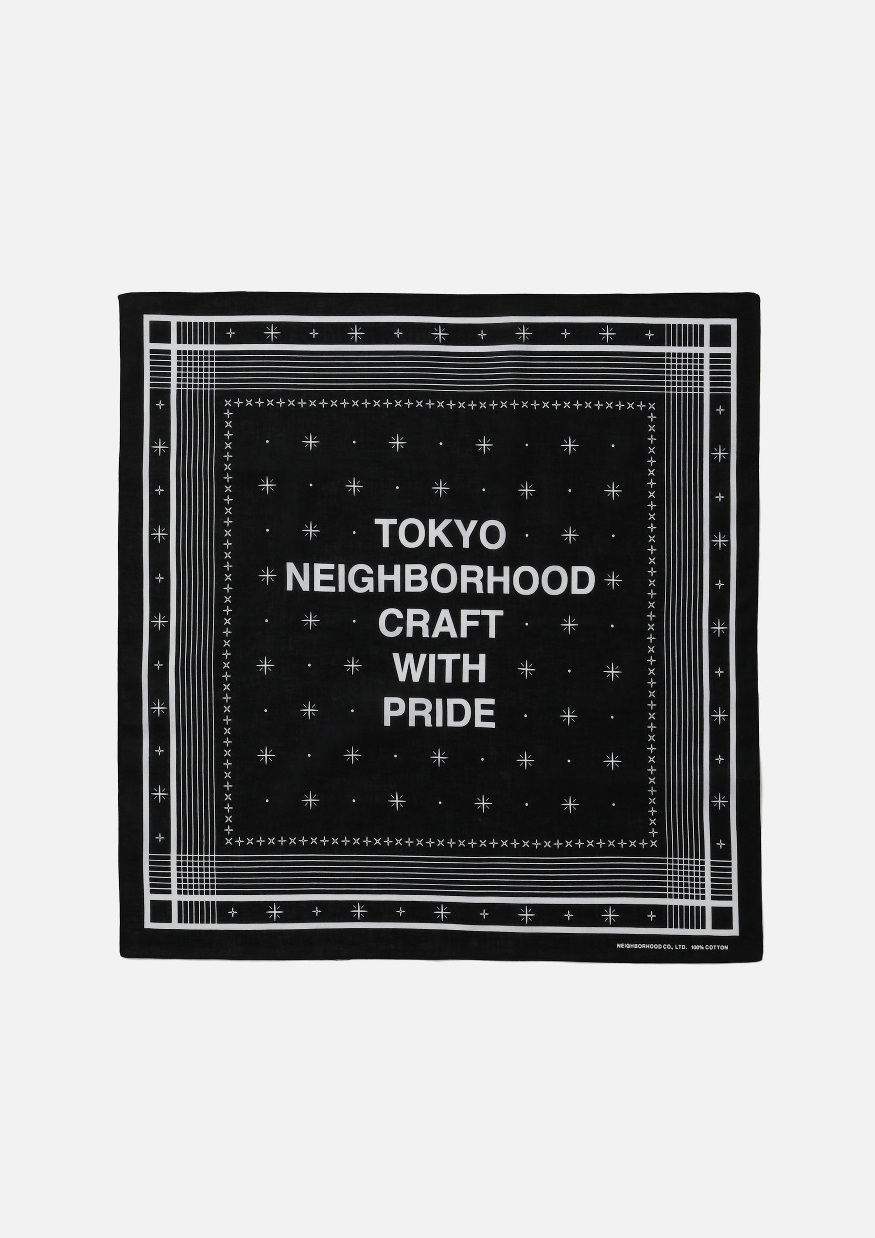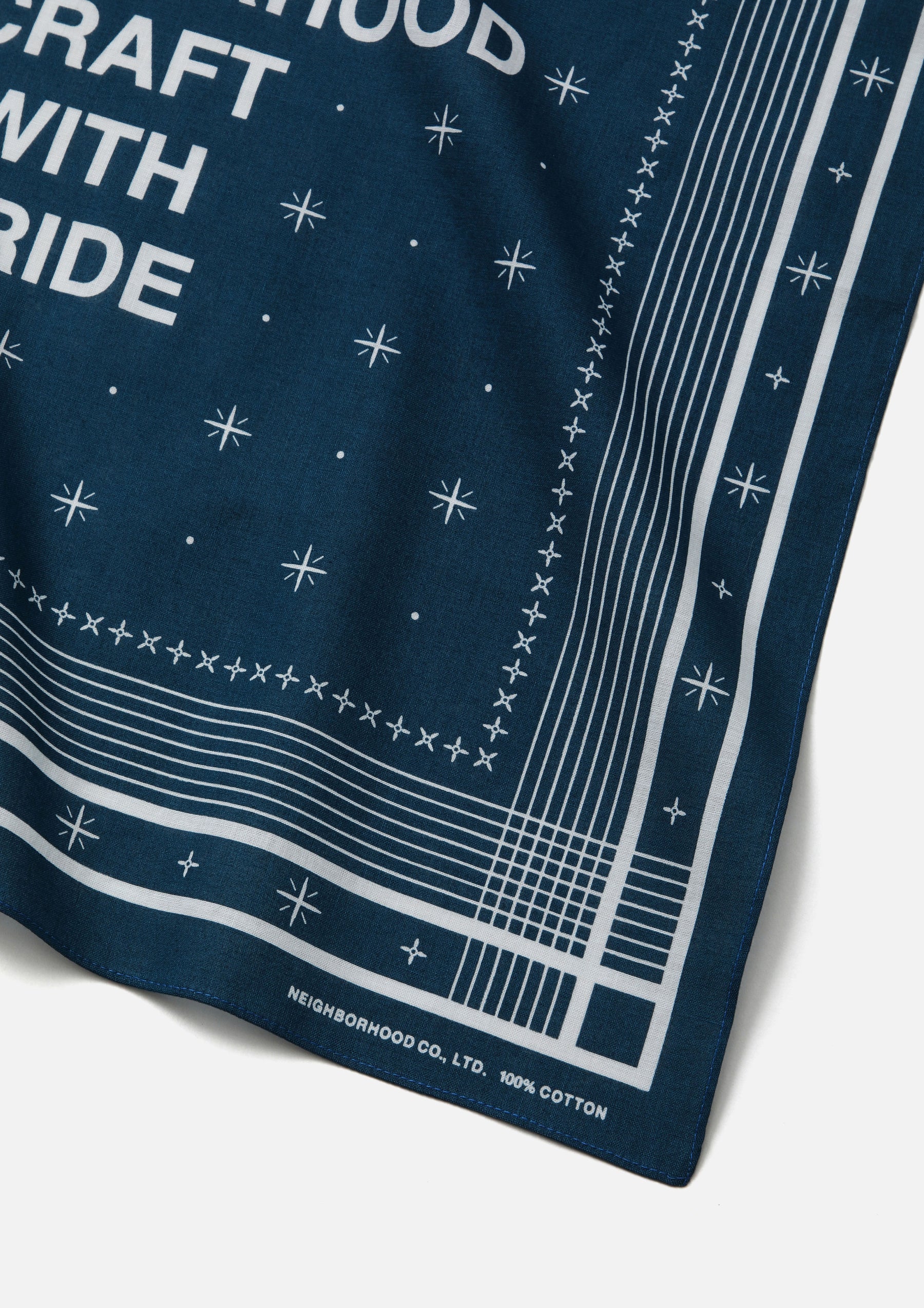 Bandana made from cotton compas fabric. Features an original line pattern print, with rolled-hem stitching at the edges.