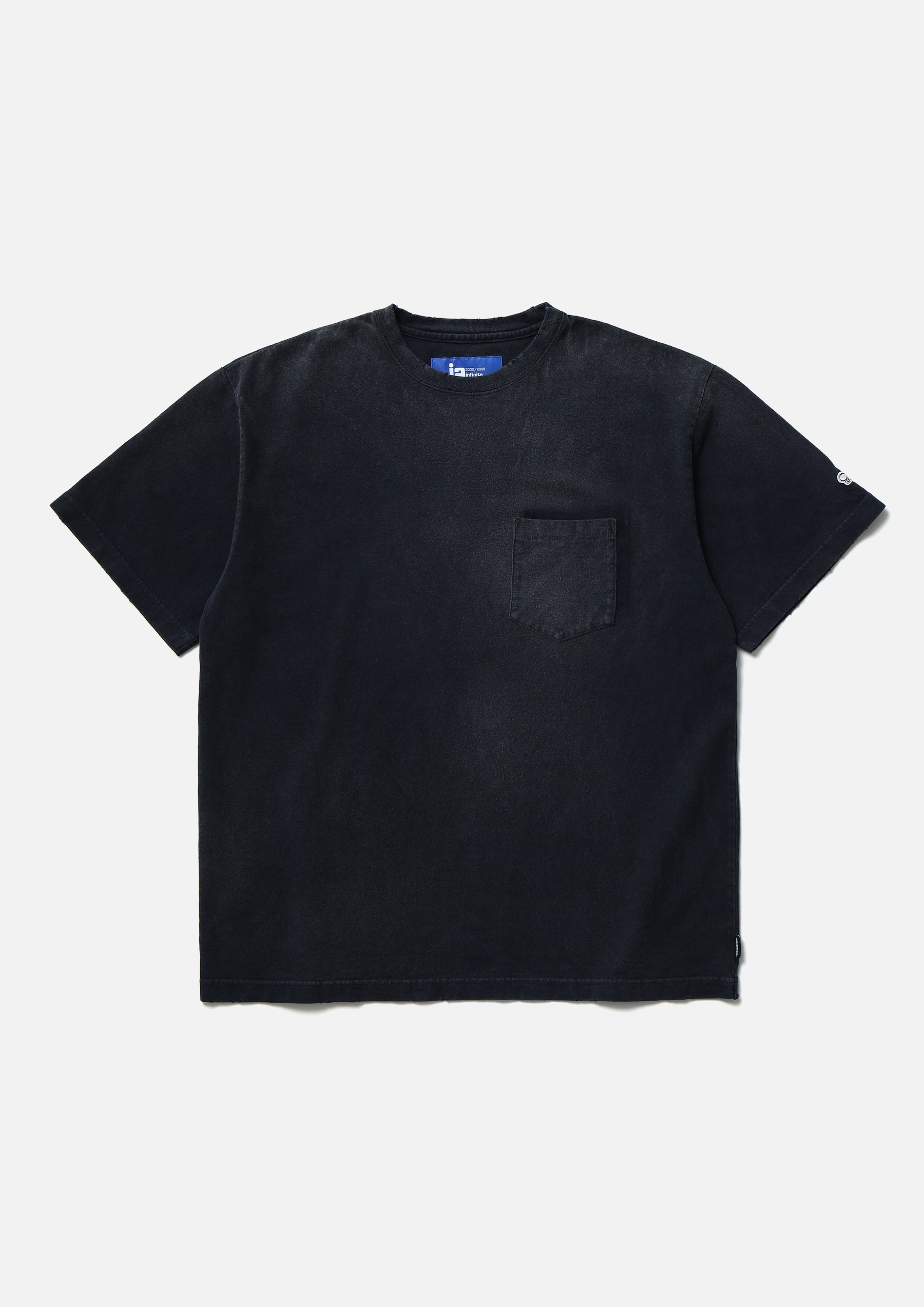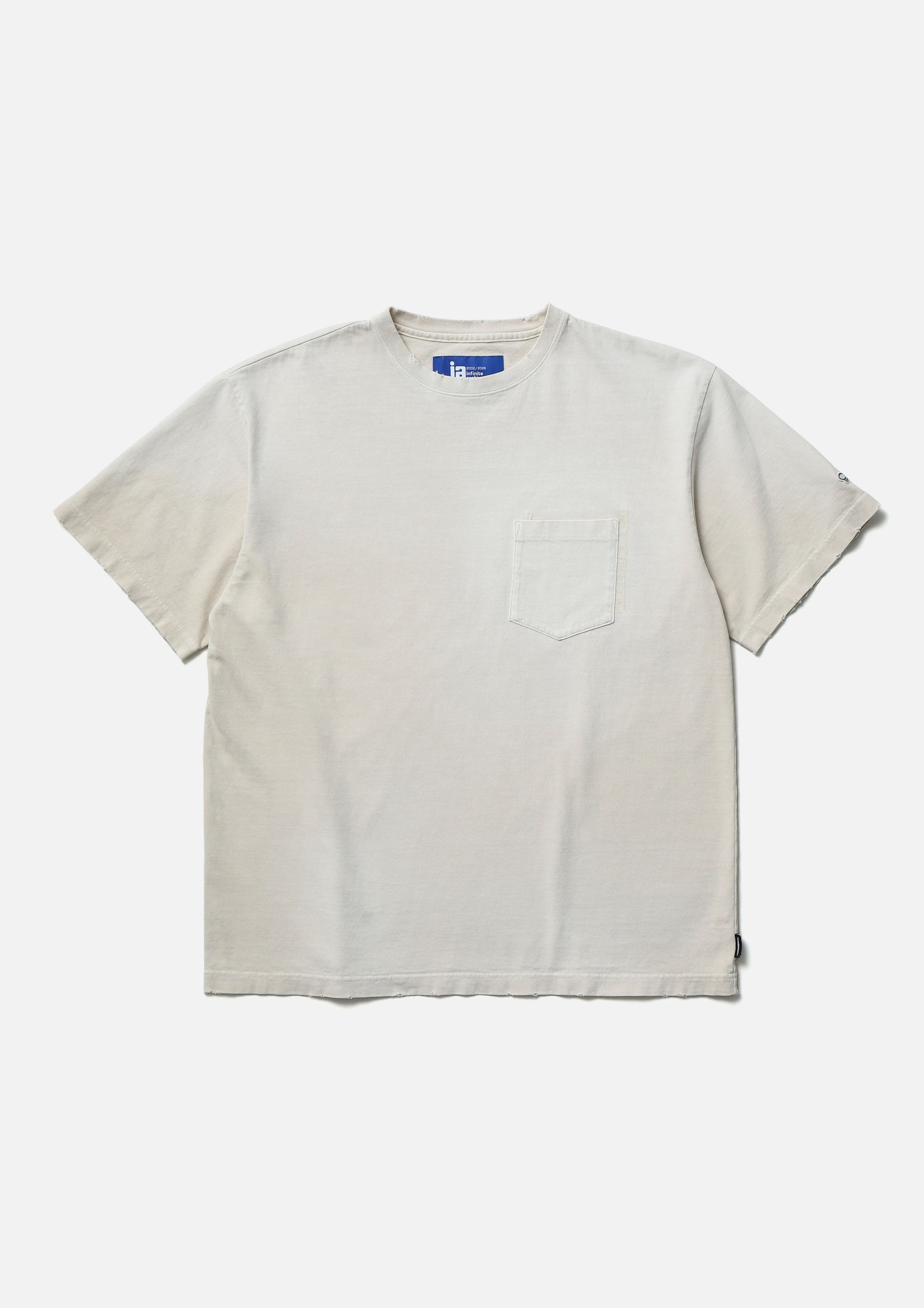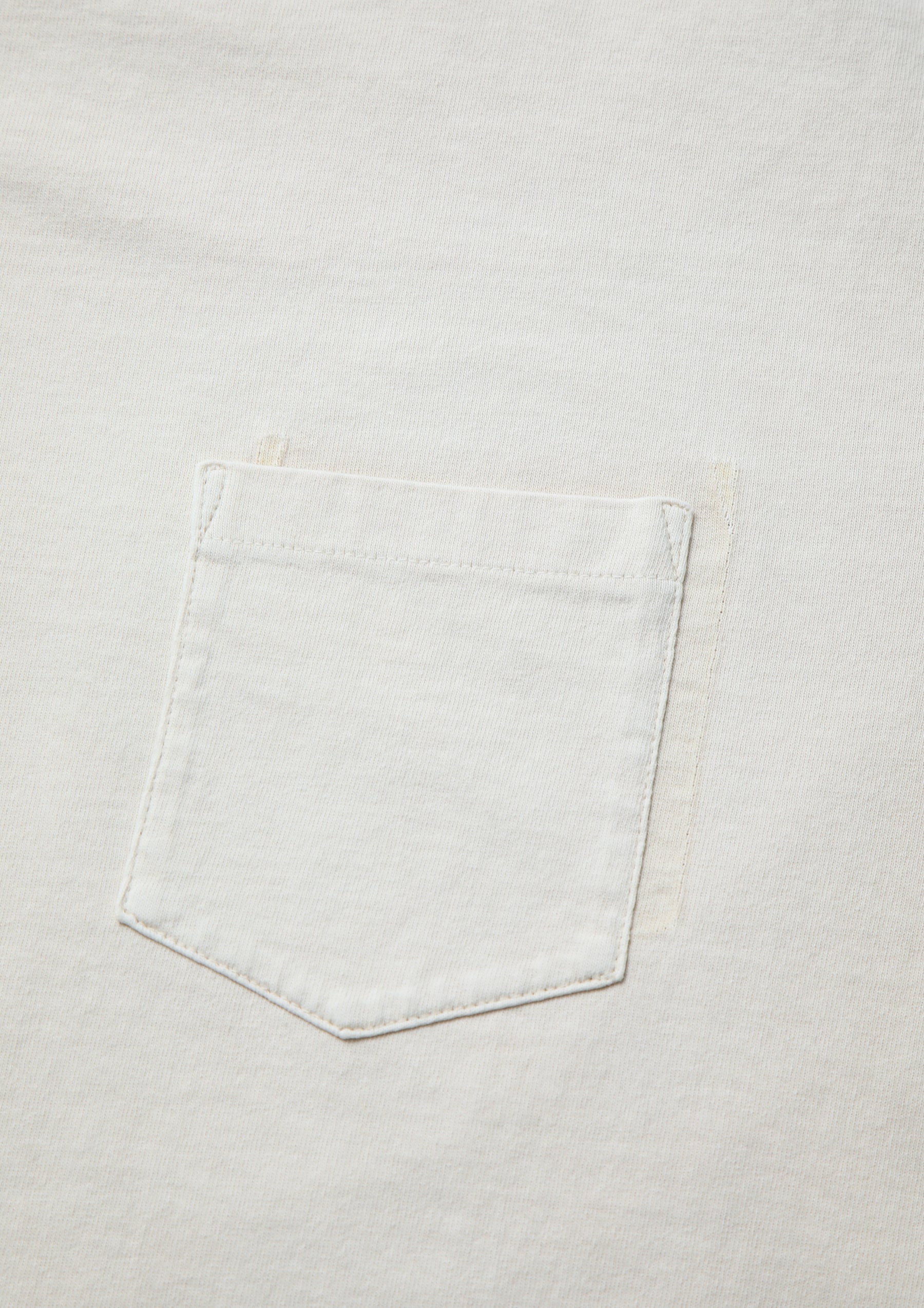 Crewneck cut-and-sew top crafted from organic cotton jersey and finished with a distressed (savage) treatment. A combination of distressing and bleaching techniques creates a realistic aged look, enhanced by a reconstructed detail in which the chest pocket is removed and reattached in a shifted position. A logo patch is placed at the cuff, and a woven side label is attached at the side seam.