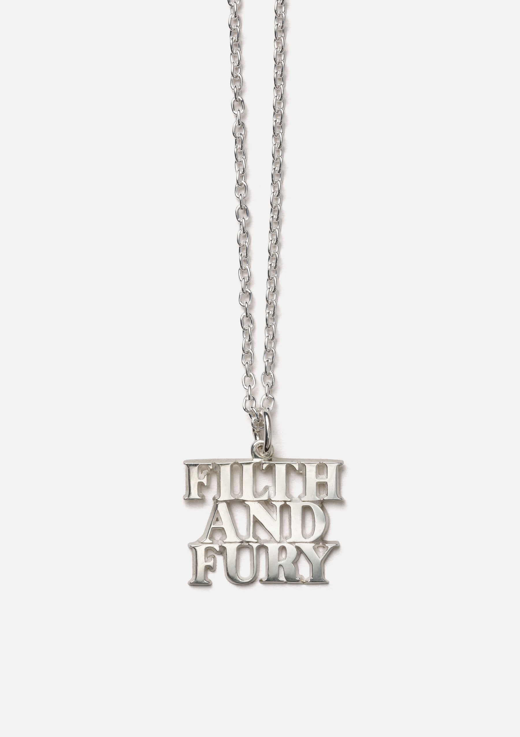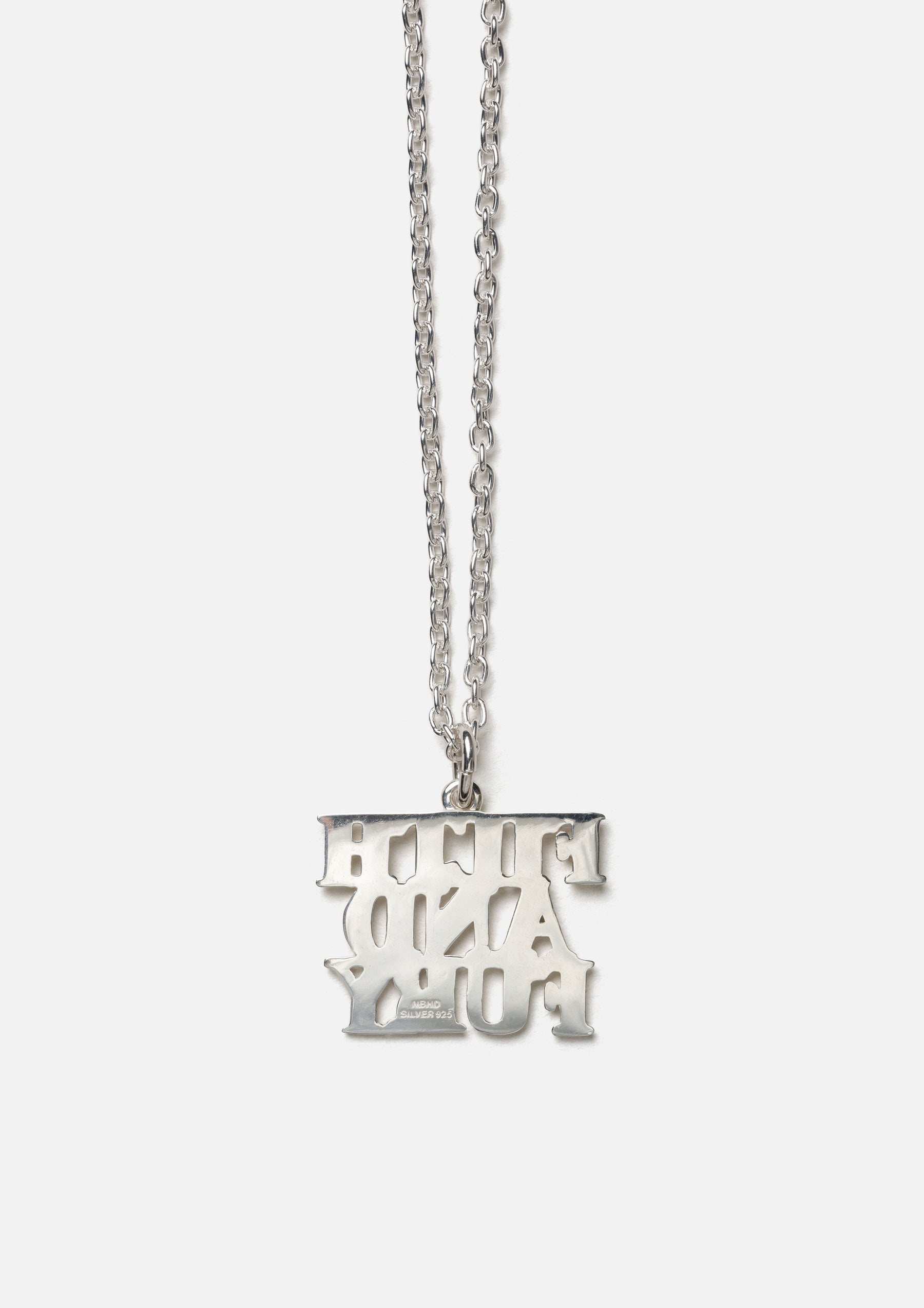 Silver necklace featuring the iconic slogan in a three-dimensional design. Made from SV925 sterling silver with a 1.9mm azuki-style chain. The reverse side is engraved with a logo. Total length: 50cm.