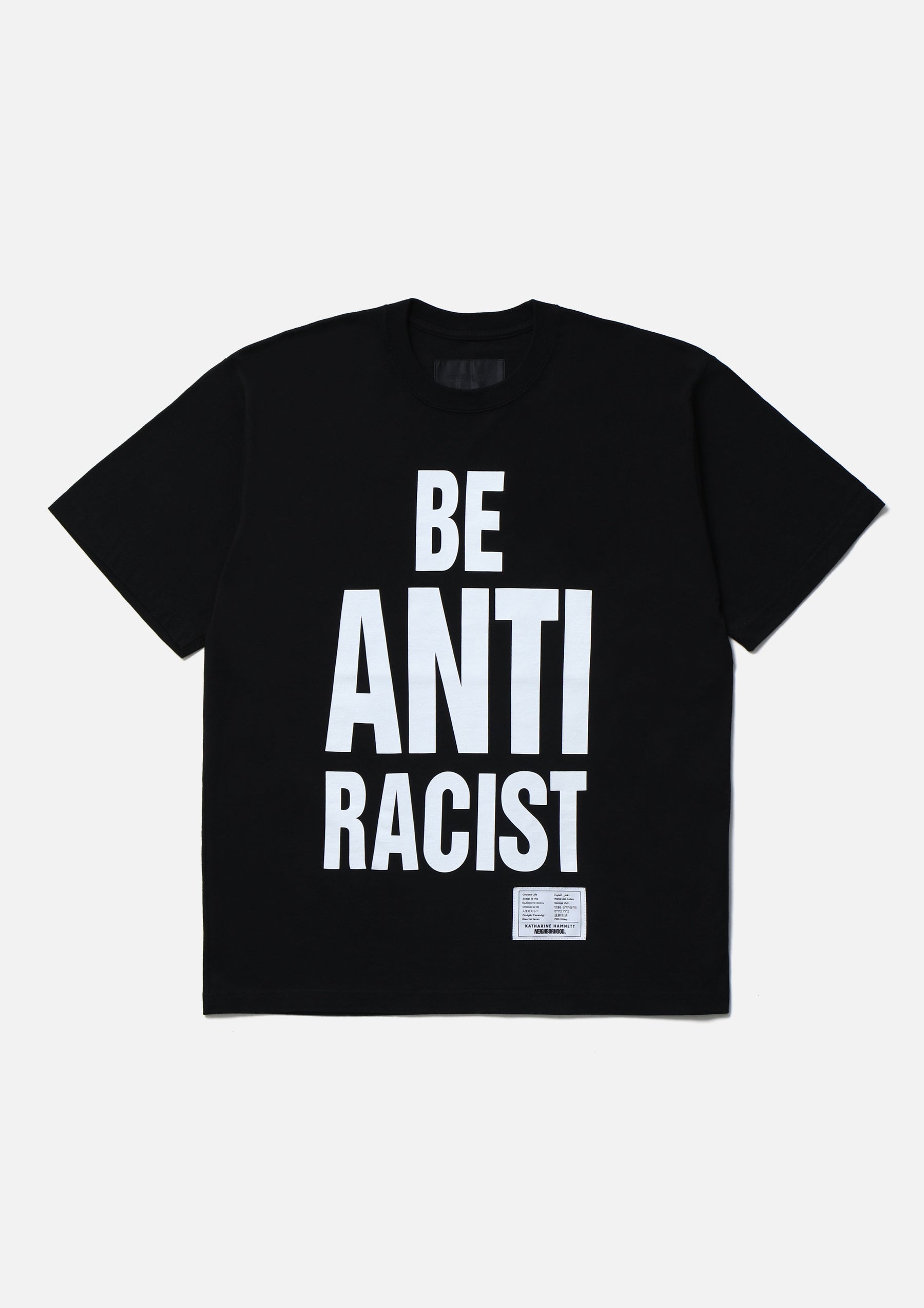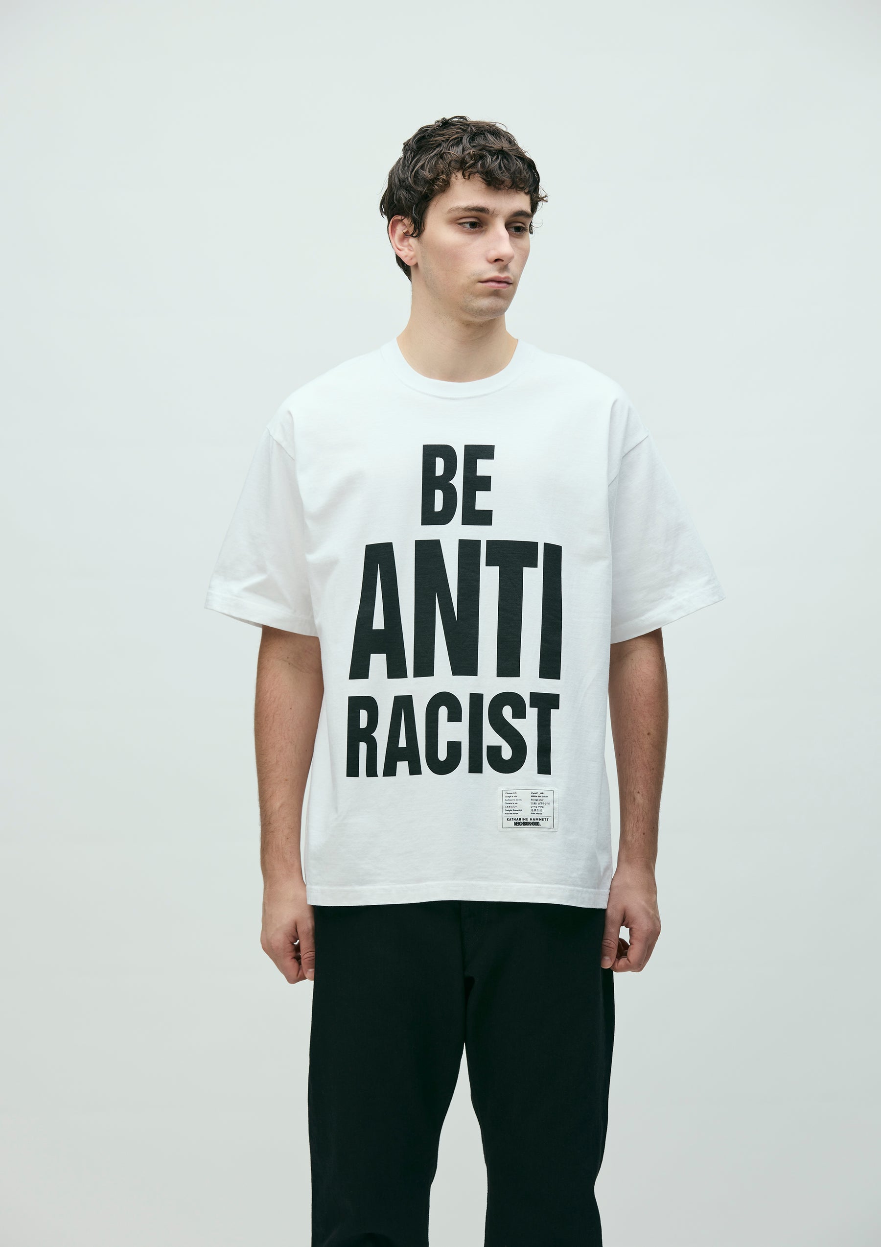 A short-sleeve T-shirt printed with a slogan proposed by KATHARINE HAMNETT. The slogan conveys a message that silence is complicity in discrimination, urging a stance of confronting prejudice. Made from original cotton jersey body. Features a special edition brand tag.