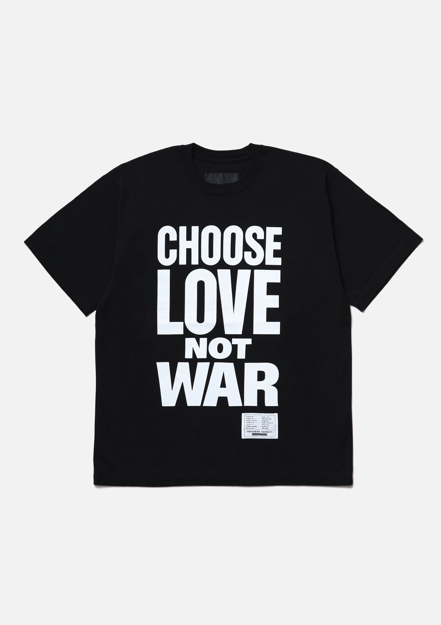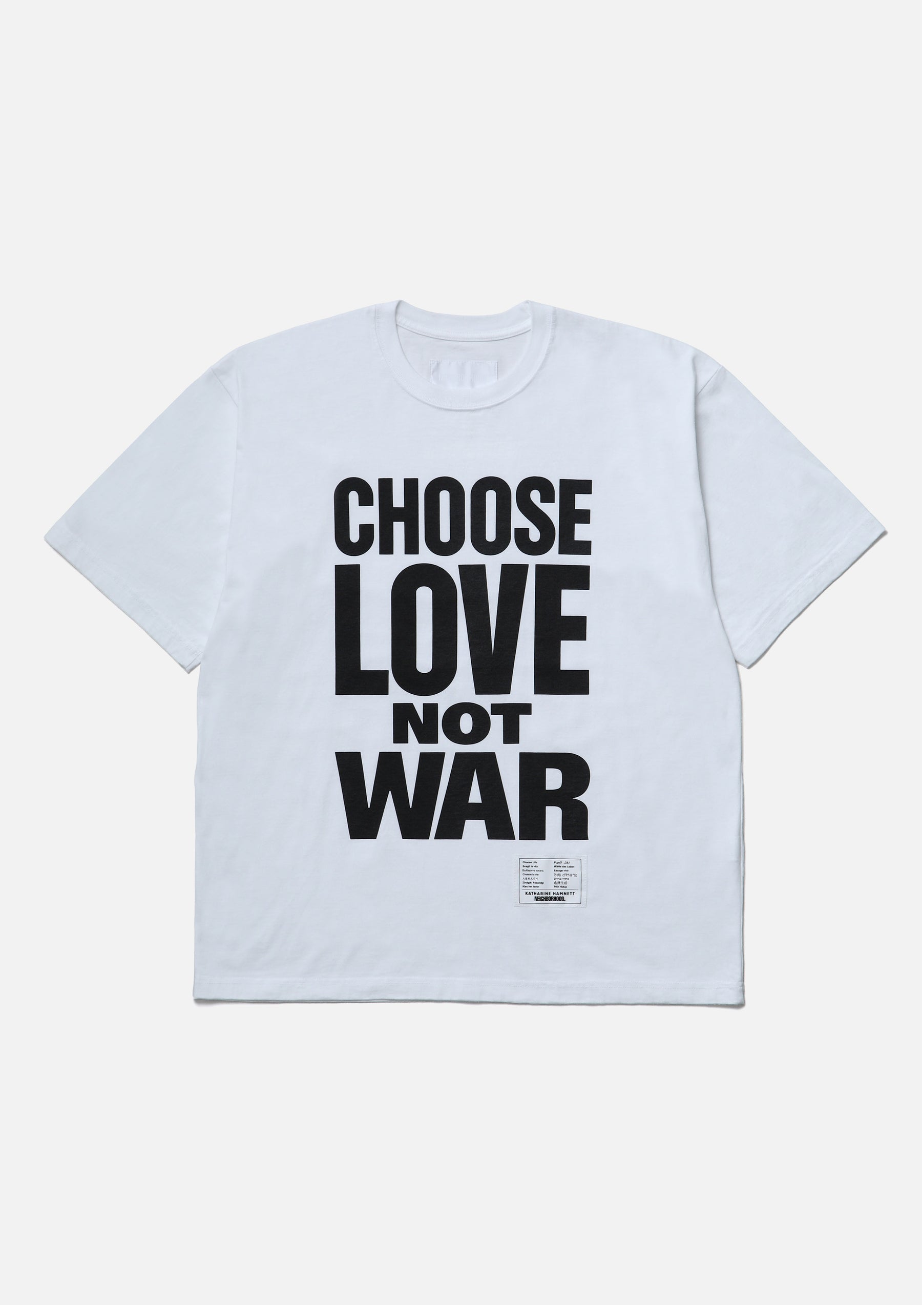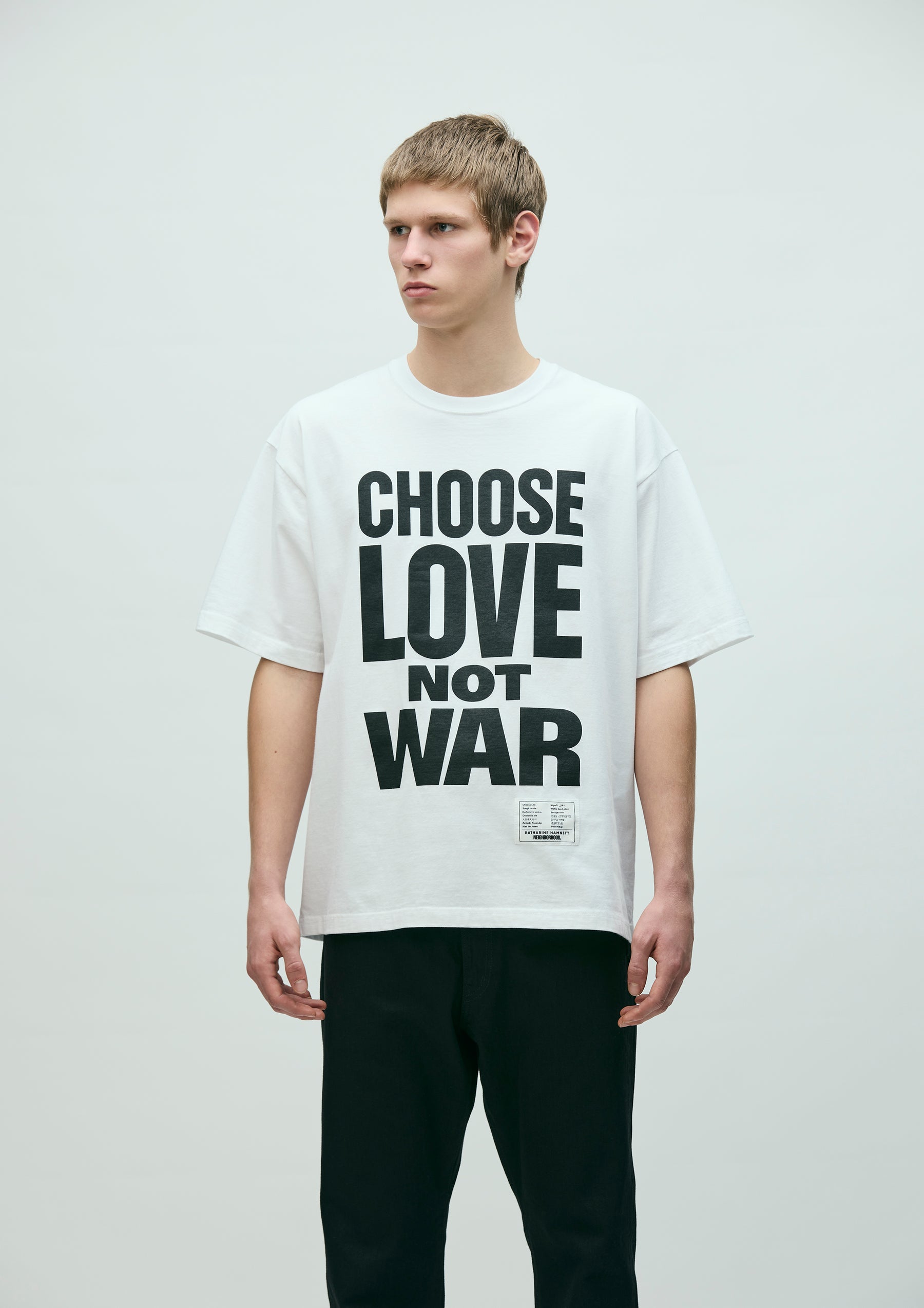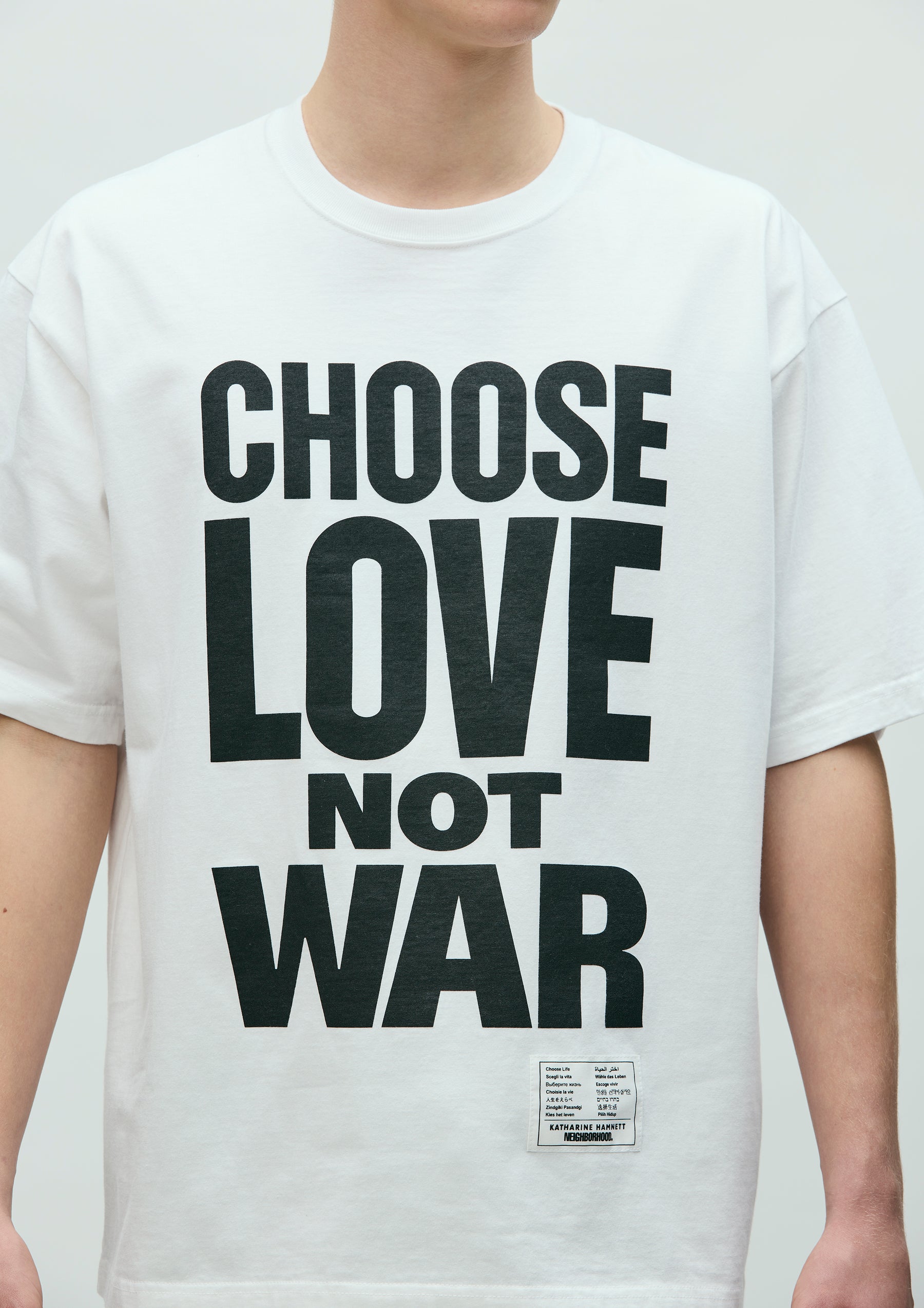 A short-sleeve T-shirt printed with a slogan proposed by KATHARINE HAMNETT. The slogan conveys a message of choosing peace and rejecting war. Made from original cotton jersey body. Features a special edition brand tag.