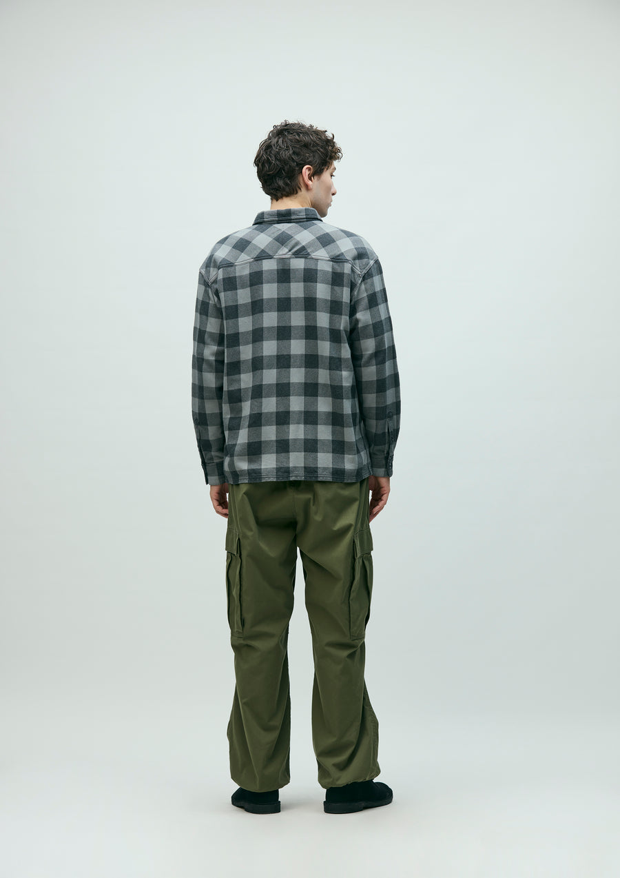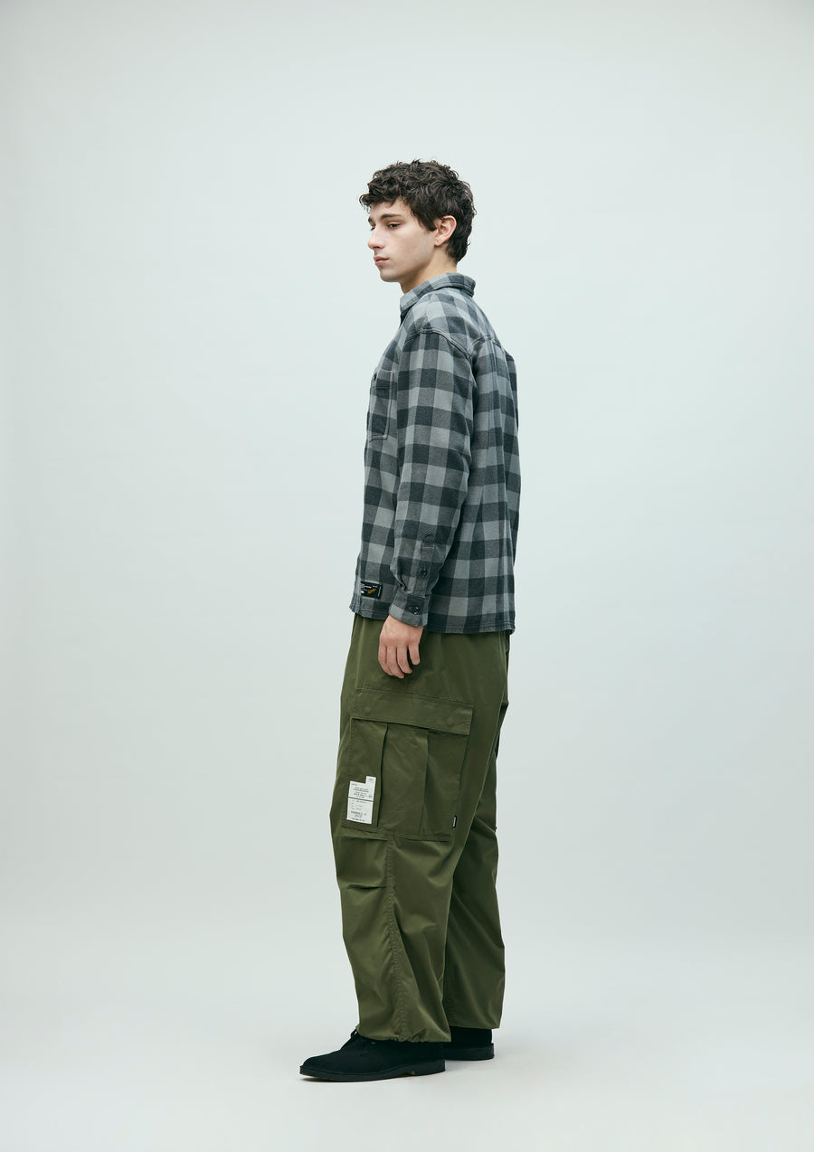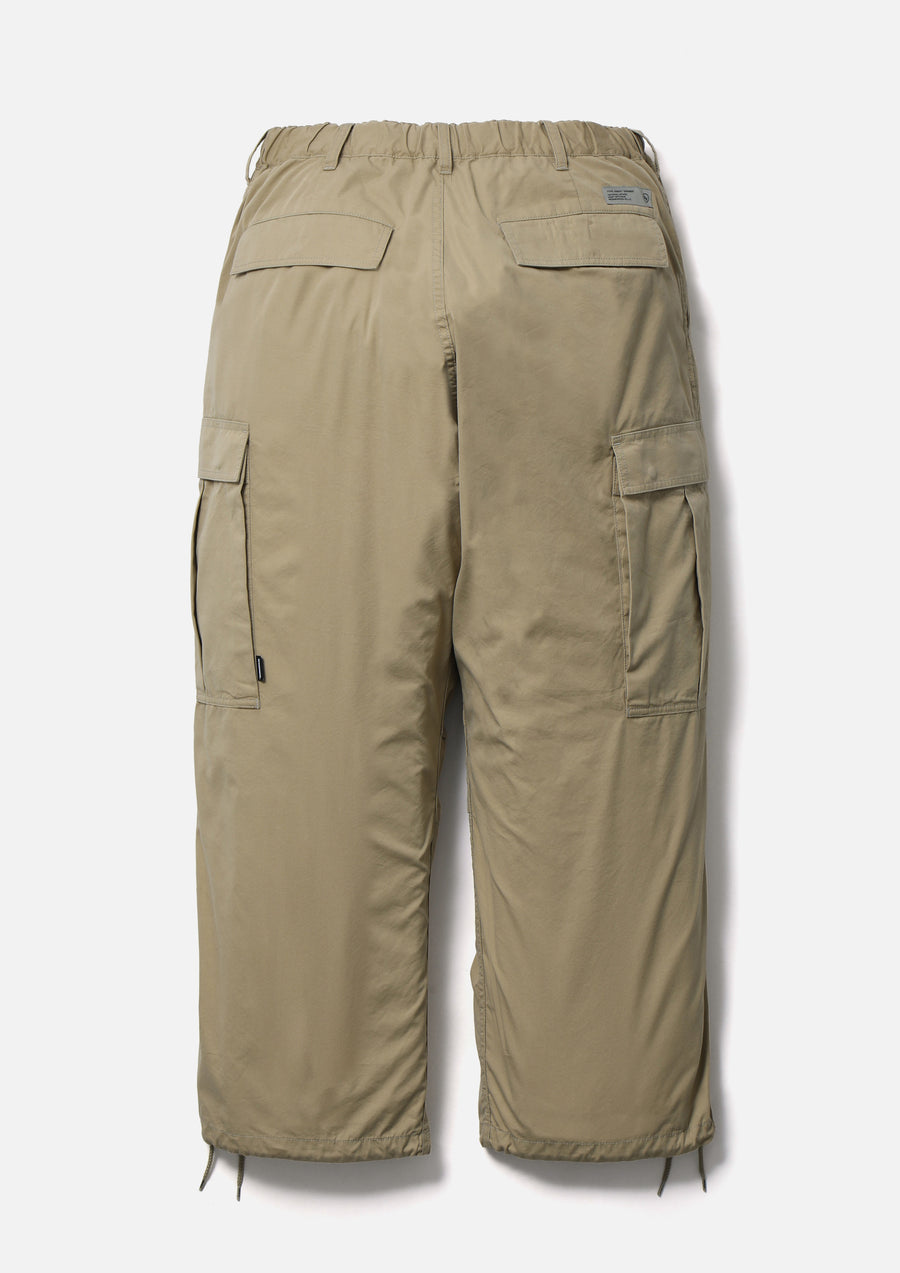 Wide cargo pants made from high-density cotton/nylon blended oxford fabric that offers wind resistance, durability, and lightweight comfort. Designed with an elastic waistband and belt loops for an easy fit. Finished with original snap buttons, zipper pulls, and signature tape. Brand tags are placed on the cargo pockets and above the back pocket, with a woven side label attached next to the cargo pocket. Cut in a generously relaxed silhouette and completed with a one-wash finish.