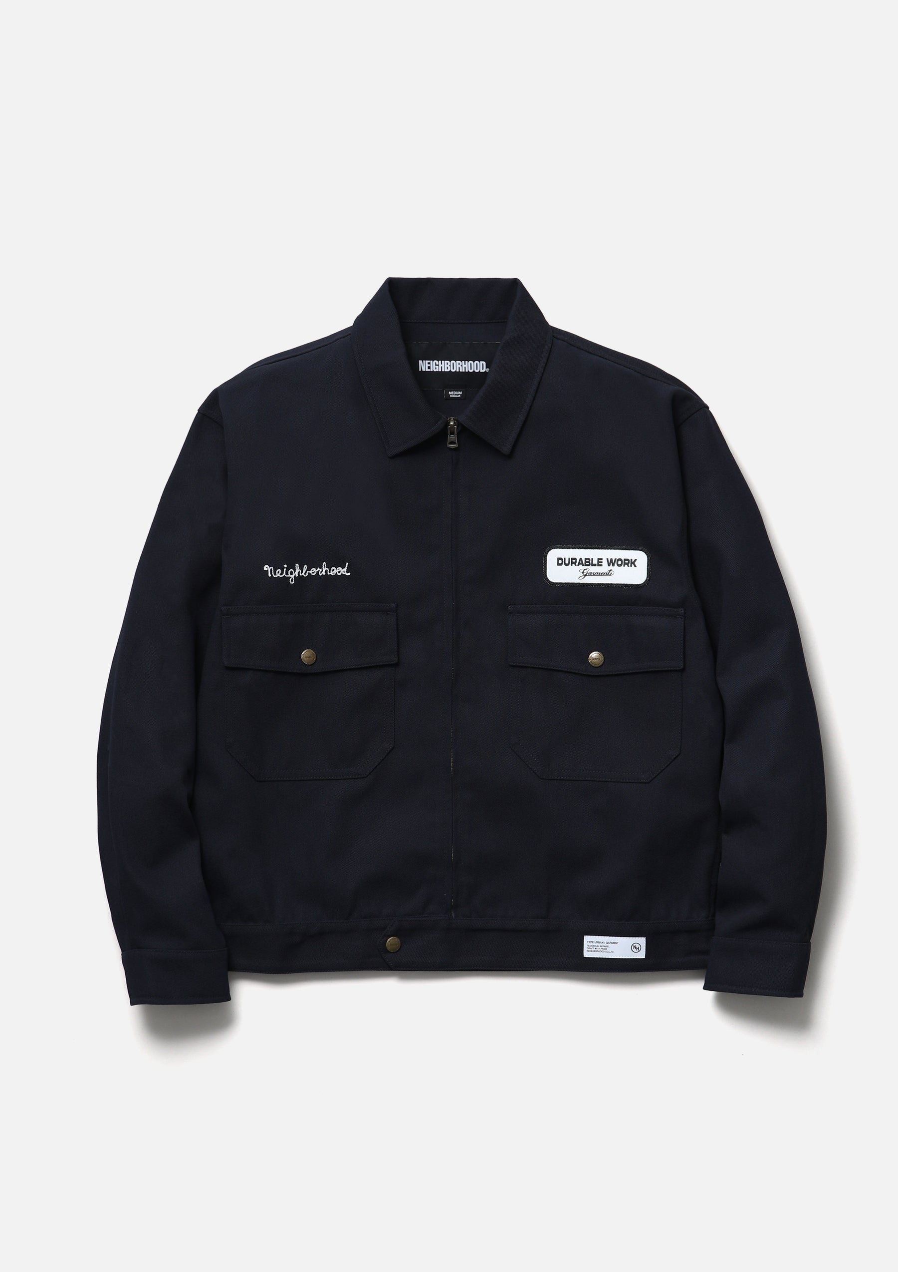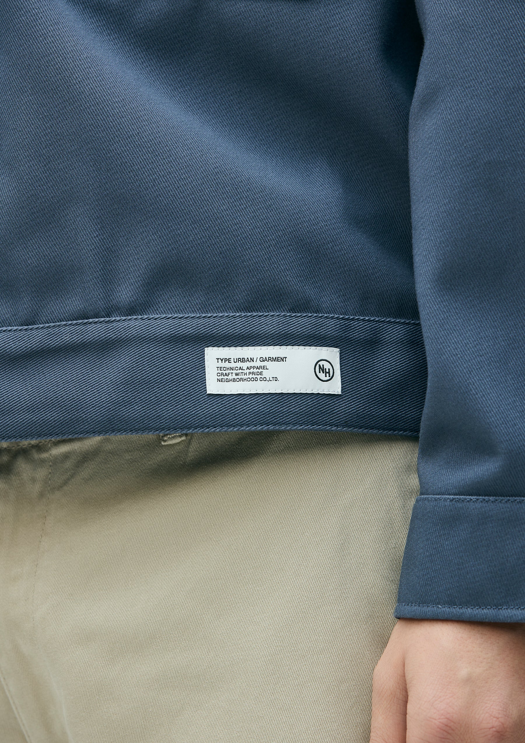 Zip work jacket made from a medium-weight T/C Katsuragi twill fabric with a dry touch and crisp texture. Features buttoned flap pockets on the front and distinctive adjustable tabs on the waistband. Detailed with chain embroidery on the right chest and a printed patch on the left chest. Finished with original snap buttons and zipper pulls. A brand tag is placed at the left hem, and a woven side label is attached at the side seam.