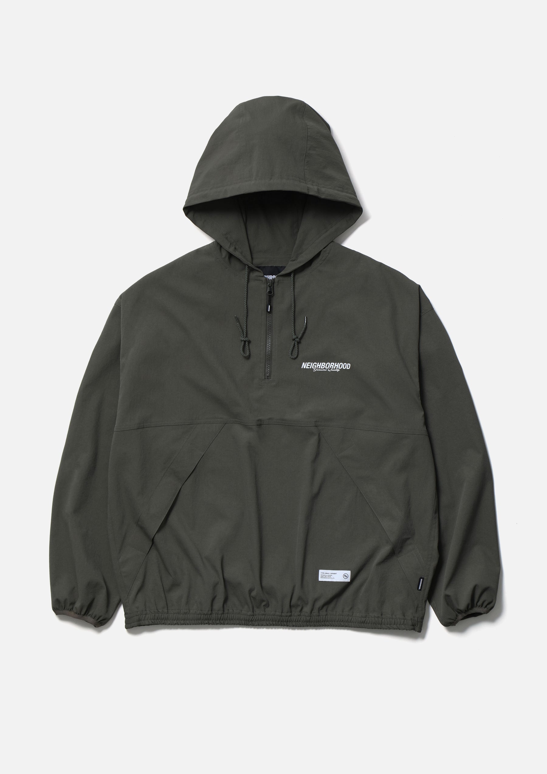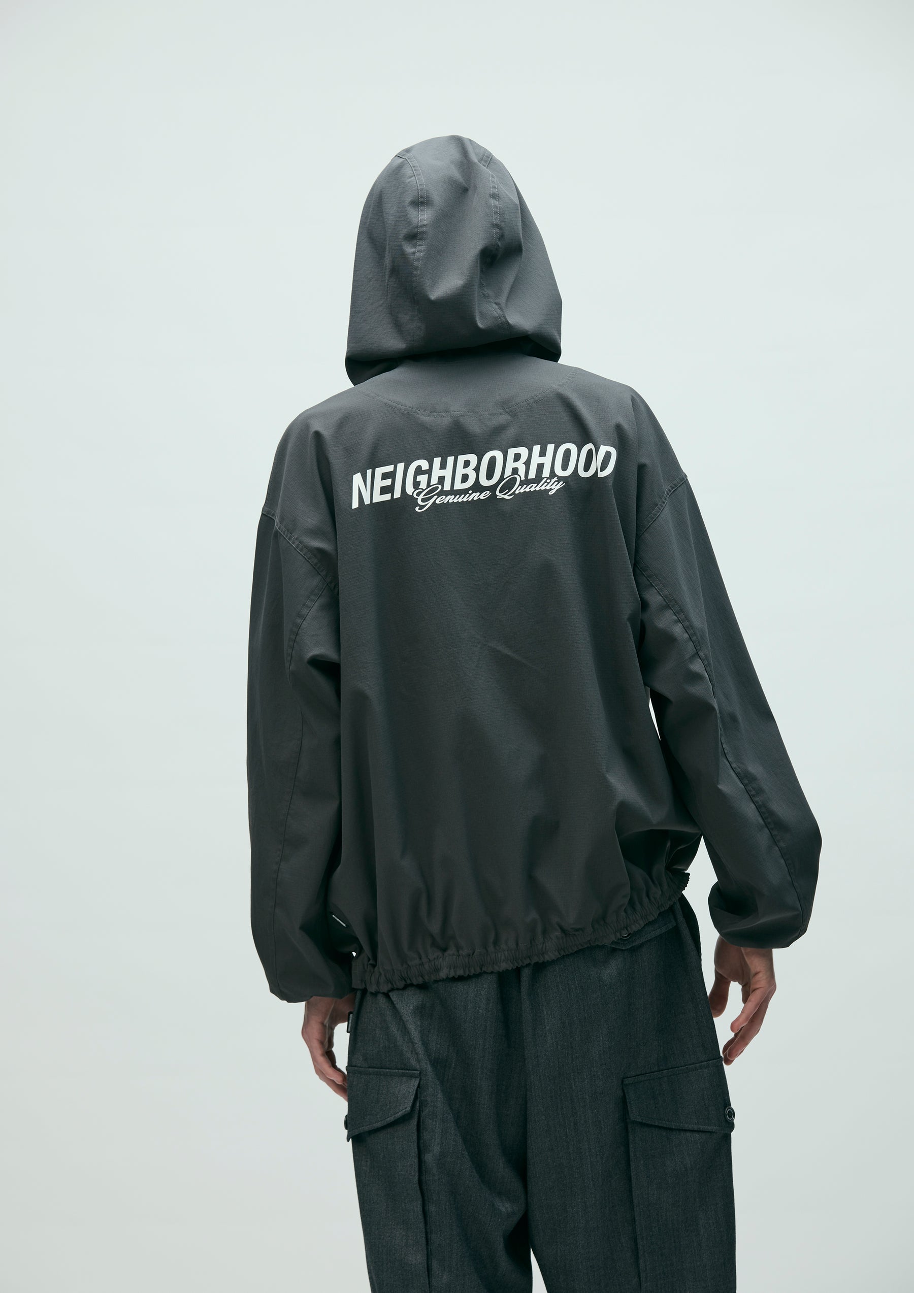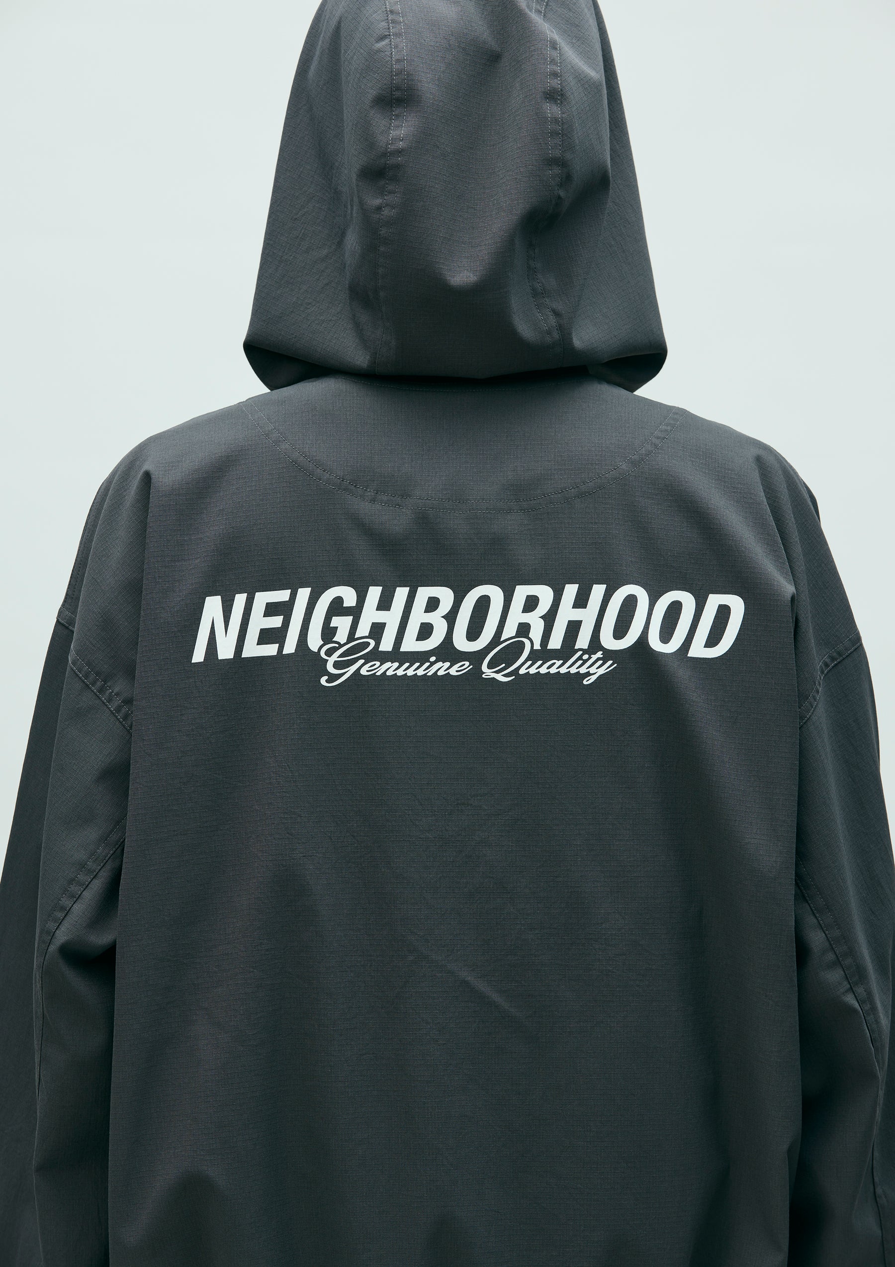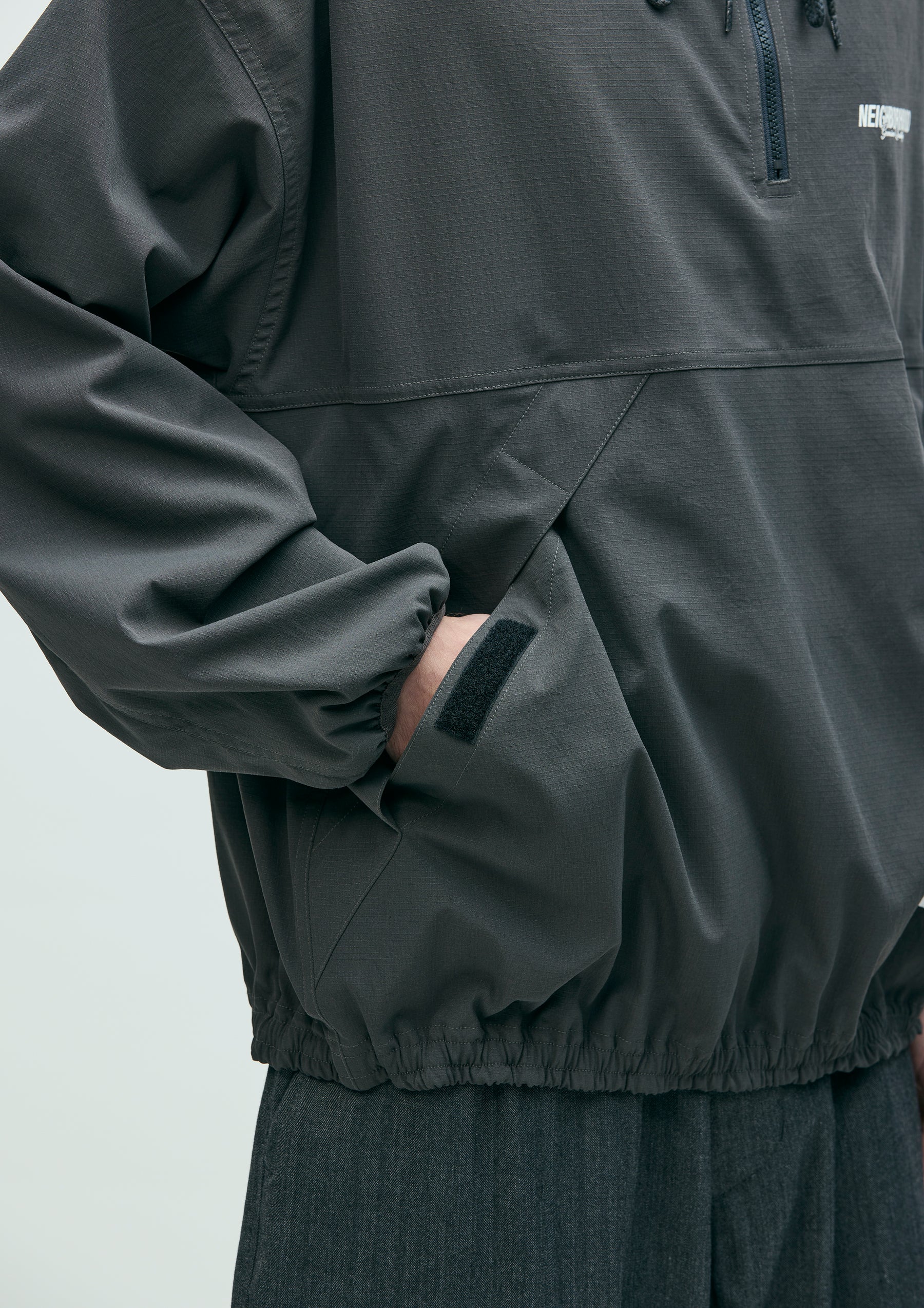 Anorak jacket made from medium-weight ripstop nylon with a cotton-like texture and a firm, structured feel. Made from a high-performance material that offers excellent stretch and superior water repellency, due to a convex structure inspired by traditional rain capes that allows water droplets to slide off. Features a large flap kangaroo pocket at the front, printed logos on the left chest and back, and an adjustable hood drawcord. A brand tag is placed at the left hem, and a woven side label is attached at the side seam.