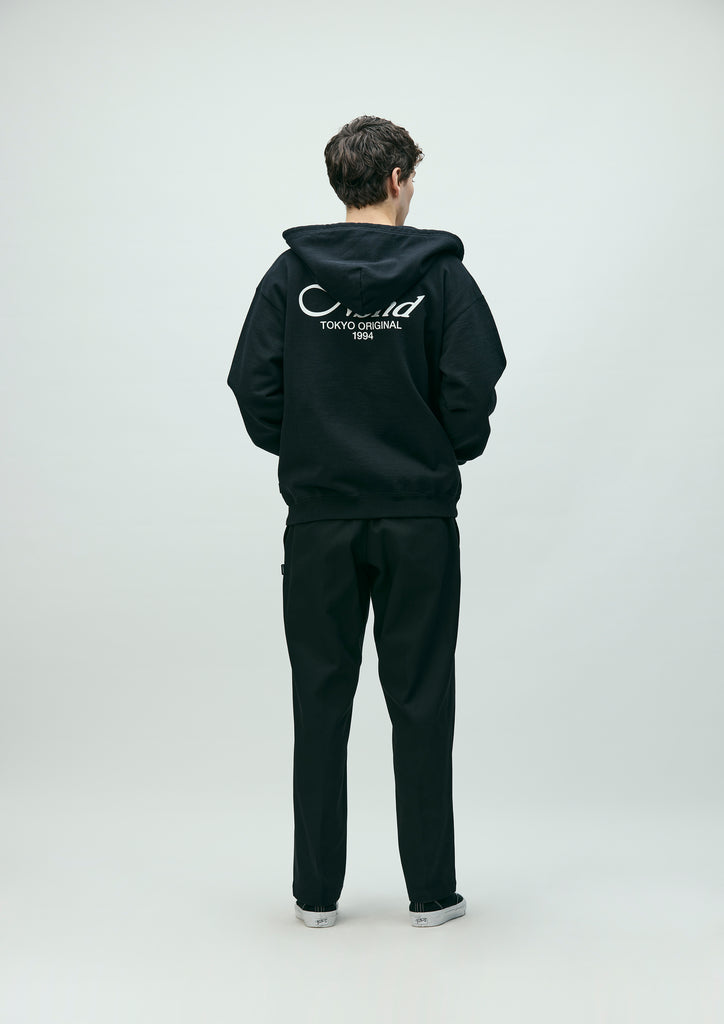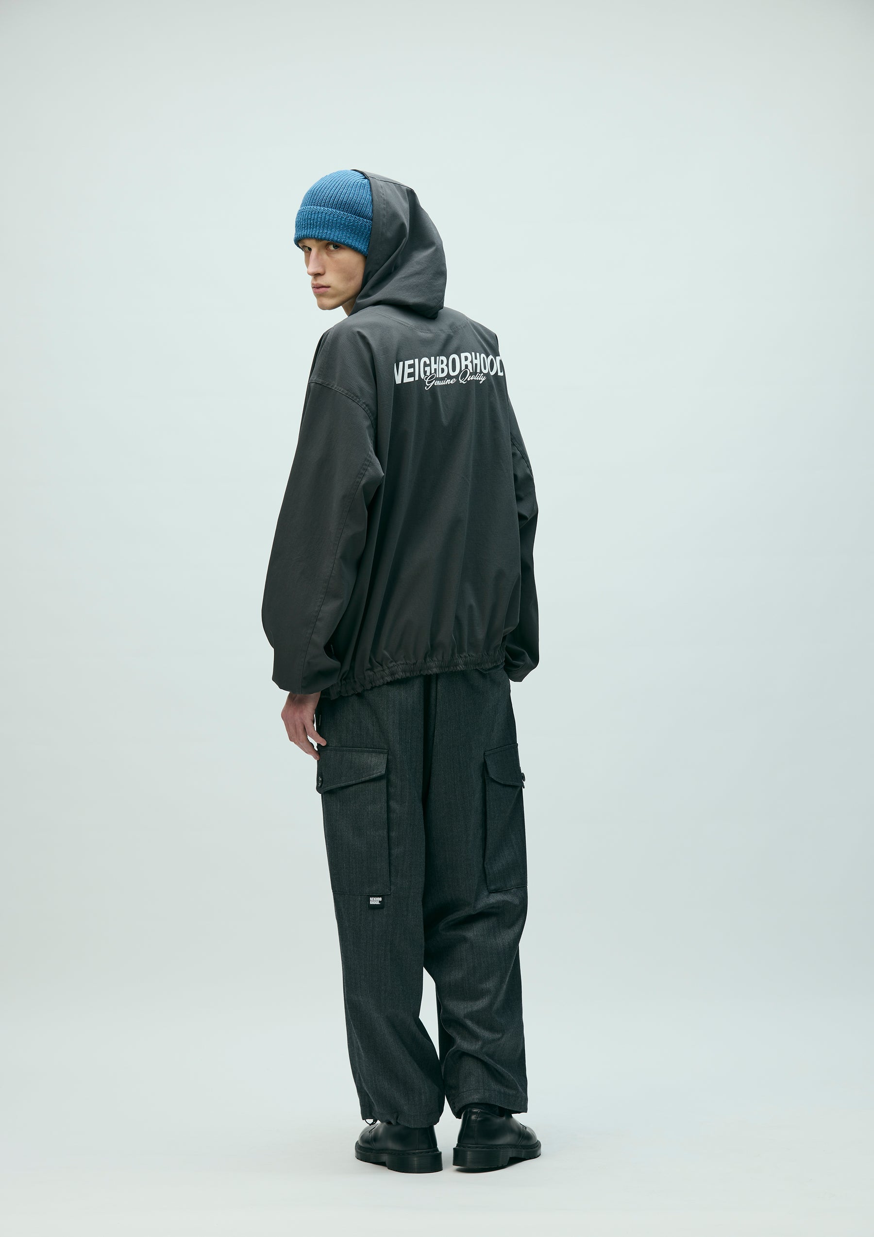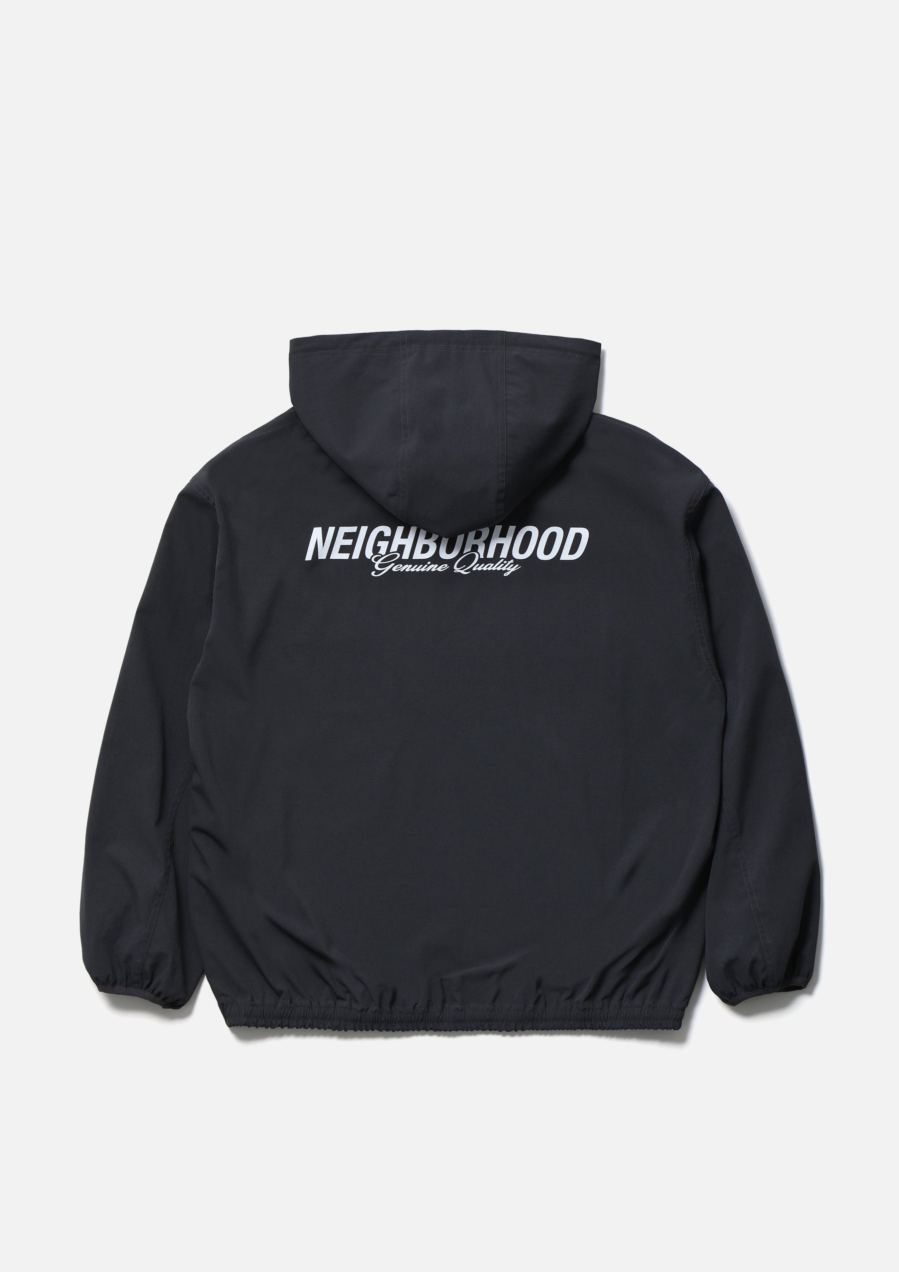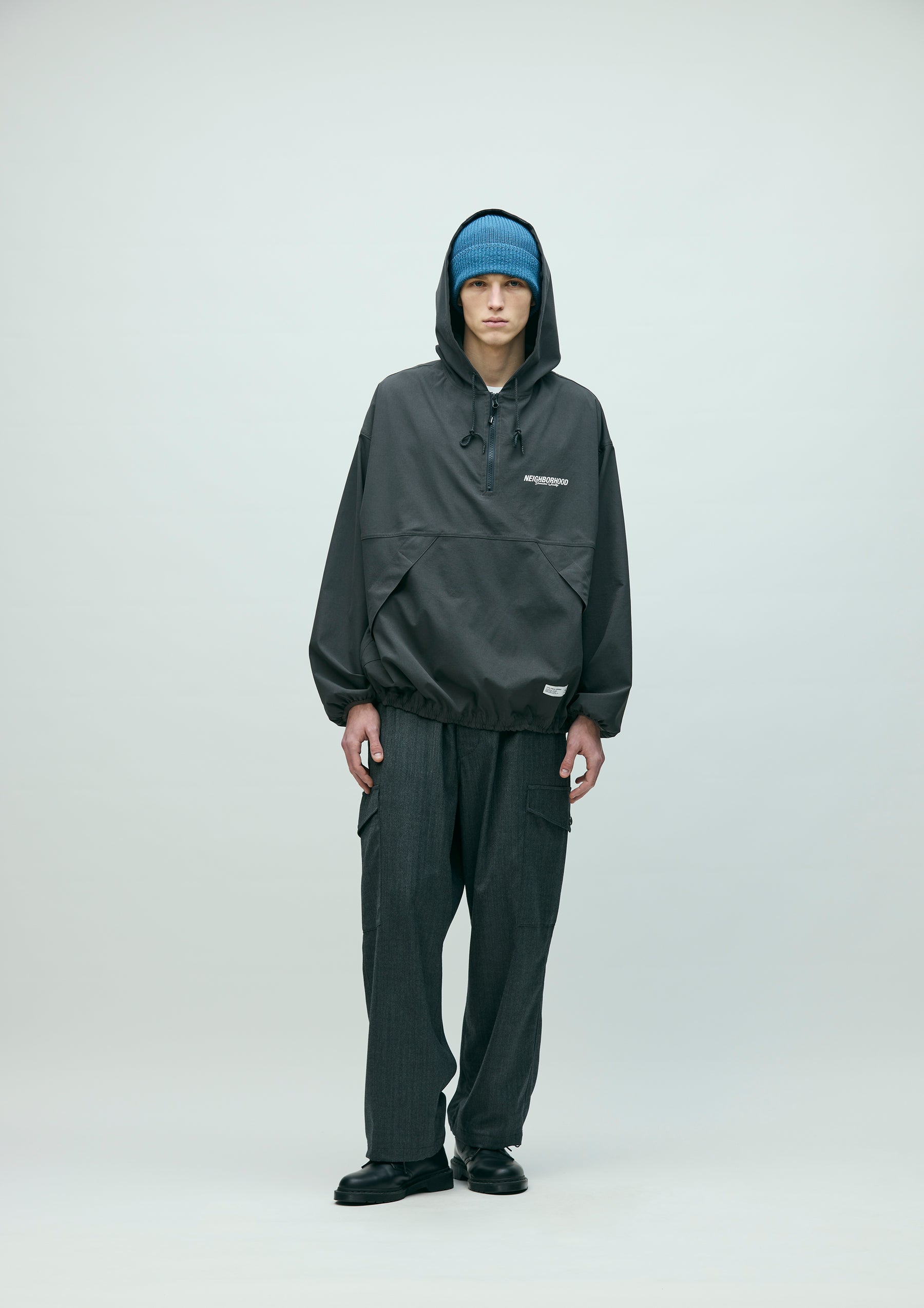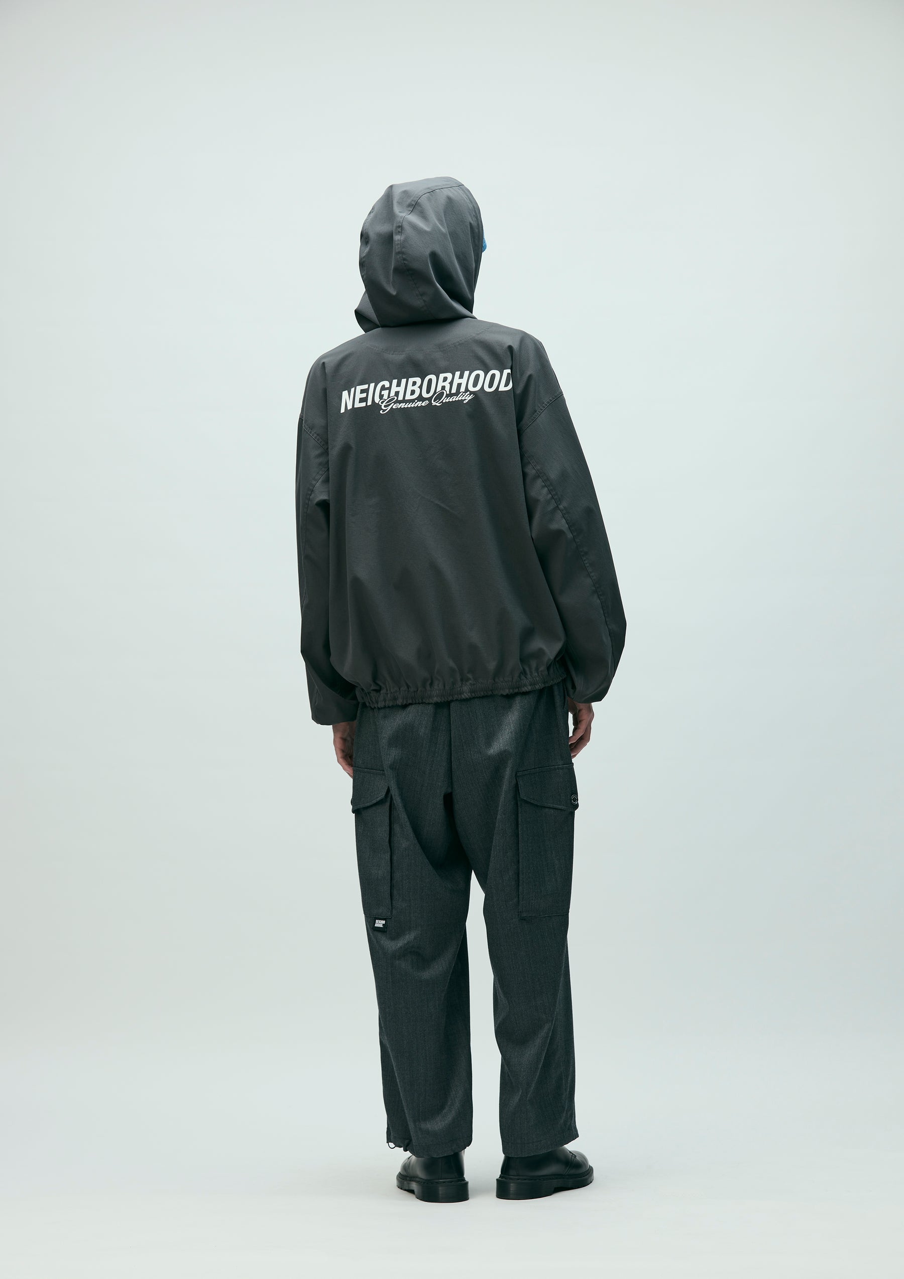 Anorak jacket made from medium-weight ripstop nylon with a cotton-like texture and a firm, structured feel. Made from a high-performance material that offers excellent stretch and superior water repellency, due to a convex structure inspired by traditional rain capes that allows water droplets to slide off. Features a large flap kangaroo pocket at the front, printed logos on the left chest and back, and an adjustable hood drawcord. A brand tag is placed at the left hem, and a woven side label is attached at the side seam.