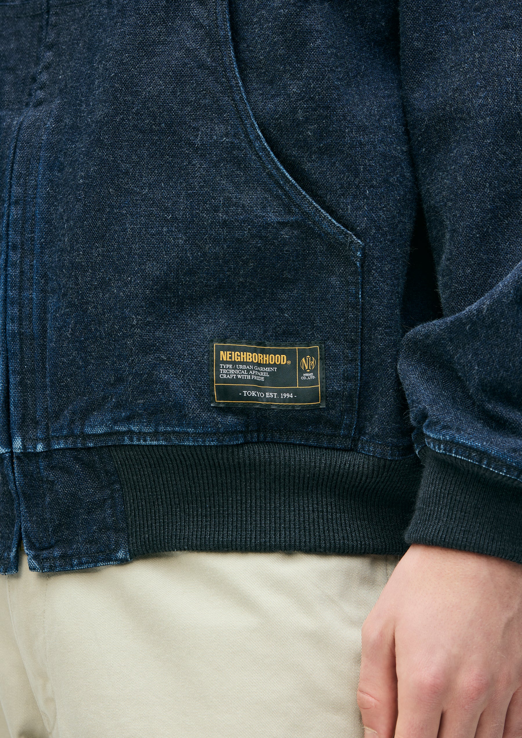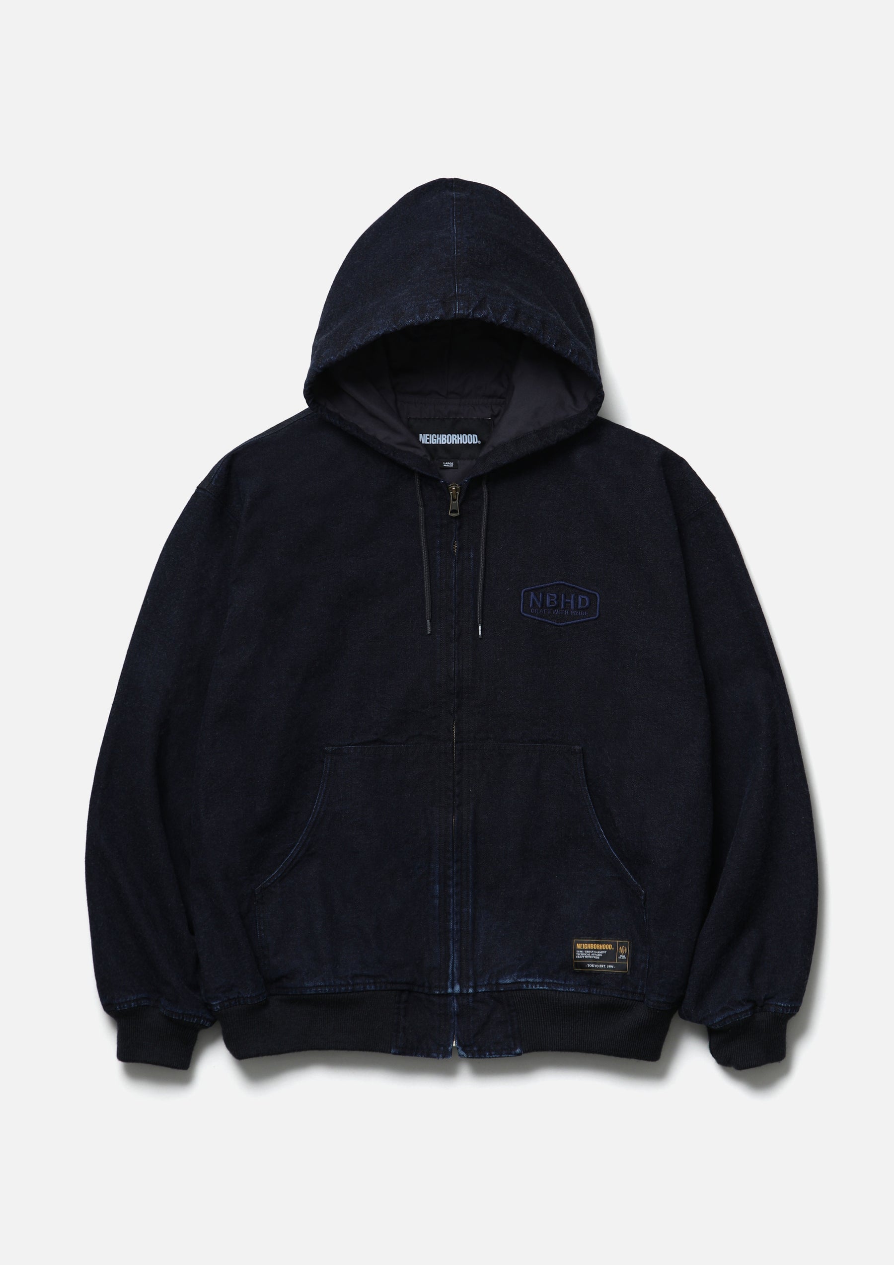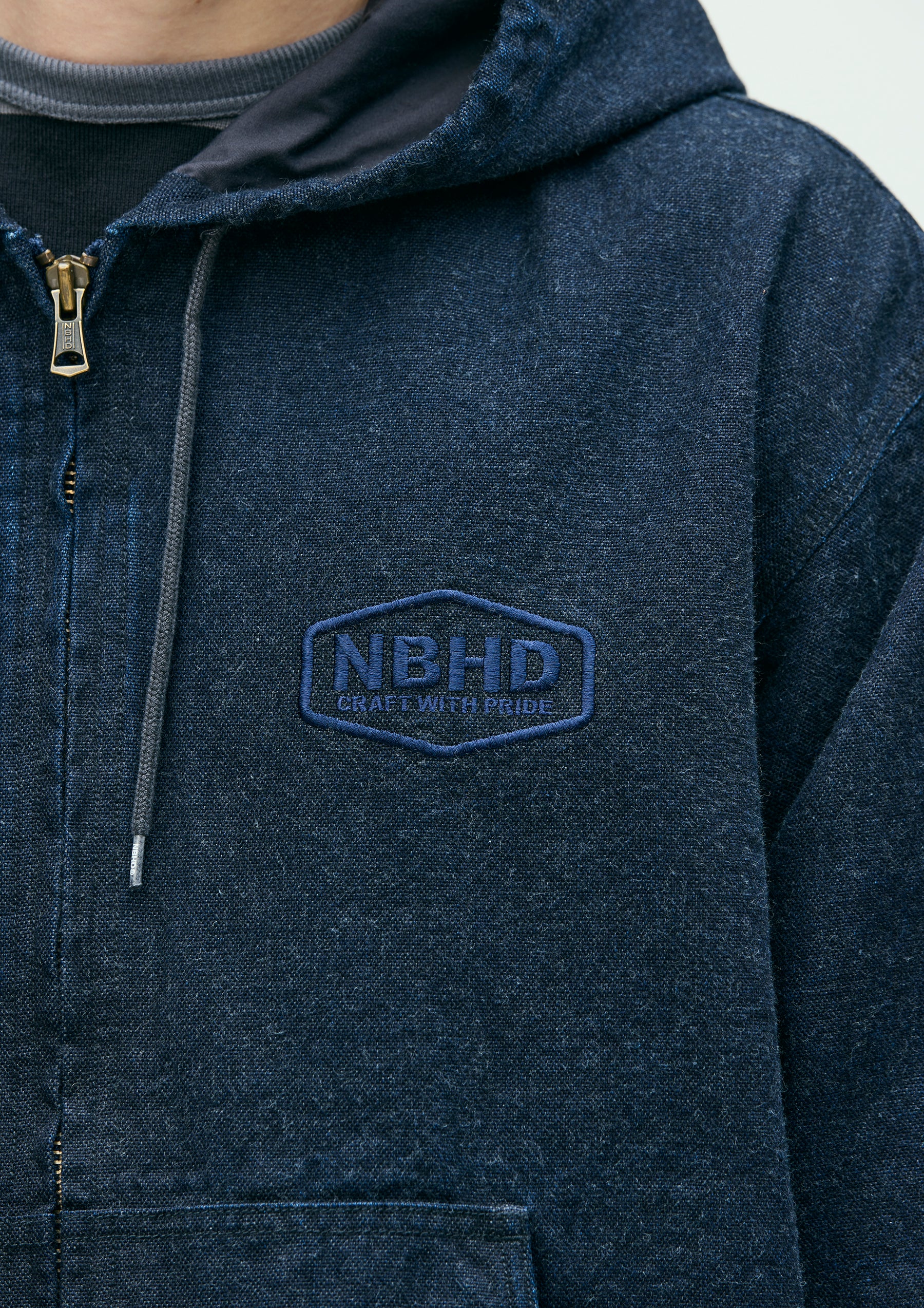 Zip Hooded Jacket made from oxford fabric, treated with a bio-stone wash for a naturally faded look. Features embroidered logo detailing on the left chest and original zipper pulls. A woven side label is attached at the side seam. Lined with a polyester/cotton blended weather cloth for smooth wearability.
