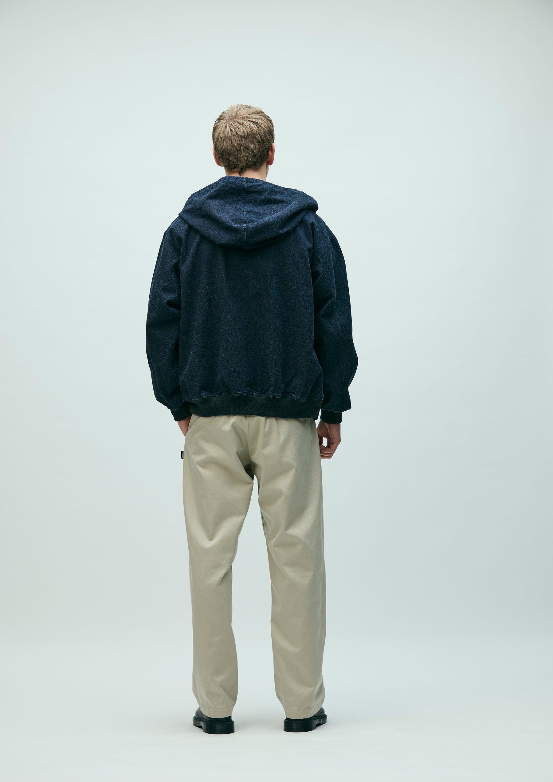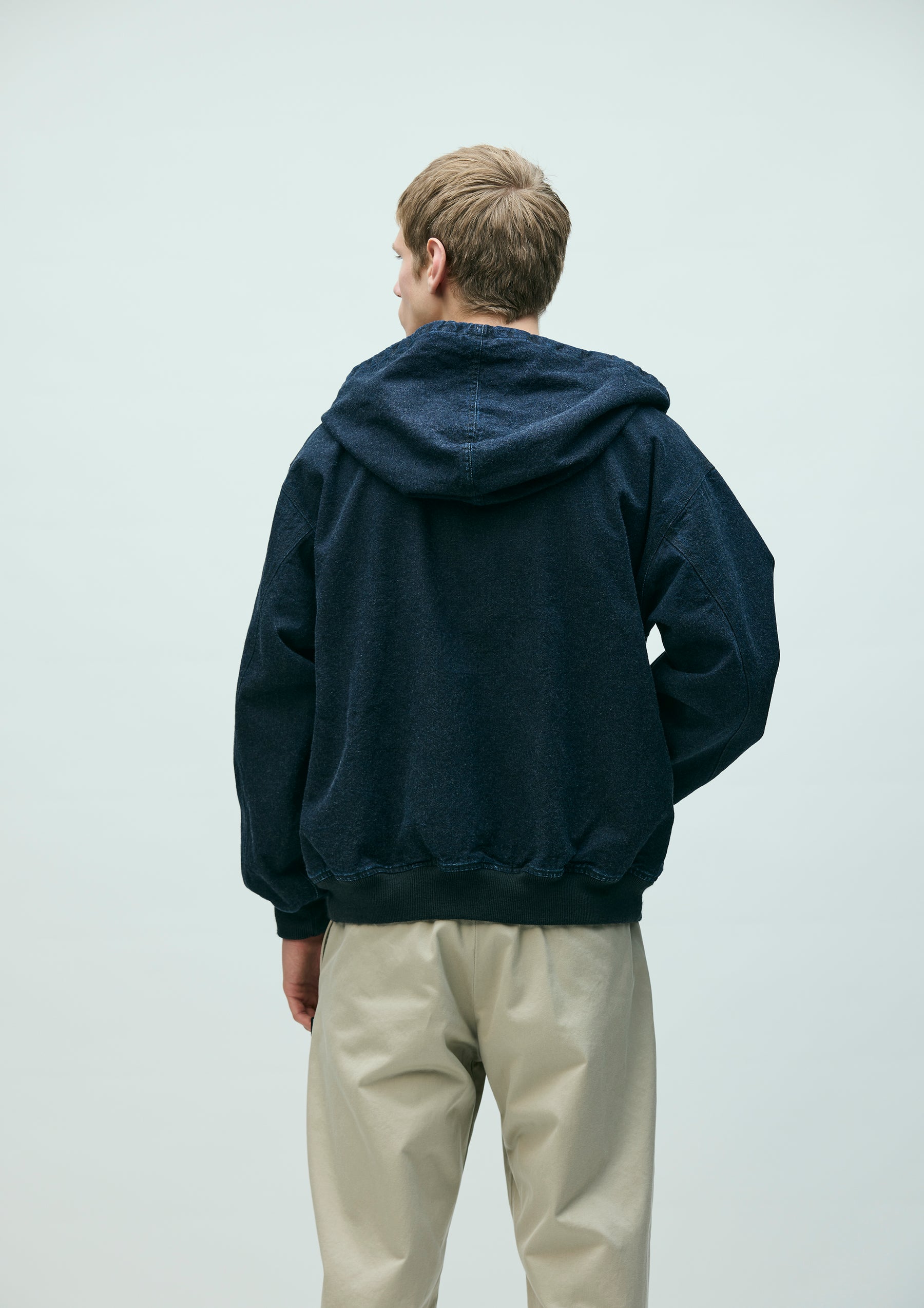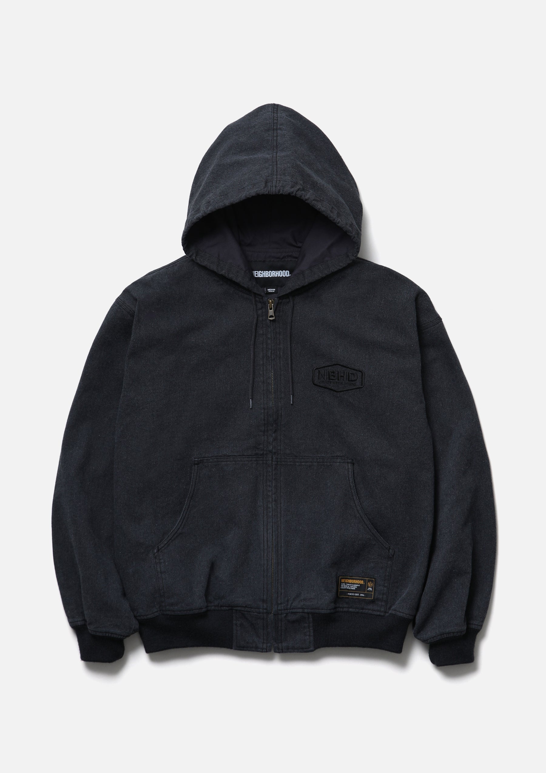 Zip Hooded Jacket made from oxford fabric, treated with a bio-stone wash for a naturally faded look. Features embroidered logo detailing on the left chest and original zipper pulls. A woven side label is attached at the side seam. Lined with a polyester/cotton blended weather cloth for smooth wearability.