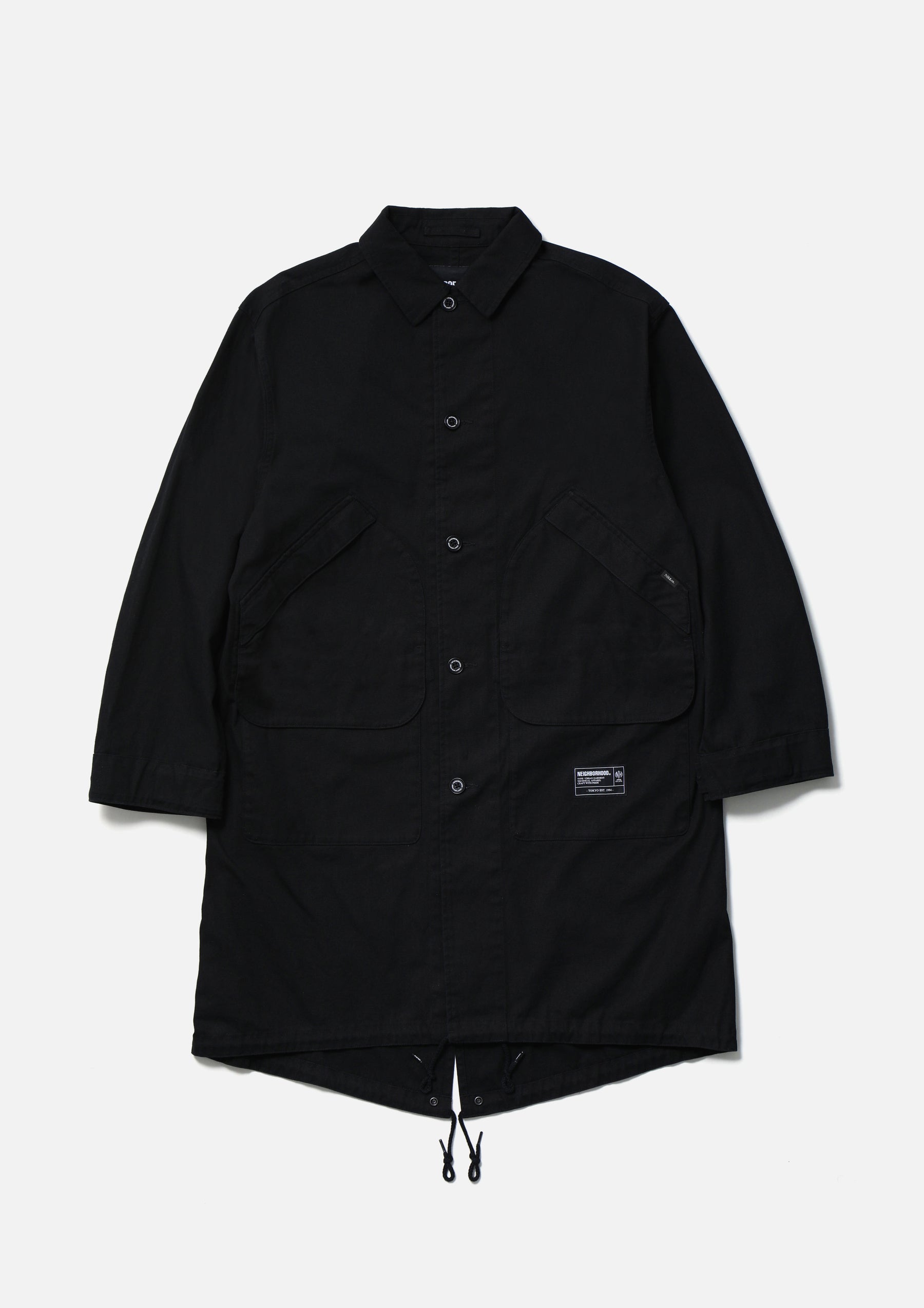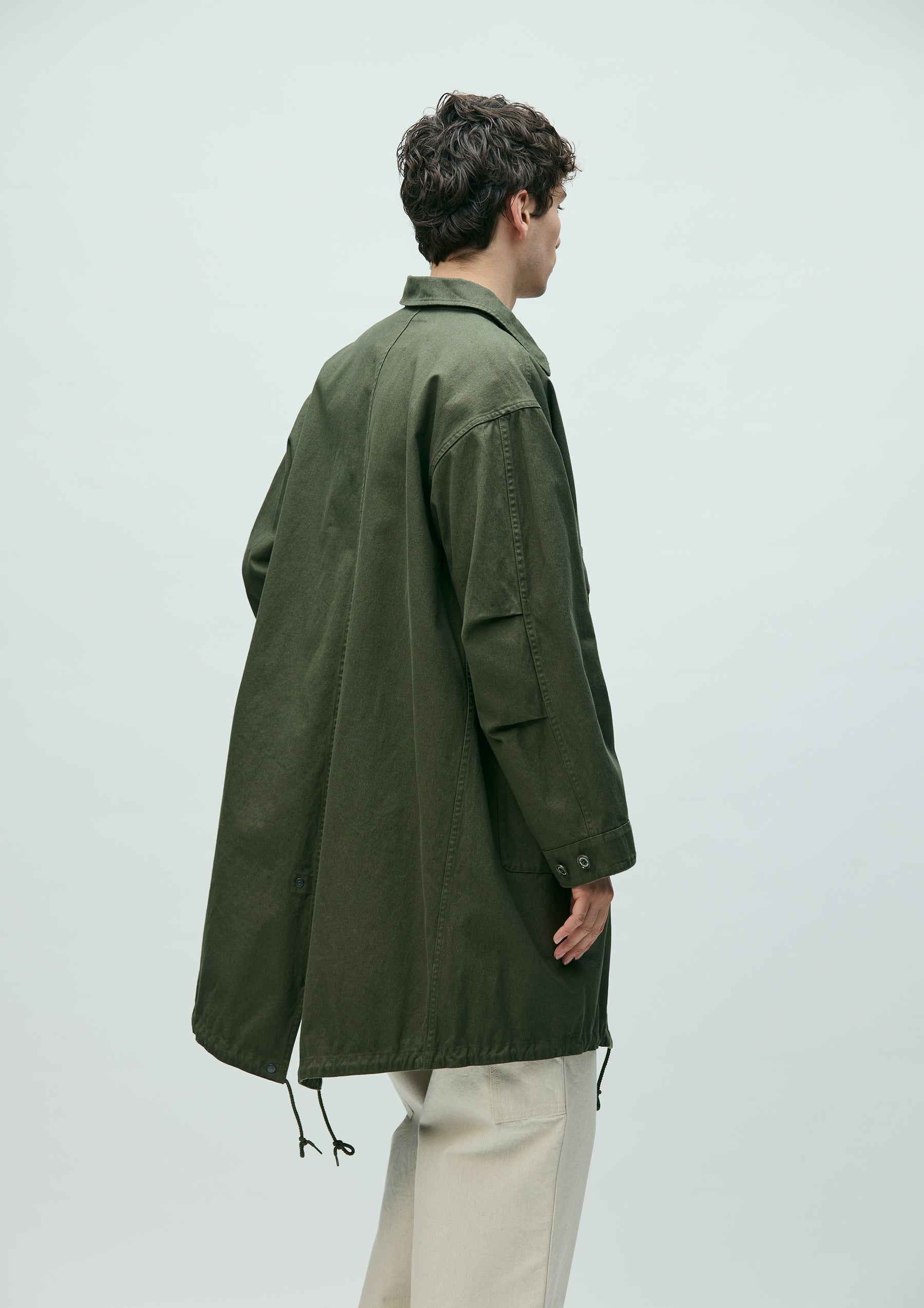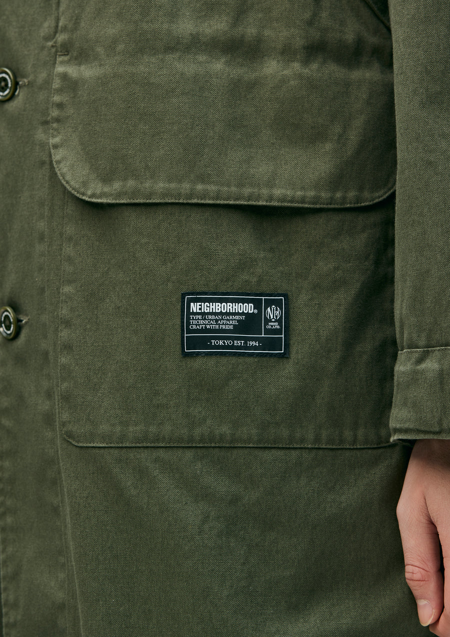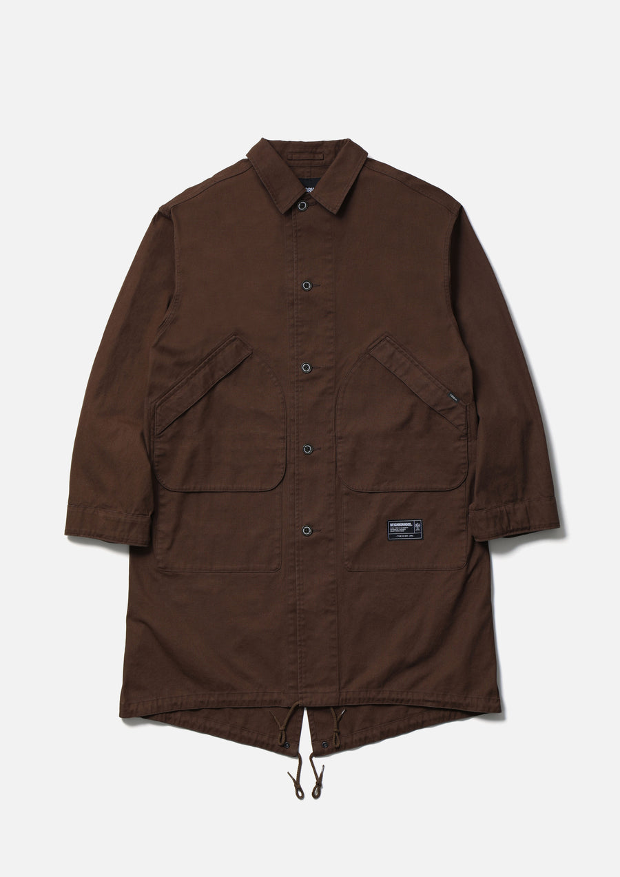 Modified field coat combining elements of a bal-collar coat and a hunting jacket. Made from durable yet easy to wear No.11 heavyweight canvas fabric. Features distinctive 3D dual pockets on the front and a fishtail hem. Finished with original buttons. A brand tag is attached to the pocket, and a woven side label is placed at the side seam. Completed with a one-wash finish.