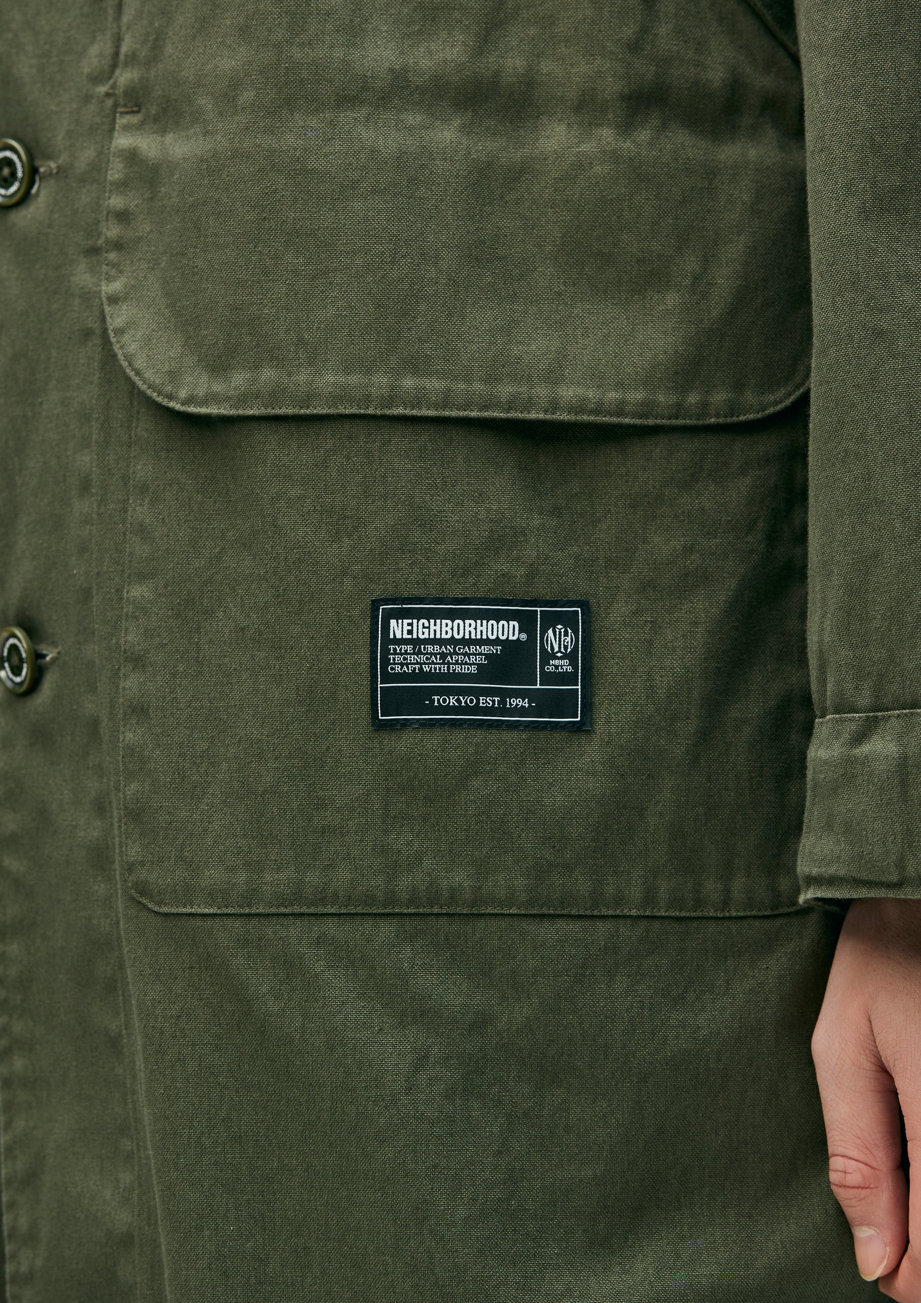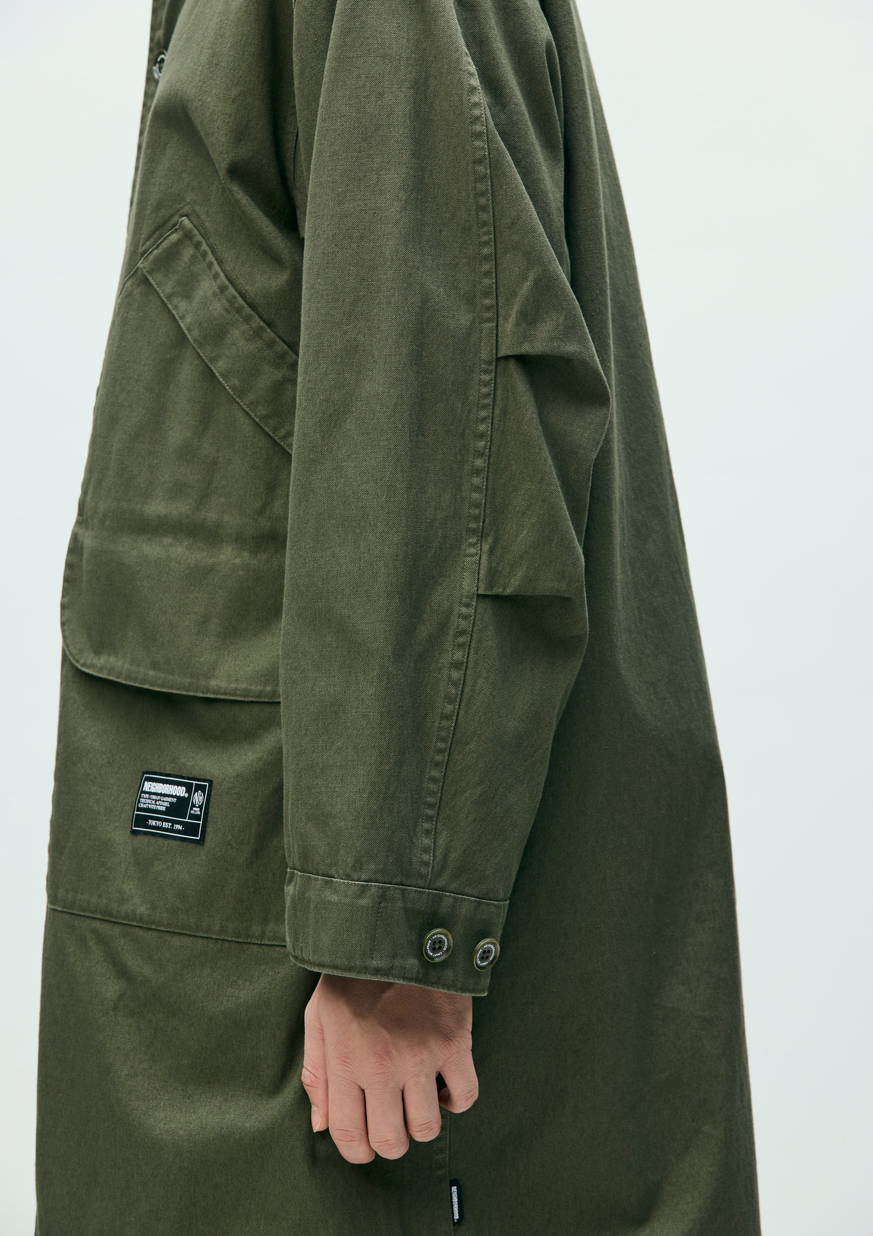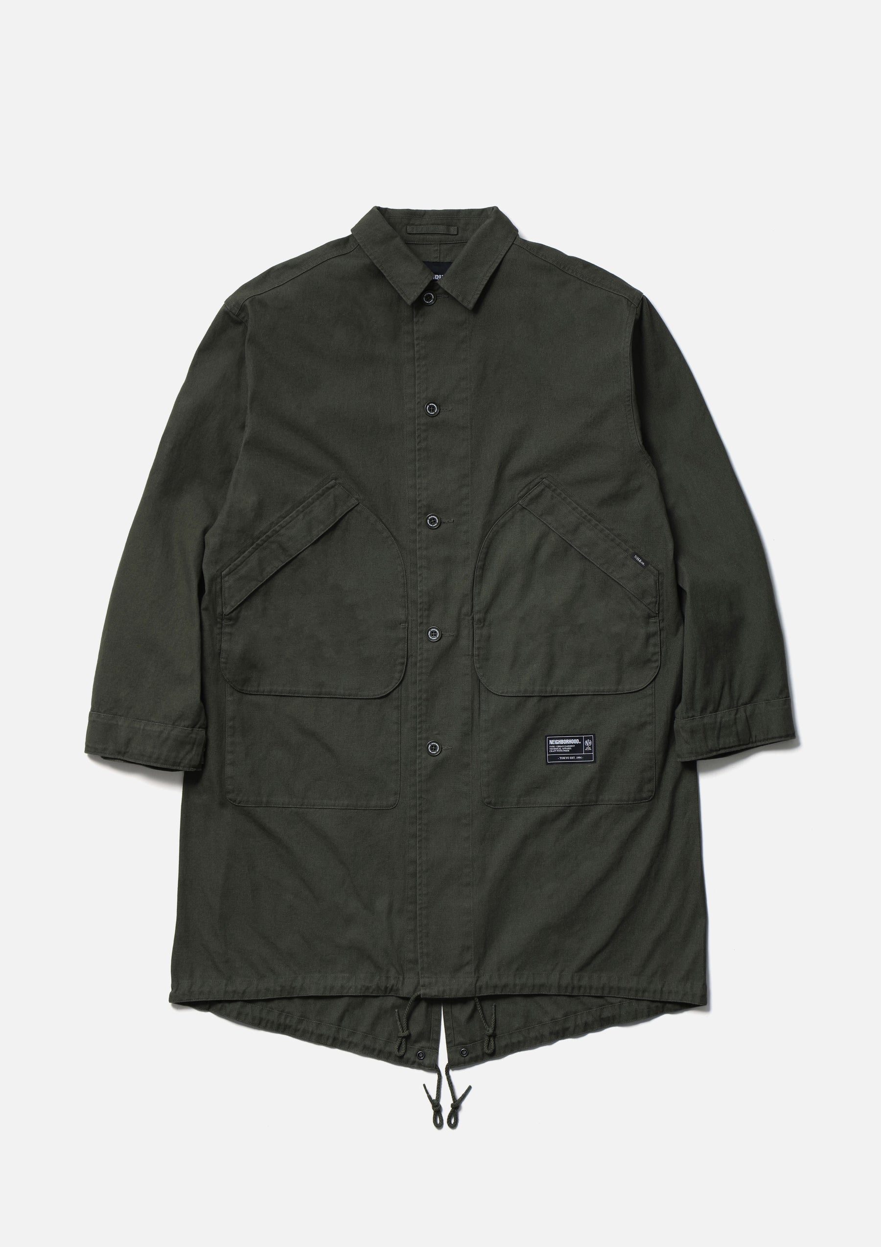 Modified field coat combining elements of a bal-collar coat and a hunting jacket. Made from durable yet easy to wear No.11 heavyweight canvas fabric. Features distinctive 3D dual pockets on the front and a fishtail hem. Finished with original buttons. A brand tag is attached to the pocket, and a woven side label is placed at the side seam. Completed with a one-wash finish.