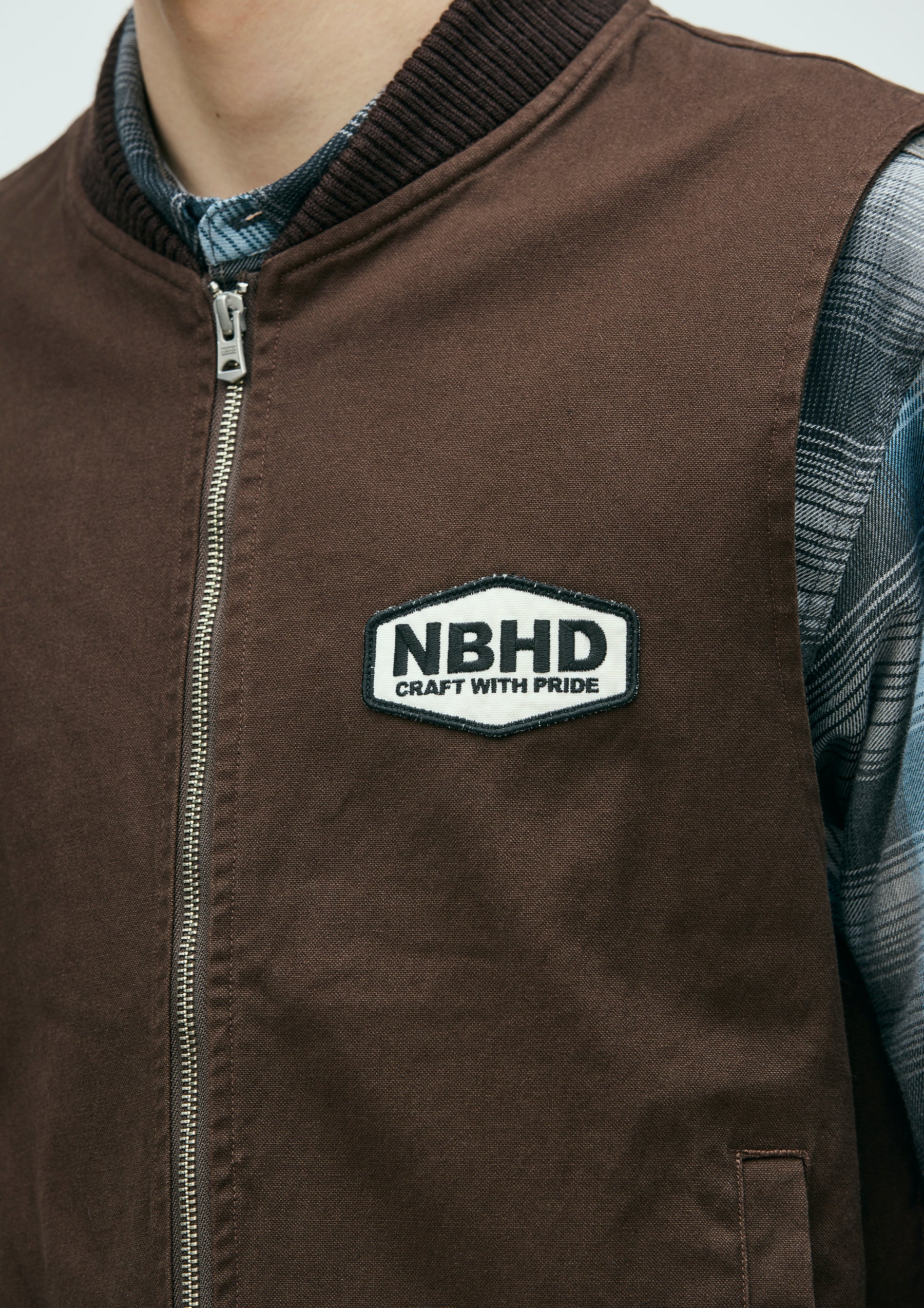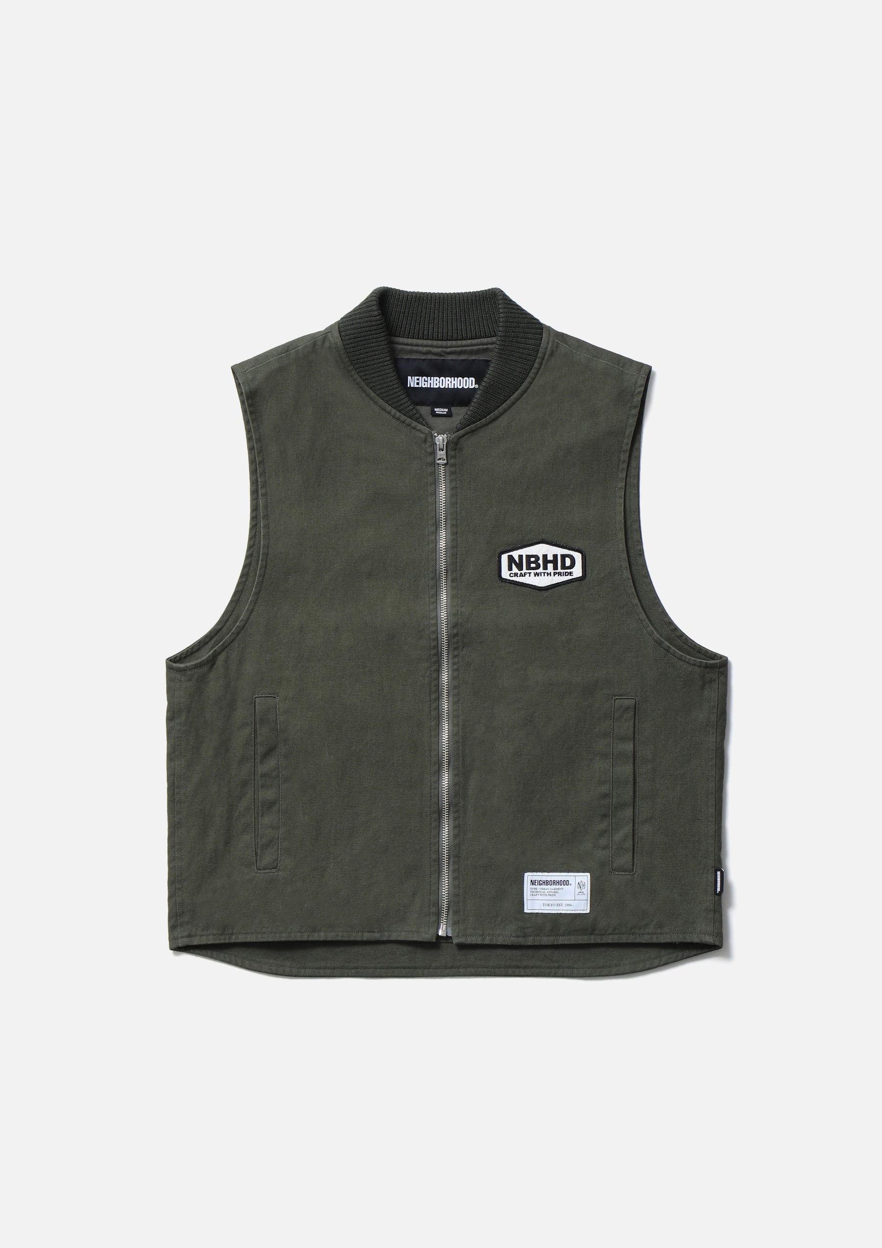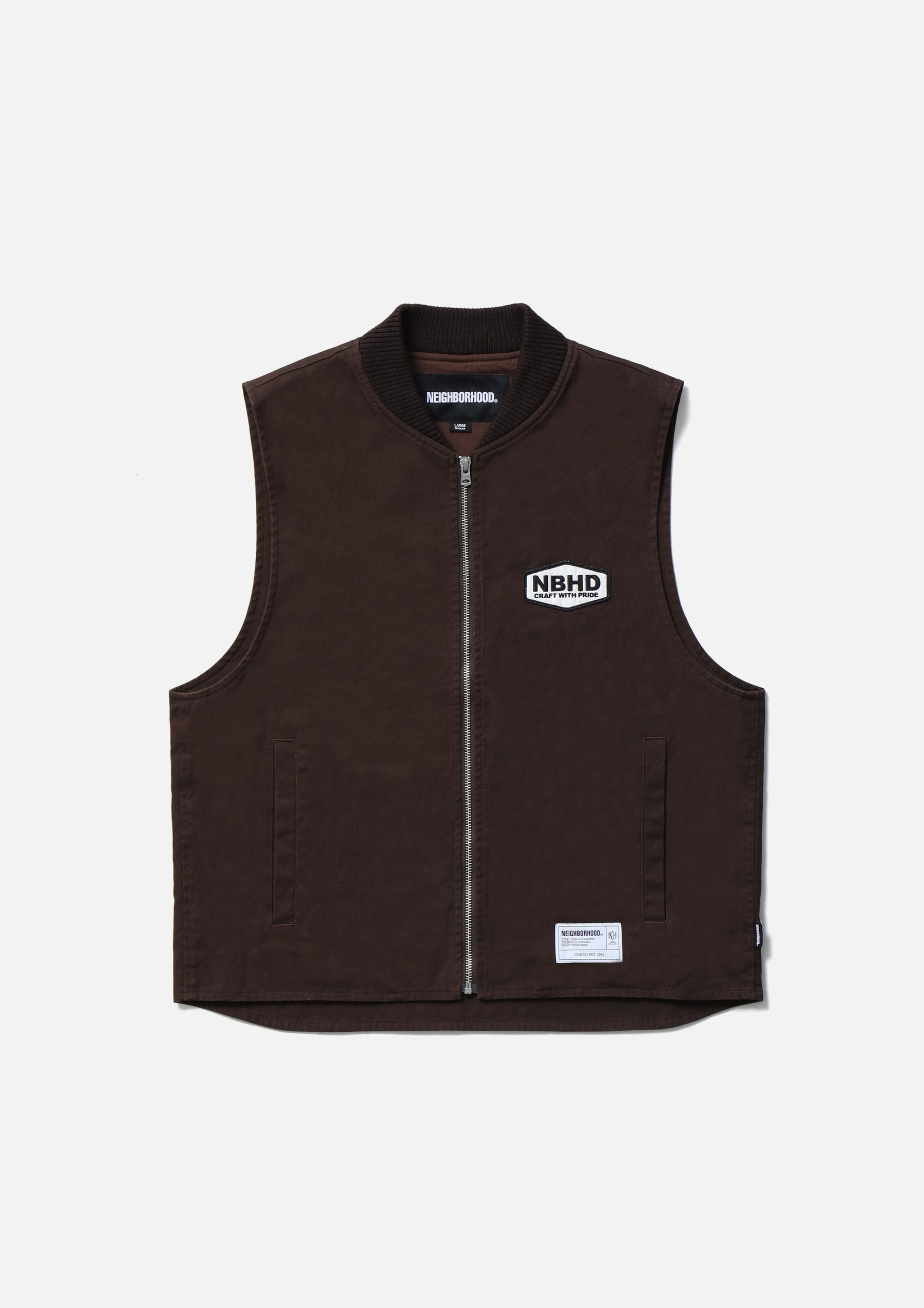 Zip work vest made from durable yet easy to wear No.11 heavyweight canvas fabric. Features a ribbed collar and lightweight twill lining. Detailed with an embroidered patch on the left chest and a printed logo on the back. Finished with original zipper pulls. A brand tag is placed at the left hem, and a woven side label is attached at the side seam. Completed with a one-wash finish.