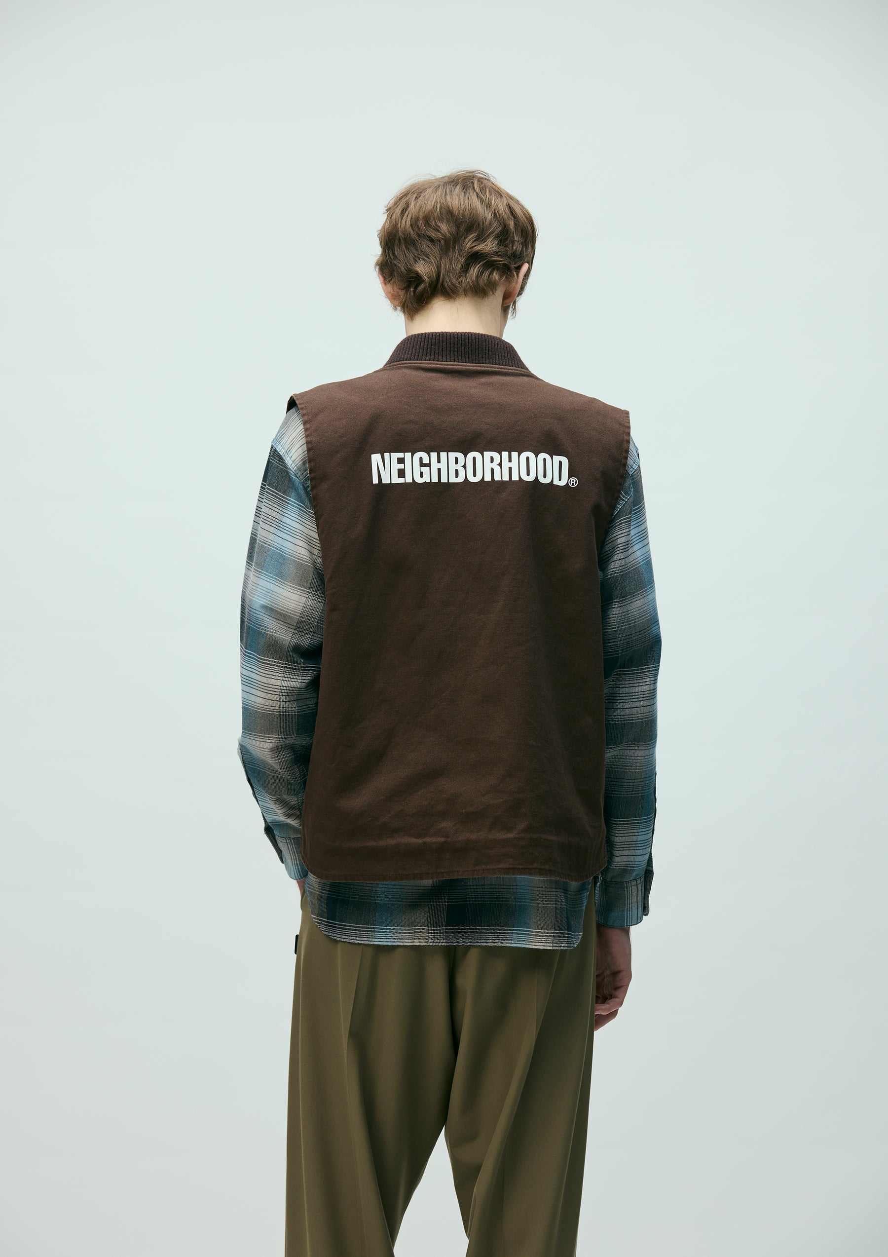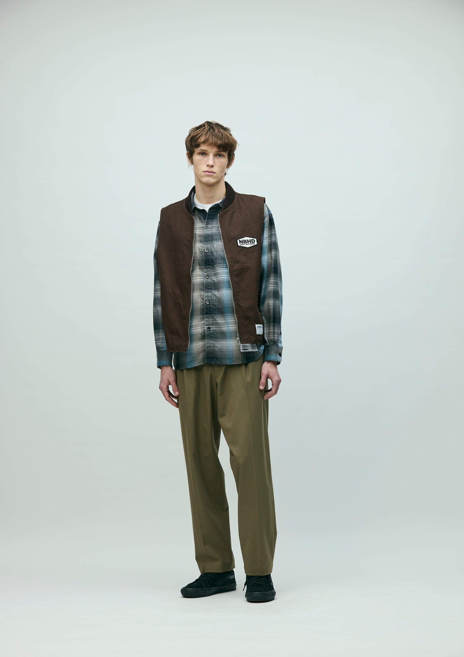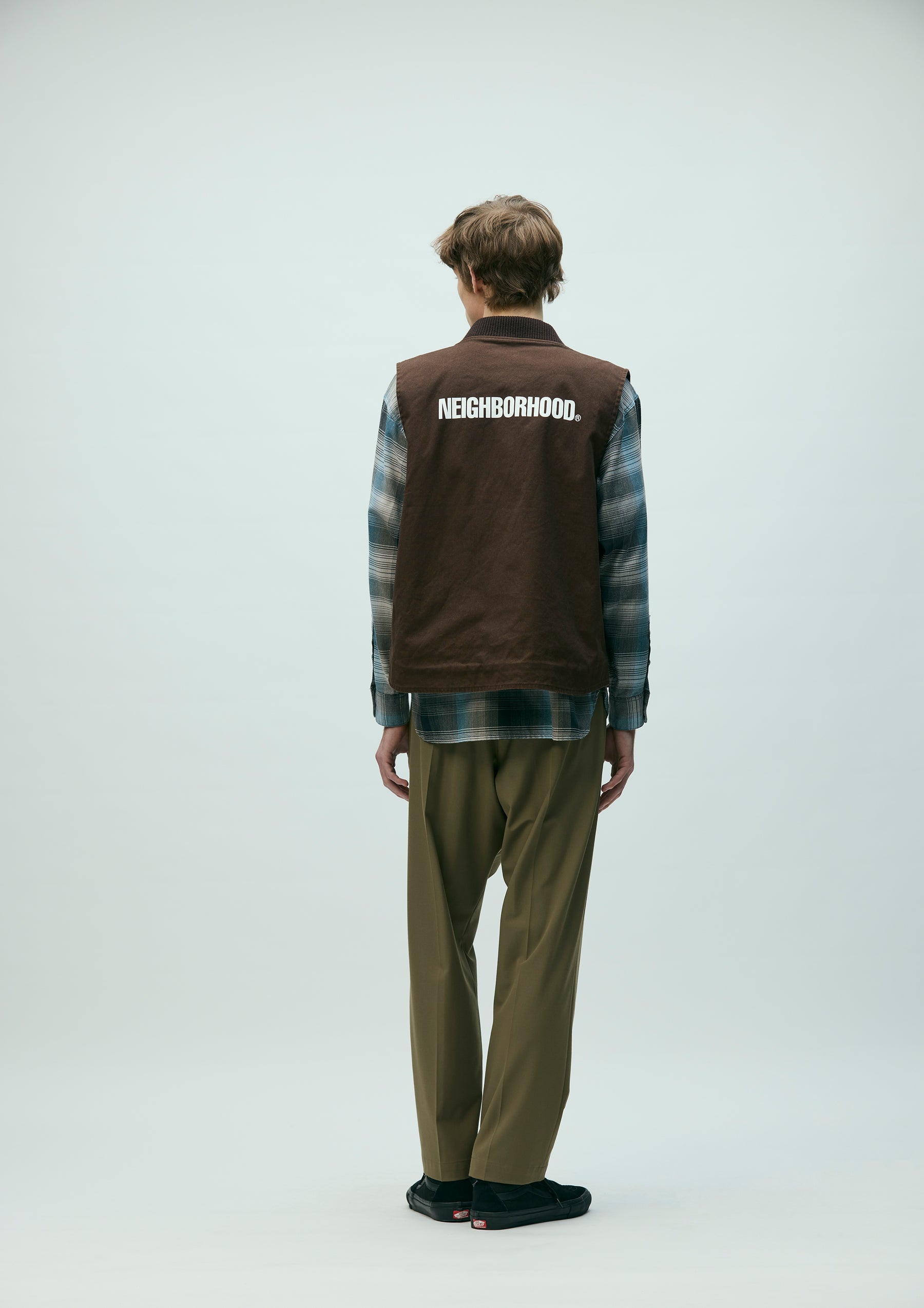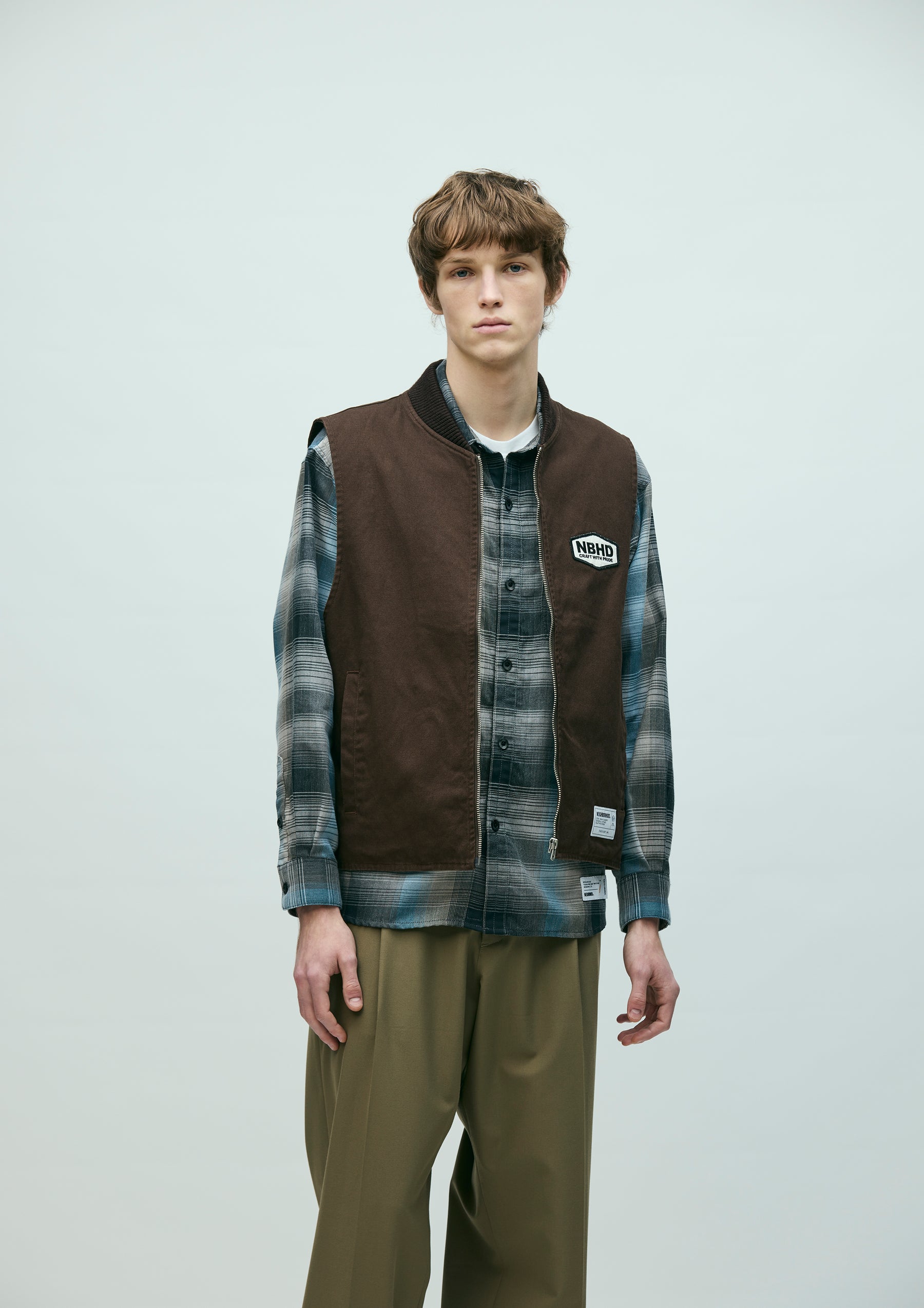 Zip work vest made from durable yet easy to wear No.11 heavyweight canvas fabric. Features a ribbed collar and lightweight twill lining. Detailed with an embroidered patch on the left chest and a printed logo on the back. Finished with original zipper pulls. A brand tag is placed at the left hem, and a woven side label is attached at the side seam. Completed with a one-wash finish.