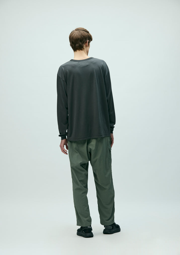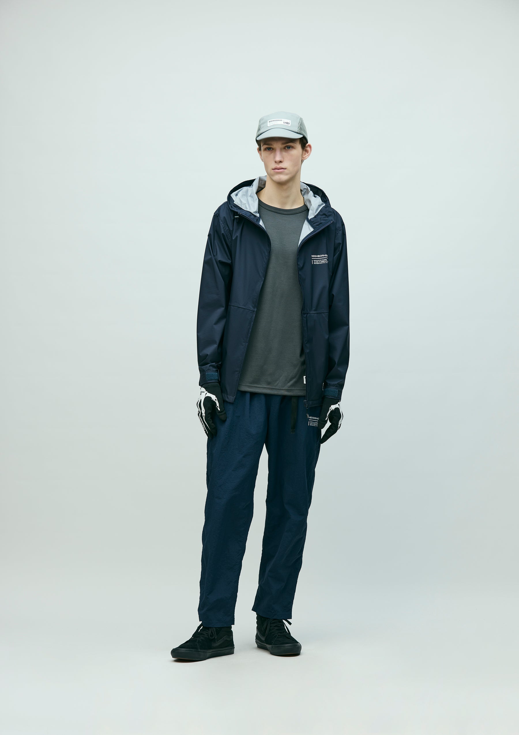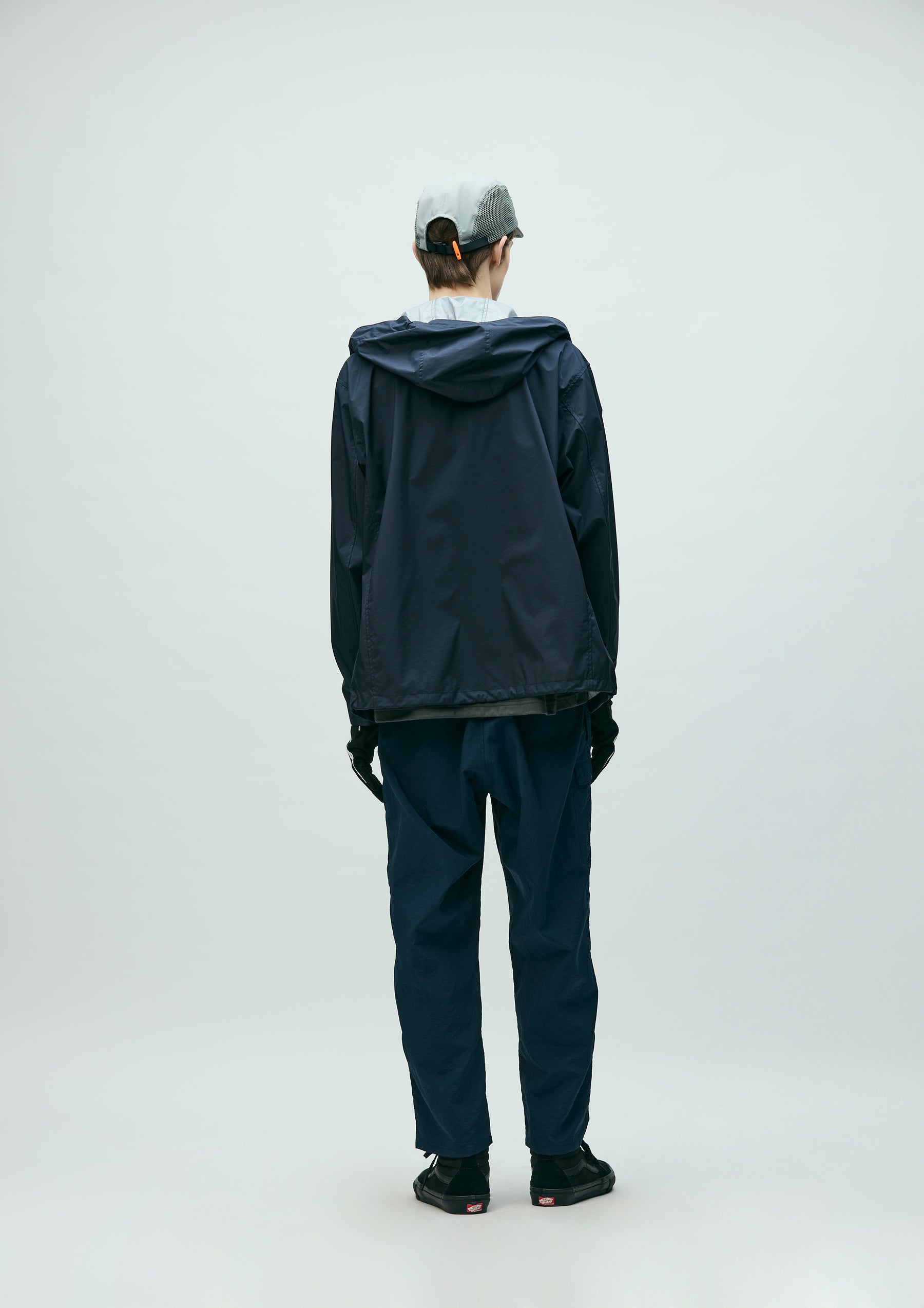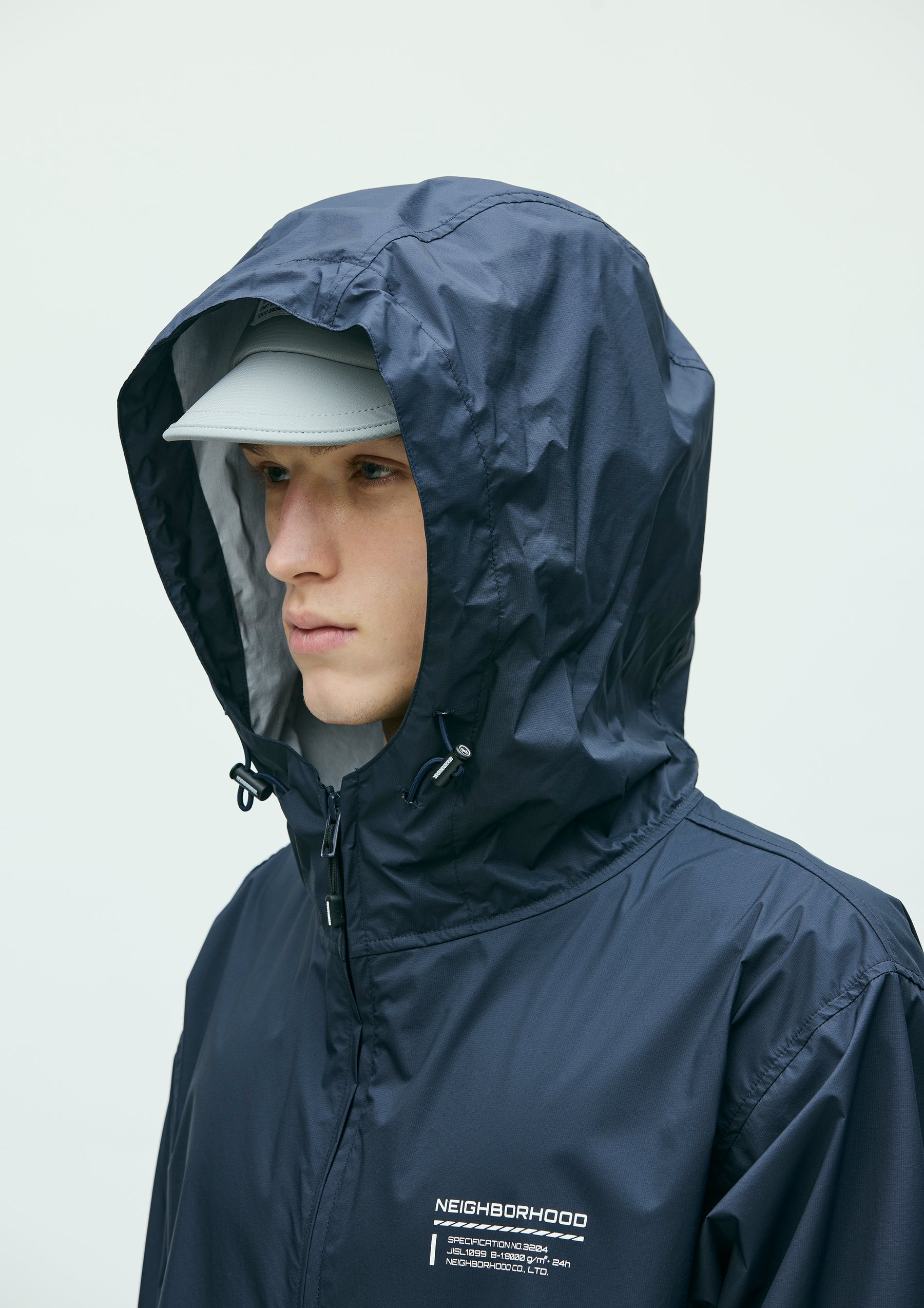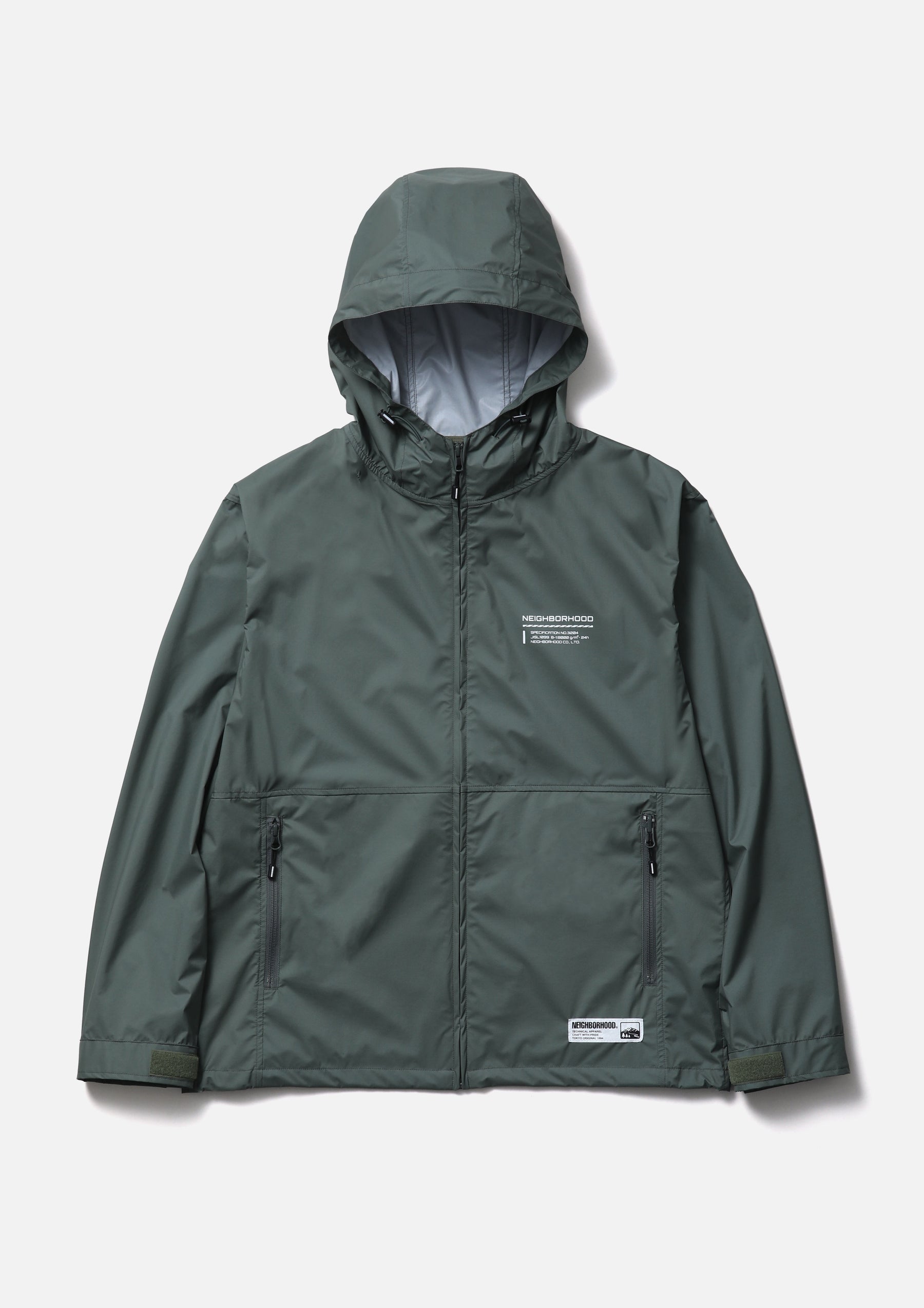Lightweight packable jacket made from an ultra-thin 3-layer functional fabric that combines waterproof performance with breathability. Features a packable design utilizing the left waist pocket. Equipped with elastic drawcords at the hood and hem, fitted with original stoppers for adjustment. Sleeves are finished with Velcro tabs. A logo is printed on the left chest. A brand tag is placed at the left hem, and a woven side label is attached at the side seam.