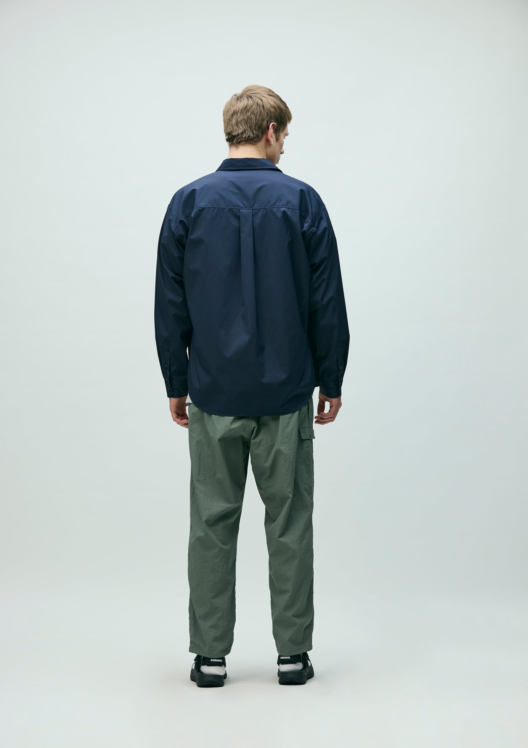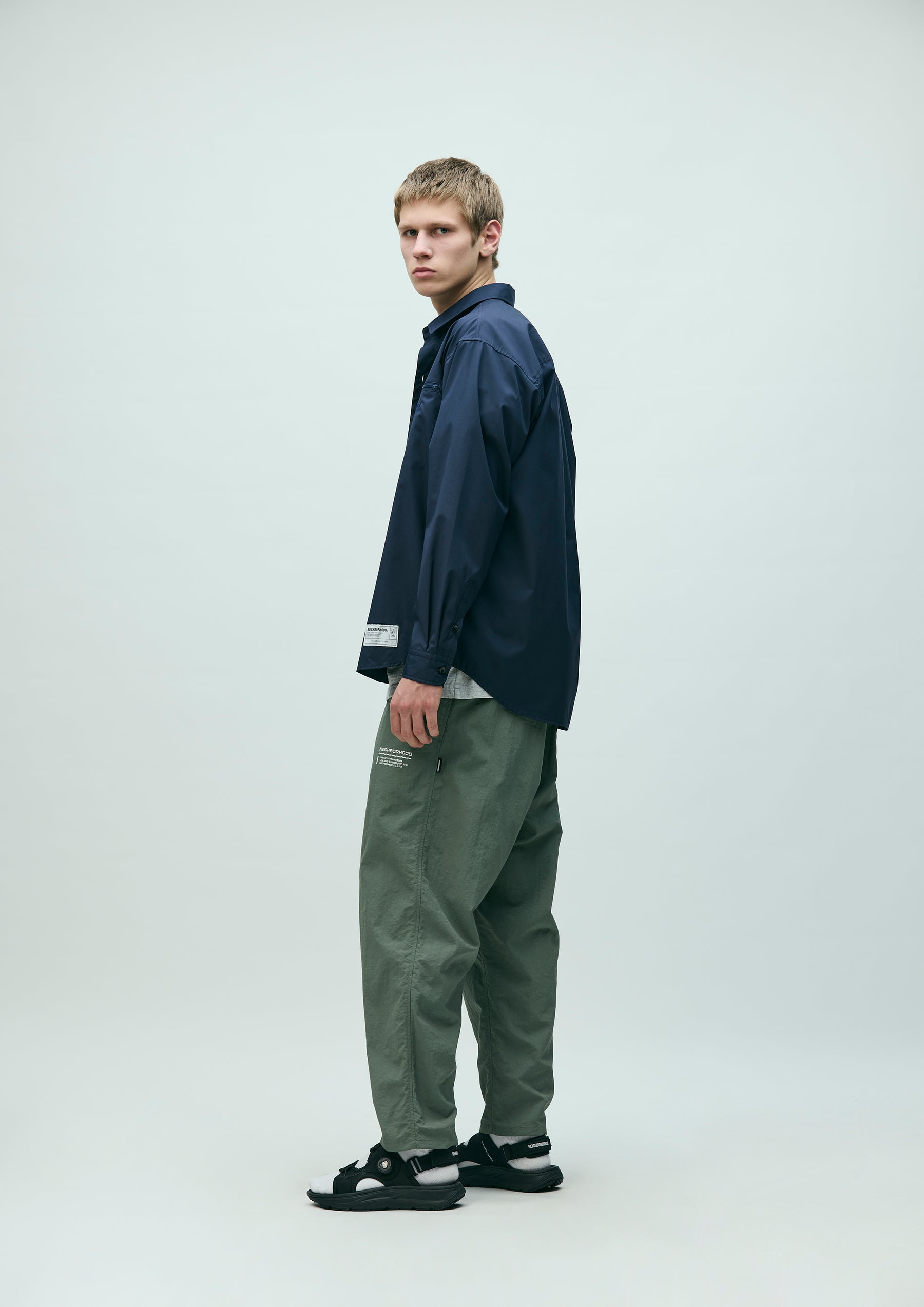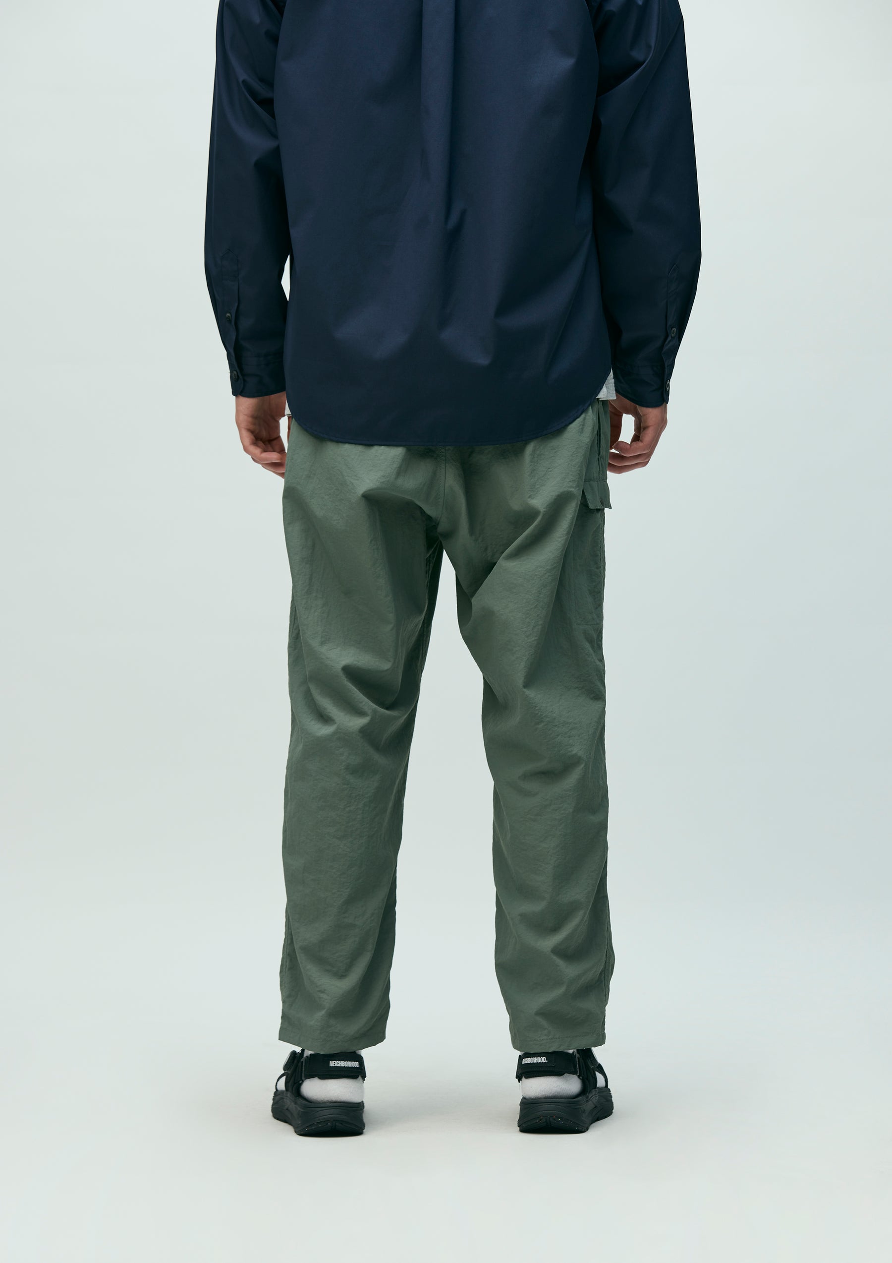 Lightweight Active Pants made from Taslan nylon taffeta with a wrinkle finish, featuring a matte tone and cotton-like texture. Despite their light weight, the fabric offers excellent strength and durability, along with water repellency and UV protection. Designed with an elastic waistband integrated with a belt and original buckle. Features a flap pocket on the right side, a zip pocket on the back, and a printed logo on the left thigh. A brand tag is placed below the pocket, with a woven side label at the side seam.