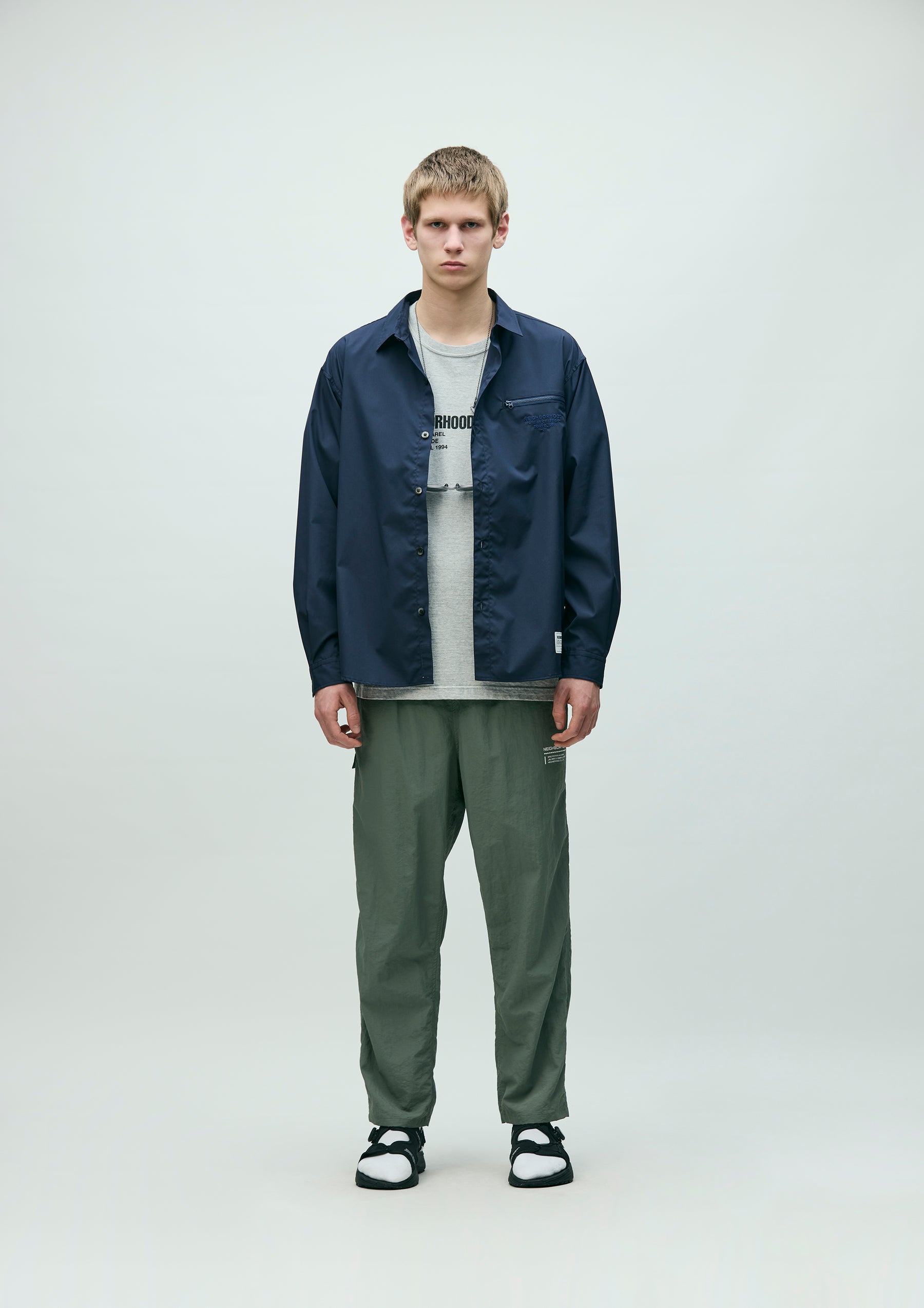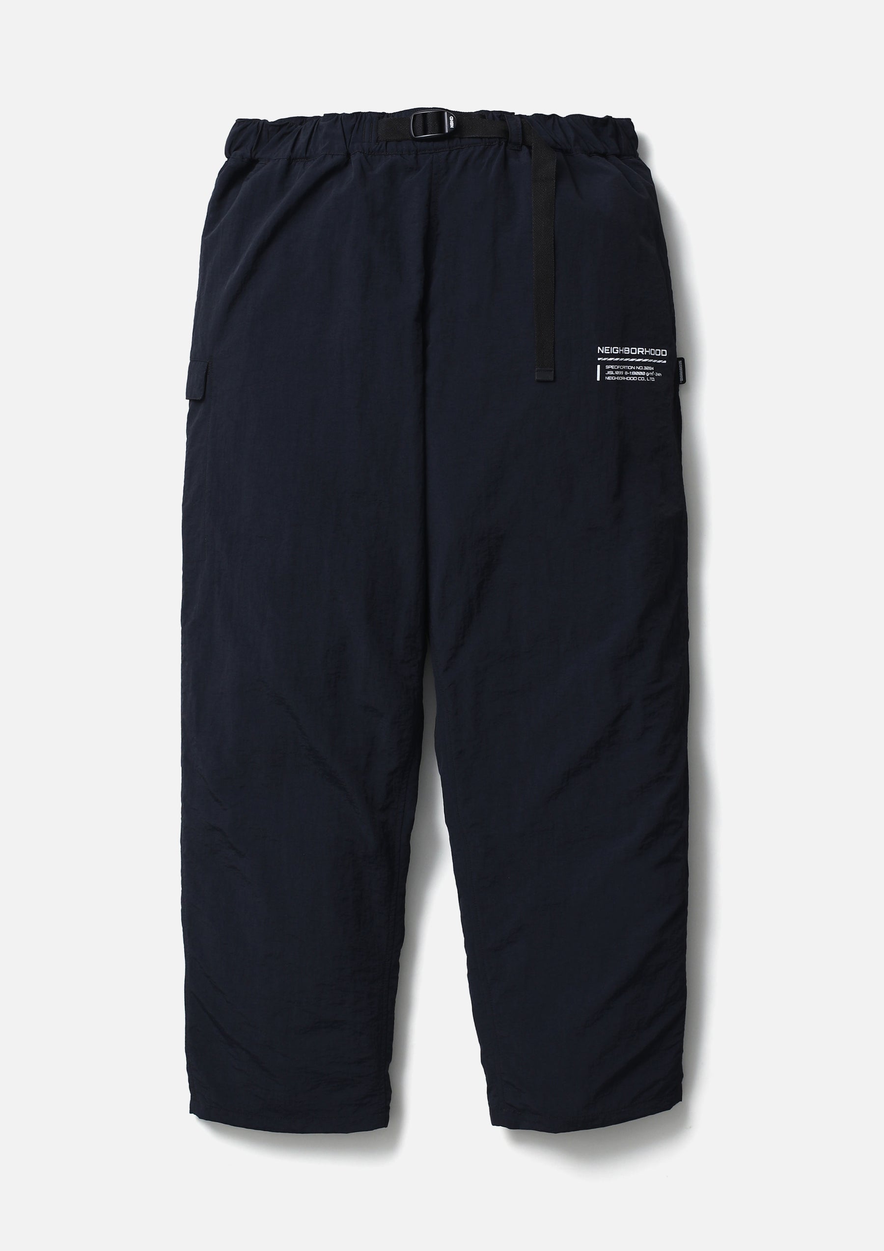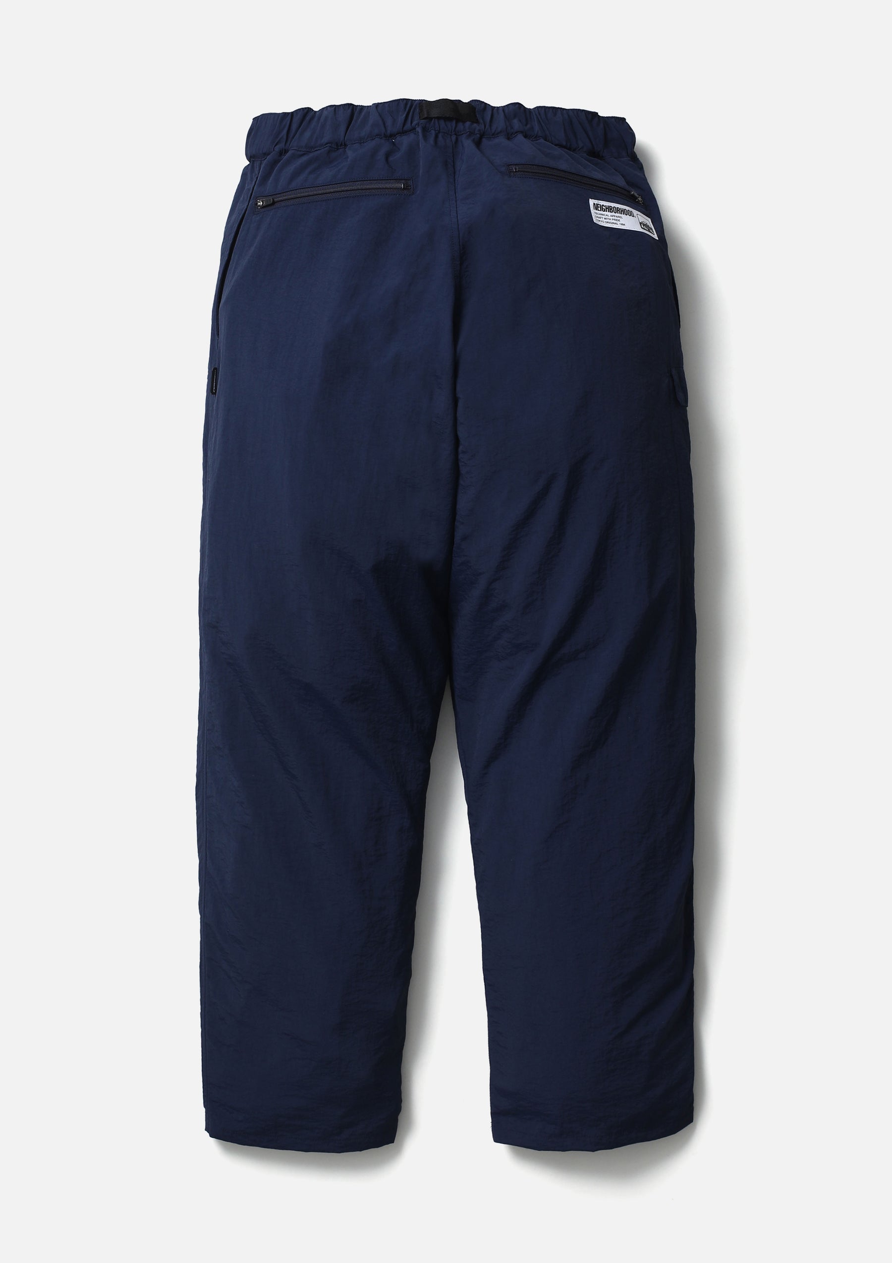 Lightweight Active Pants made from Taslan nylon taffeta with a wrinkle finish, featuring a matte tone and cotton-like texture. Despite their light weight, the fabric offers excellent strength and durability, along with water repellency and UV protection. Designed with an elastic waistband integrated with a belt and original buckle. Features a flap pocket on the right side, a zip pocket on the back, and a printed logo on the left thigh. A brand tag is placed below the pocket, with a woven side label at the side seam.