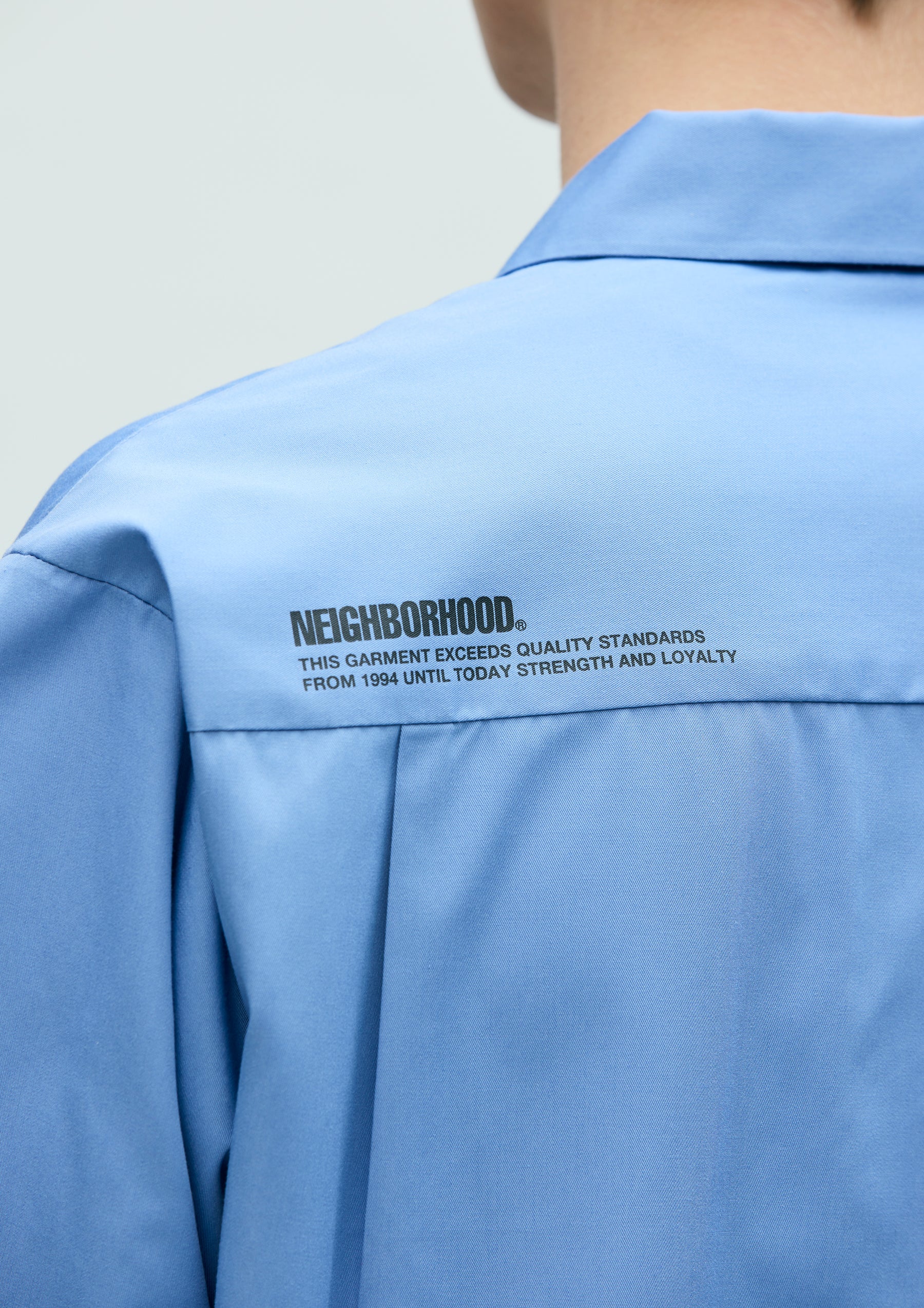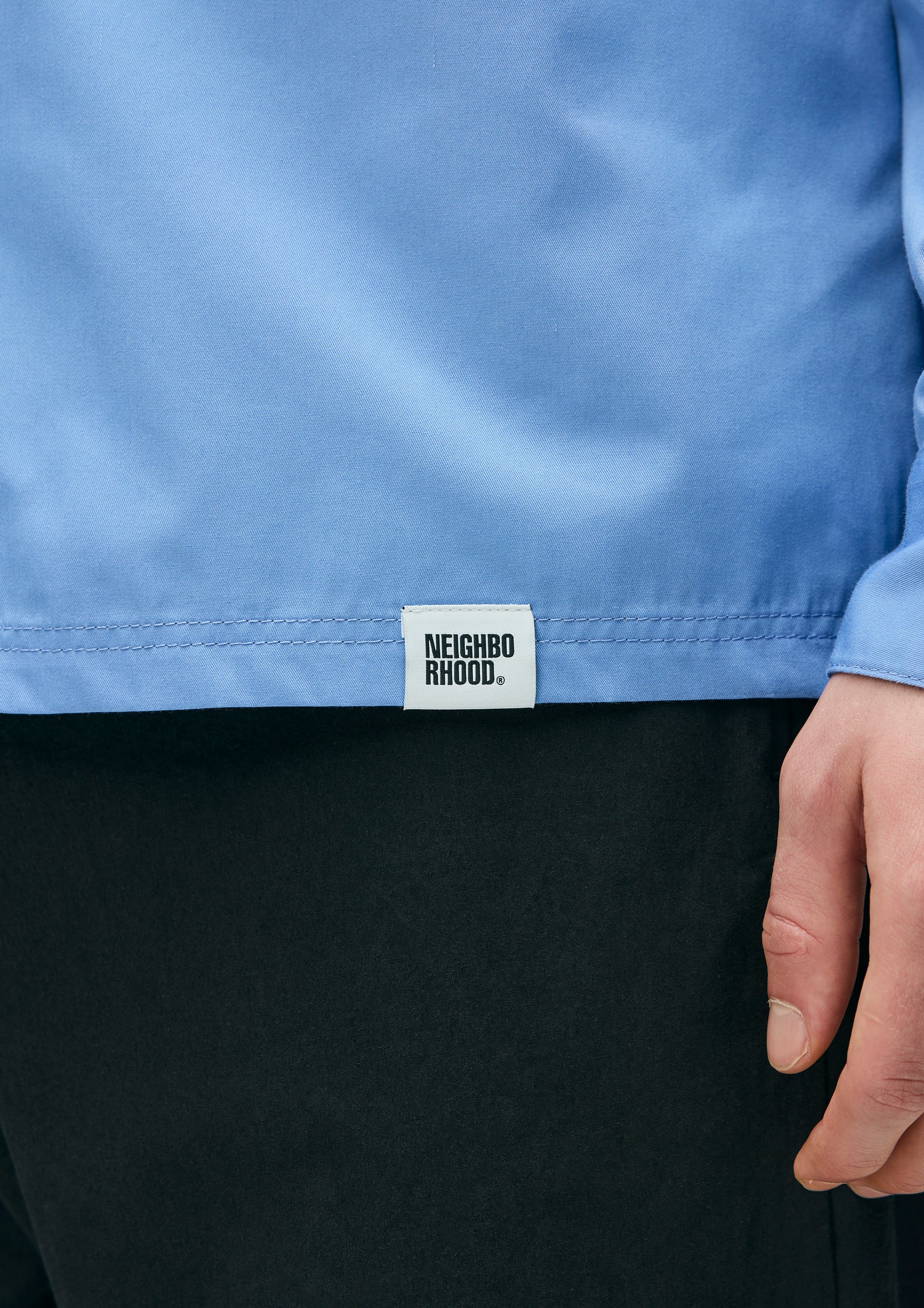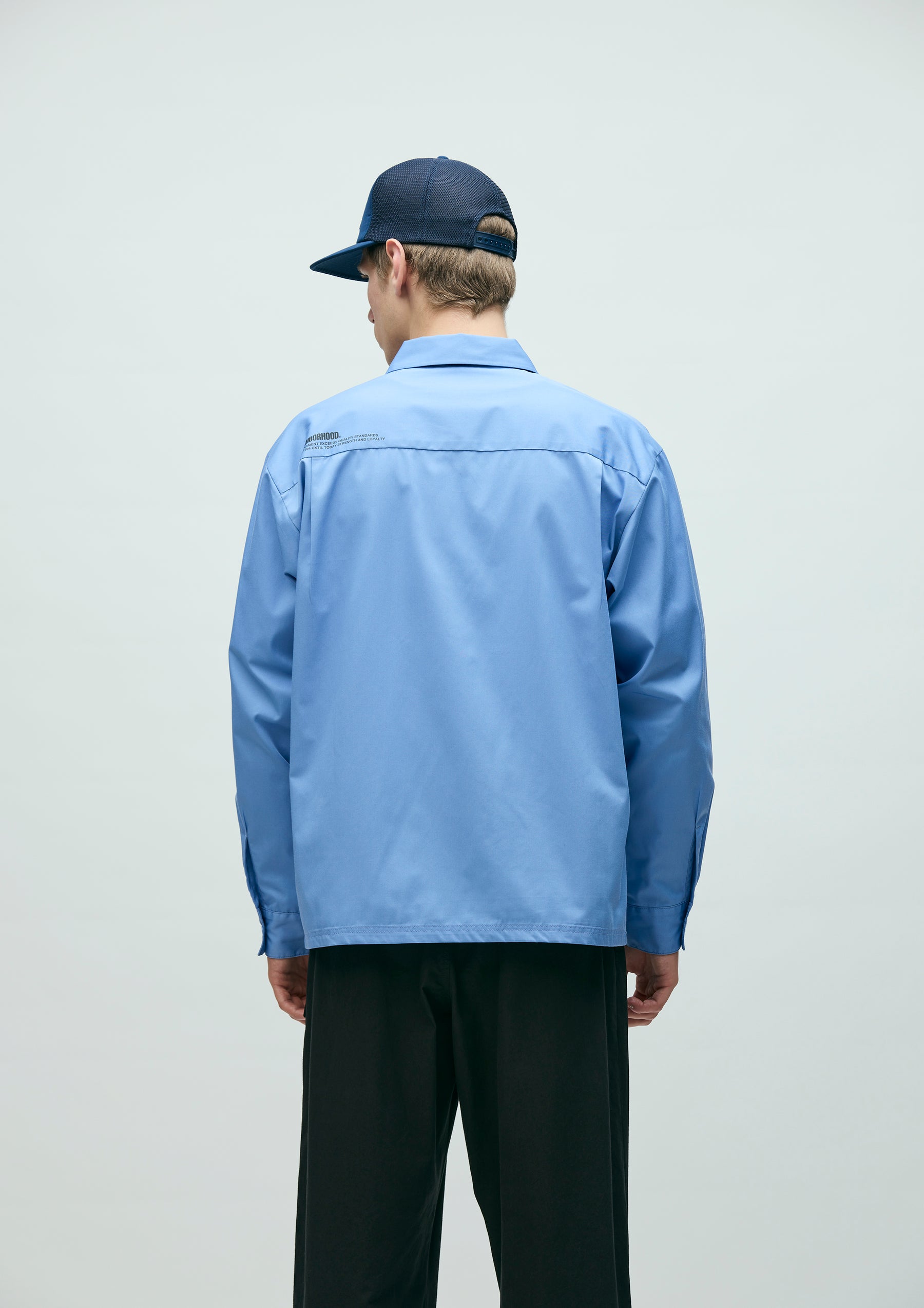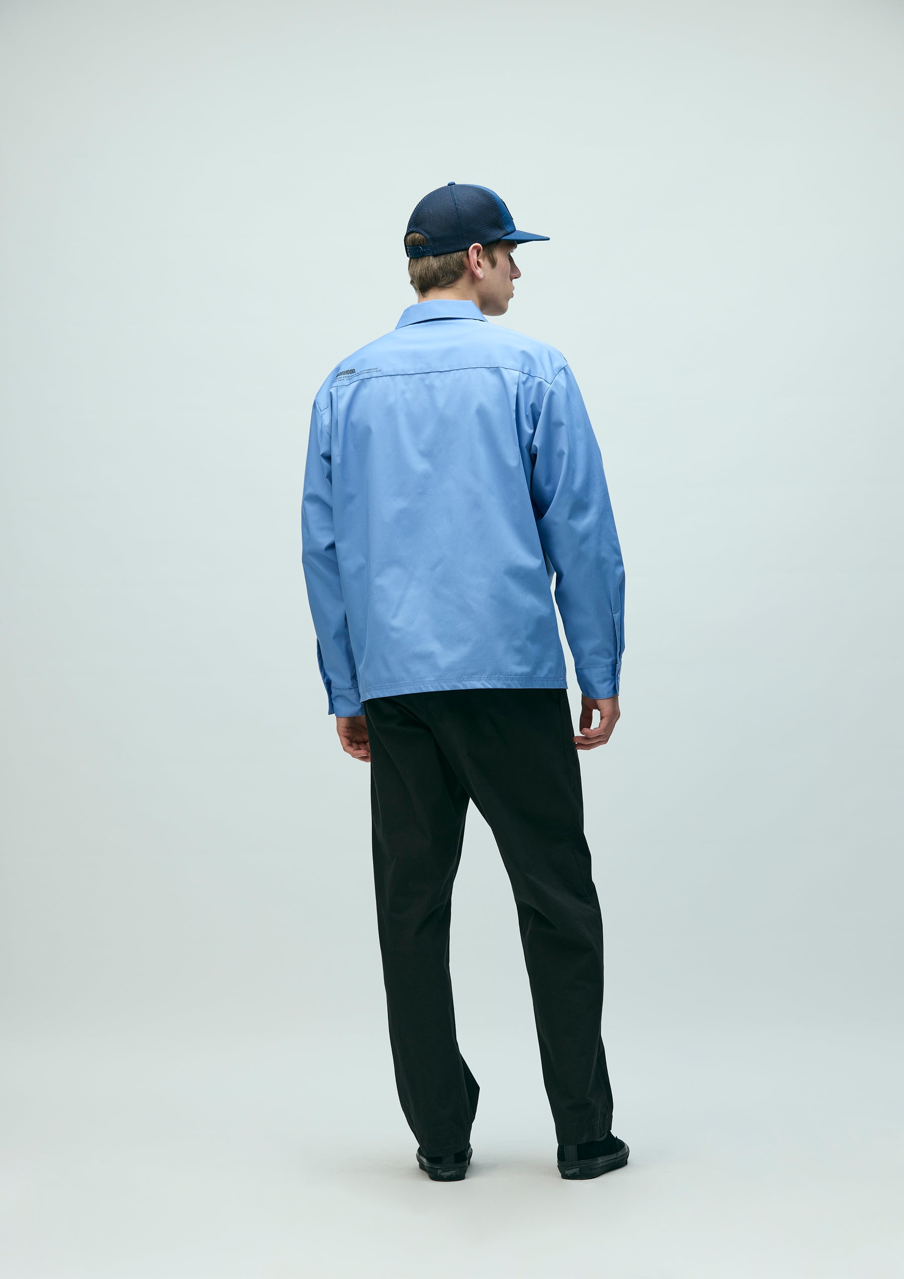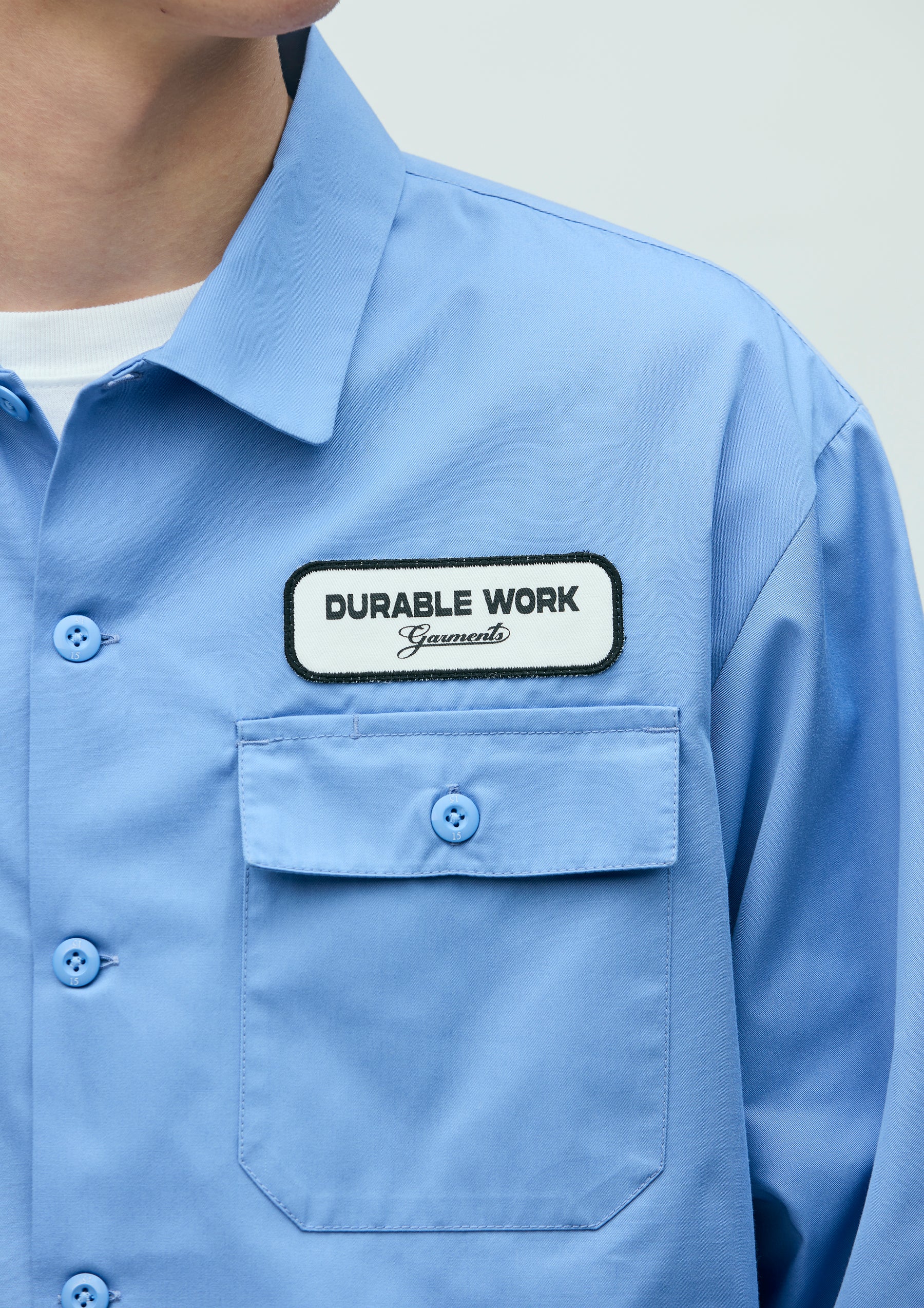 Work shirt made from medium-weight twill fabric using recycled polyester derived from PET bottles and textile waste. Features a supple yet structured texture, with strong resistance to wrinkles and shrinkage. Designed with flap chest pockets including a pen holder, a logo patch on the left chest, and a printed logo on the back. A brand tag is placed at the left hem and inside the front placket, with a woven side label at the side seam. Completed with a one-wash finish.
