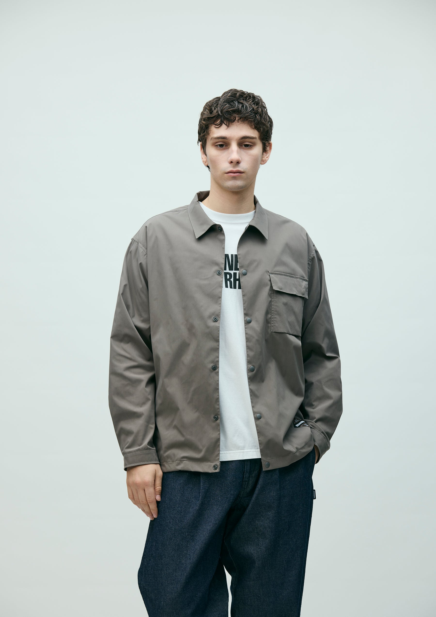 Multi-functional shirt made from recycled polyester with a cotton-like texture, featuring easy-care (wrinkle resistance), UV protection, and moisture-wicking quick-dry properties. Designed with a zip pocket integrated into the side seam and an adjustable elastic drawcord at the hem. The chest pocket uses a bag-shaped "convenience pocket" construction that prevents humidity buildup. A logo is printed on the back. A brand tag is placed at the left hem, and a woven side label is attached at the side seam.